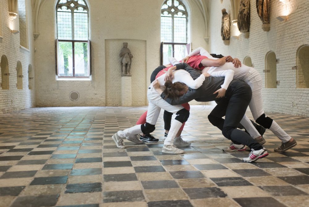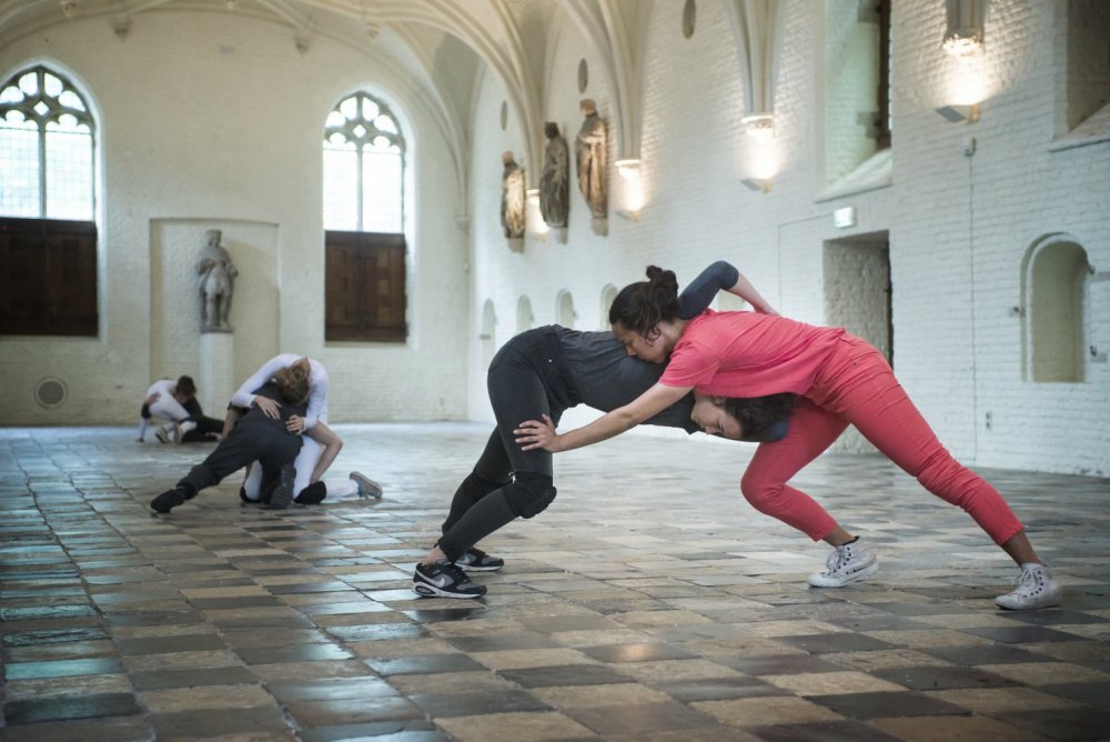 As a result of Spooner’s fascination with this idea of “deploying affect” as a productive tool within the workplace –whether it’s in pop music, or a start-up, or method acting, or even Andrea Fraser’s embodied institutional critique in the ‘Official Welcome’ (2008) video featured in Violent Incident –she winds up perpetuating it. Gortzak emails me a fourteen-minute video documenting the earlier dances at the Vleeshal Markt, where six people embrace, push and pull against each other’s bodies in an act that is both intimate and supremely violent. Personal space is disregarded and tone confounds content as performers sneeringly shout out each other’s names, along with things like “Have a great weekend!” They’re in a slowly moving scrum of bodies that are repelled and propped up by each other; oppositional forces creating a precarious, and short-lived sort of balance. “You feel the struggle yourself, standing in the space, more so than when you’re watching it on the screen”, Roos tells me, next to Spooner at the Middelburg hotel, about these labouring bodies in a choreographed performance that appears spontaneous but is in fact highly structured.