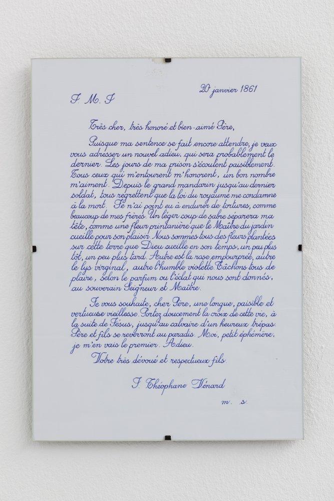 A “fucking cunt!” plays on loop from Nauman’s ‘Violent Incident’ (a video of two actors hired to mechanically hit each other over what looks like an intimate dinner) in one room of the Violent Incident exhibition. Gil Leung’s audio of an a capella of The Beach Boys’ ‘Don’t Worry Baby’ refrain competes in another. Fraser’s ‘Official Welcome’ is in the corner of one room. Rosa Aiello’s ‘Serving’ (2015) video –revealing the editorial tropes, devices and cuts, the invisible mechanics, of persuasion in cinema –is in a corner of the next one. Both videos have its viewer facing the wall, back towards the rest of the room and listening to the audio through headphones. The experience is intimate and it’s embodied. Jef Geys’ ‘ABC Ecole de Paris, 1959-1961’, ink crayon and coloured pencil on paper illustrations, hang across from Danh Vo’s as yet untitled Budweiser beer box with a pattern consisting of a repeated “Your mother sucks cocks in hell” printed in red Gothic font. His 19th century death letter, written in French and copied rote by the artist’s Vietnamese father is on the wall above it. In another room Bernadette Corporation’s ‘Oh snizzap!!!’ (2010) luxury bathroom fixture, inspired by a surprise series of naked Rihanna selfies and engraved with social media responses, is in the centre of the last room on a pedestal.