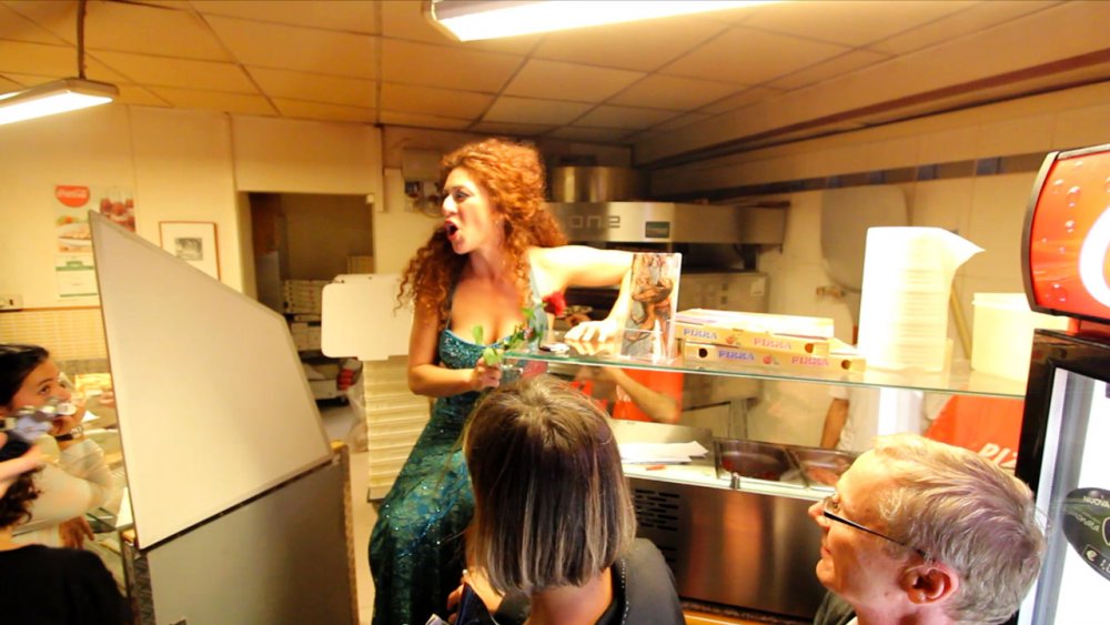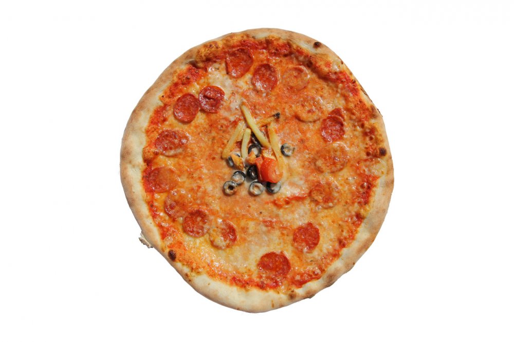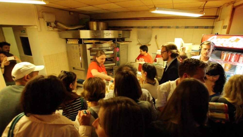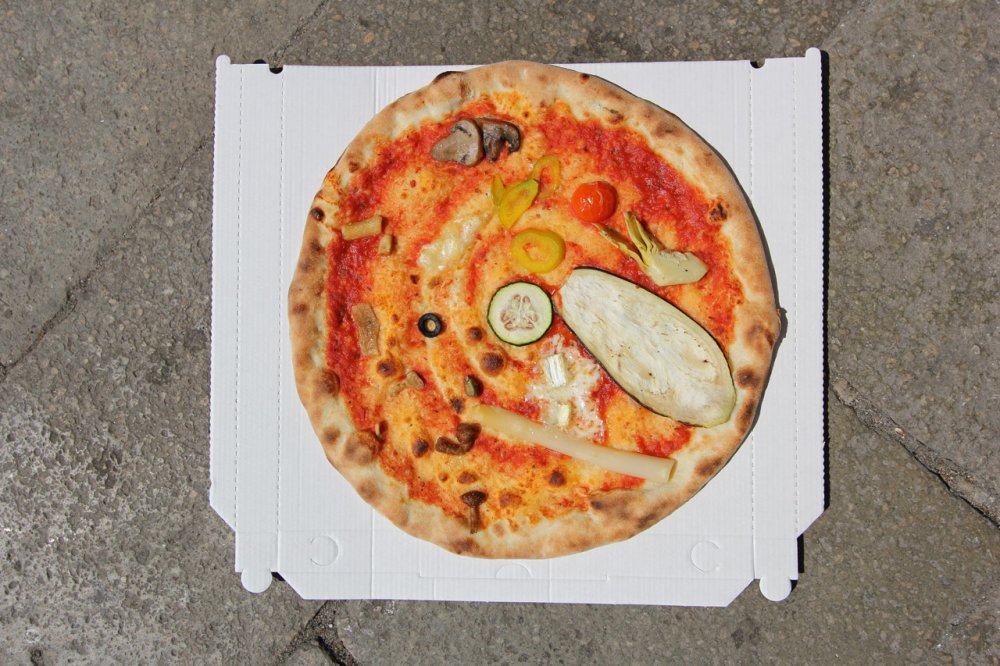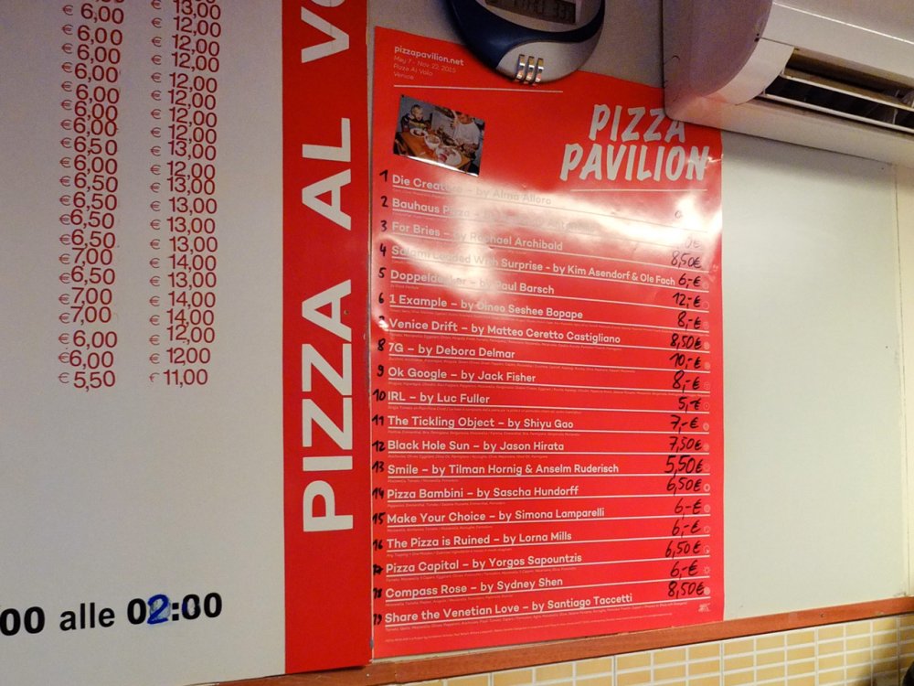 Participating in the piece are 19 different artists of the “post-digital” generation, invited to compose and title their own personal pizzas for a ‘Pizza Pavilion’ menu to be made available alongside the pizzeria’s regular one, including Santiago Taccetti, Lorna Mills, Alma Alloro and Tilman Hornig. The presence of the artist-produced pizzas, available for order, thereby turn the Italian pizzeria into an “art production studio and gallery, where one can witness the creation of an contemporary “artwork” and can buy and consume it directly”.