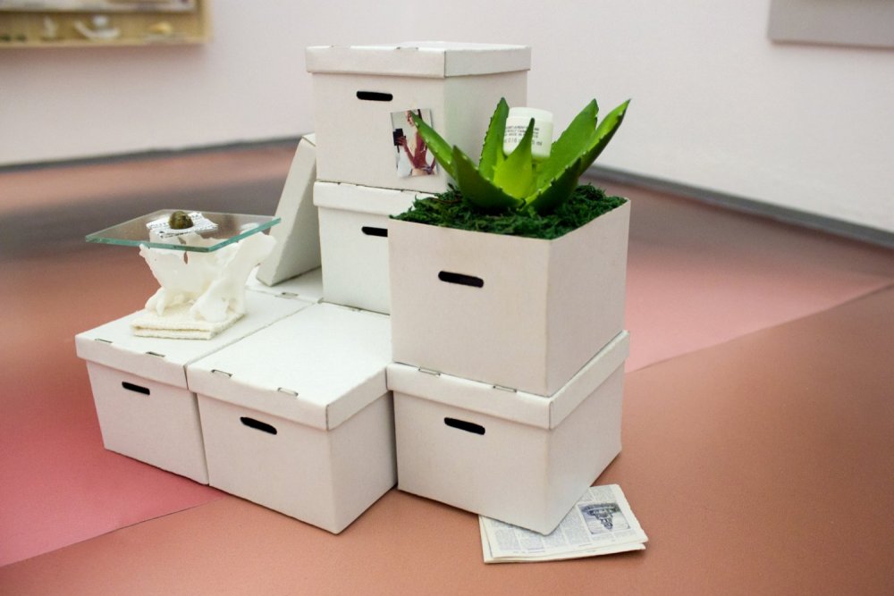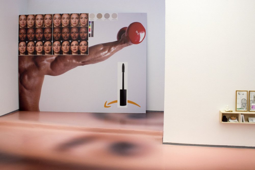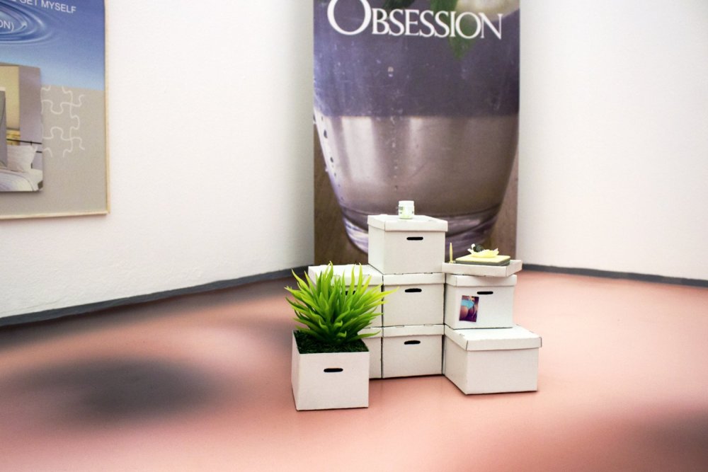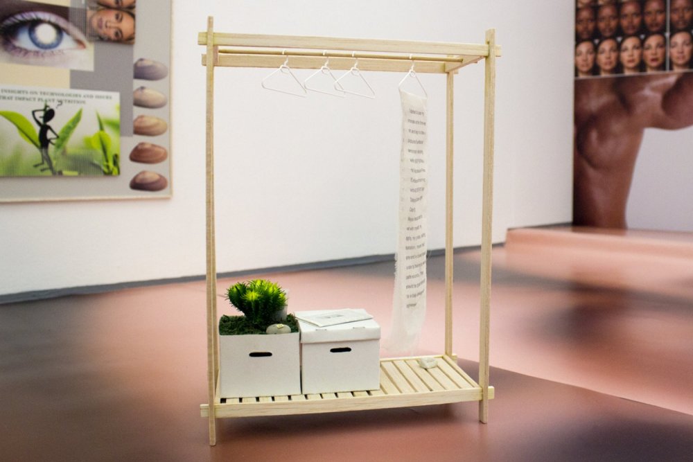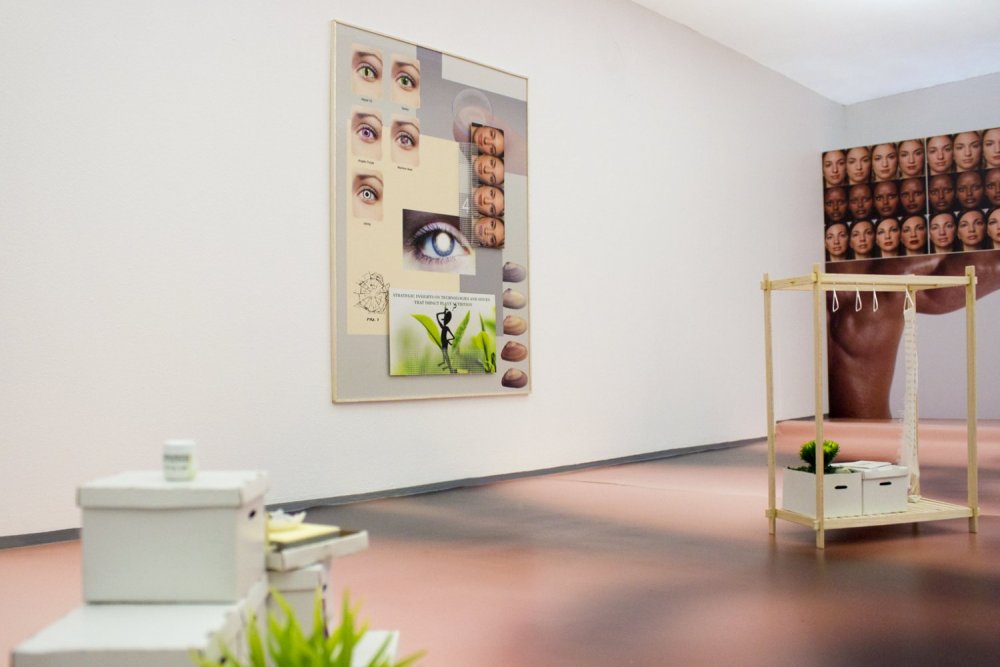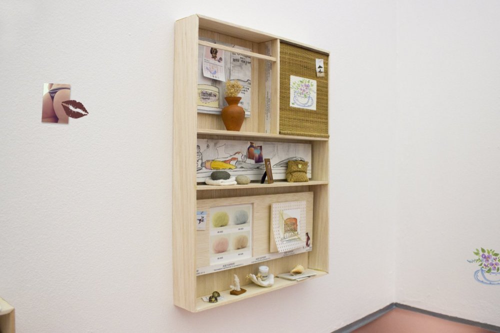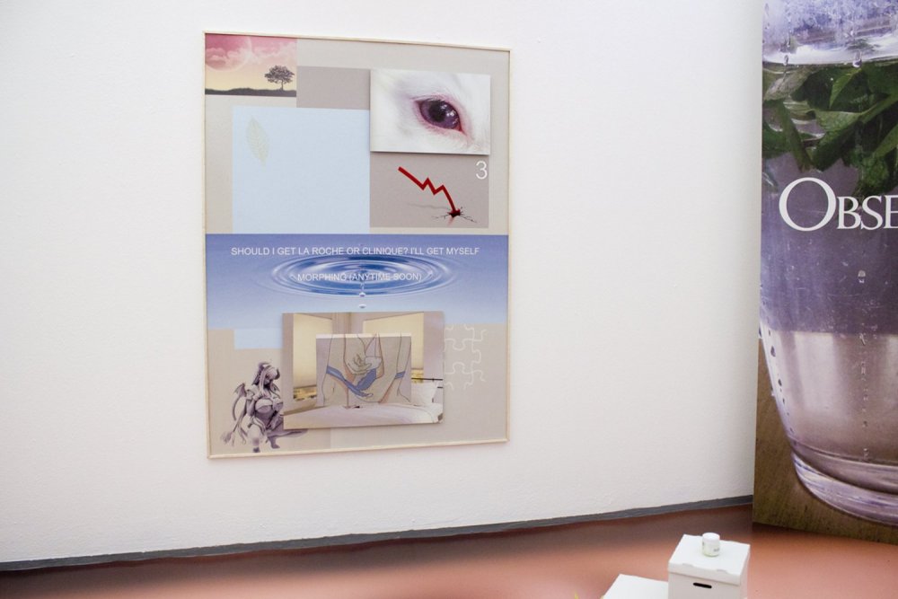 Using a standard HD advertising aesthetic that typically targets white cis women, Patricio’s installation is reminiscent of a Clinique counter in a department store or a plastic surgery office in the western world. The installation consists of digital and sculptural collages such as ‘Proxy-Partilism and its DSM-IV Body Focus’ (2015) and ‘Pheno-Bestiality and Cross-Species Sexual Activity’ (2015). Both are large digital prints on cardboard with other materials such as kapatex, wood, straw mat, plastic, screws, and dried flower. Two large banners – ‘Banner01: Betume’ (2015) and ‘Banner02: Re Tox’ (2015) – hang beside a third digital print called ‘Infantilism Assemblage or Fantasies of a Return to Infancy’ (2015). Various other sculptural objects occupy the installation’s centrepiece, ‘Compound 02 (parieta/ occipital)’ (2015), consisting of a pile of cardboard boxes filled with fake moss, plants, sea snail shells, and other digital prints. There are wooden cabinets like ‘Module F2M’ (2015), filled with 3D printed sculptures, drawings, and books that hangs on a wall.
