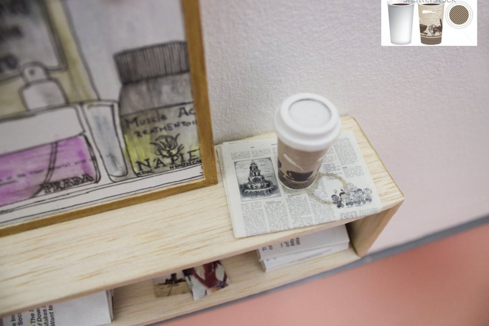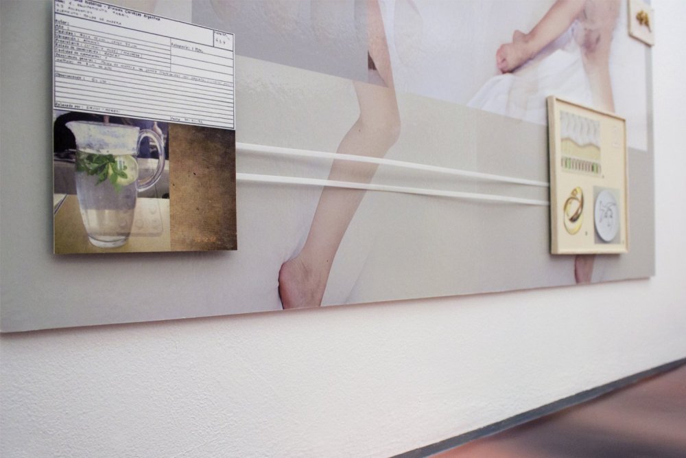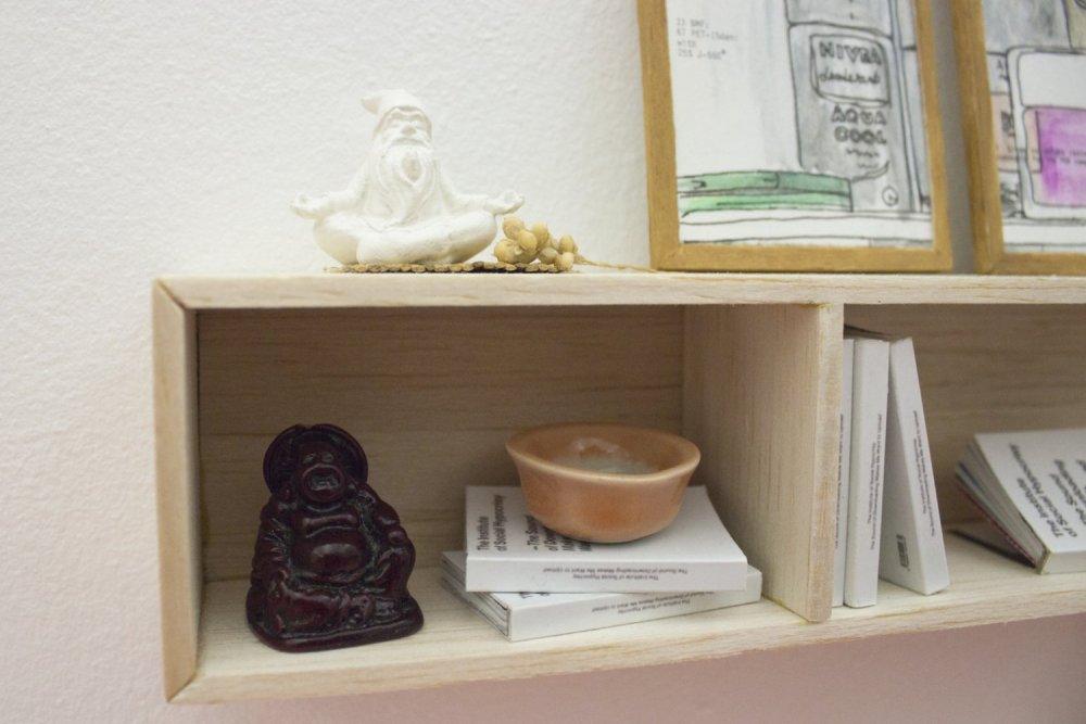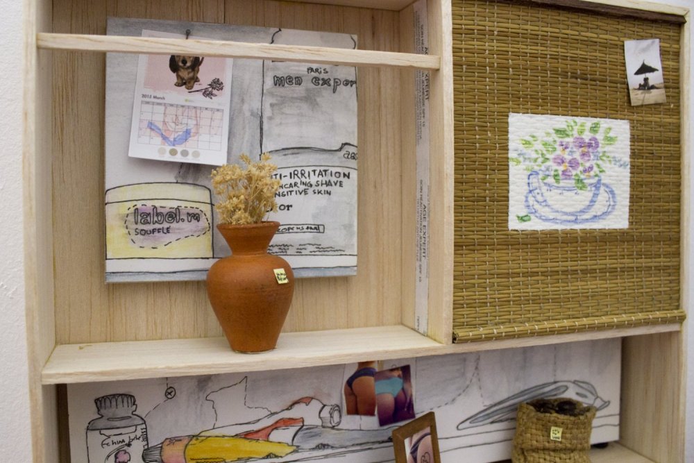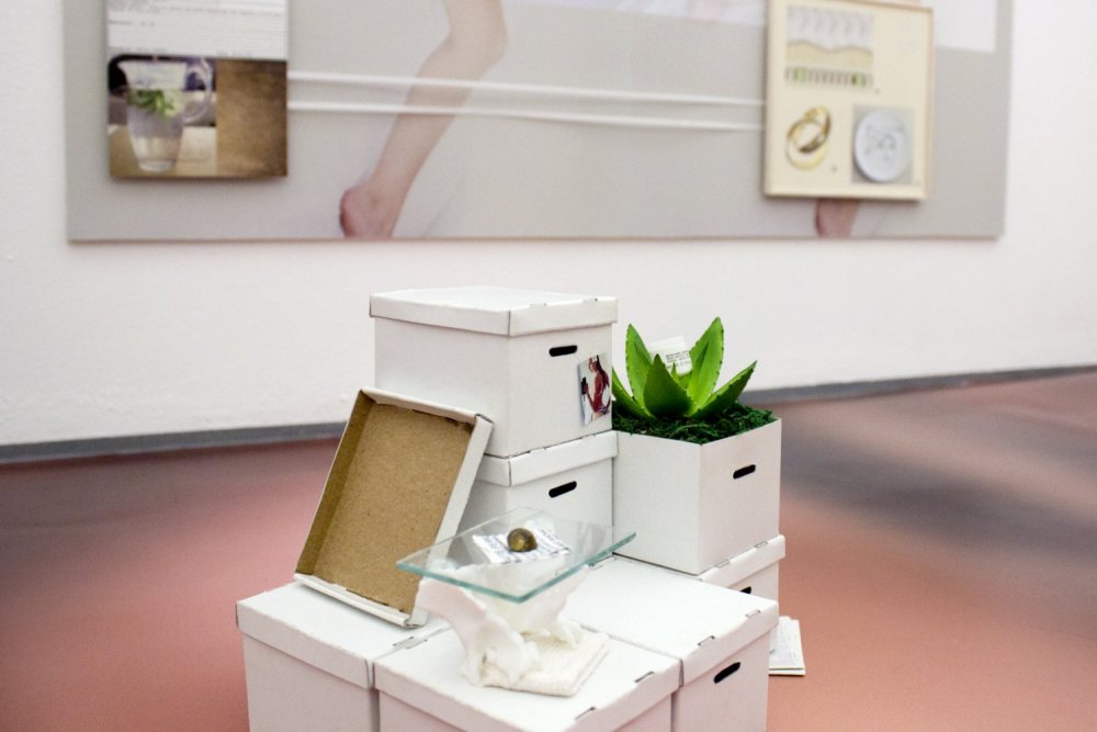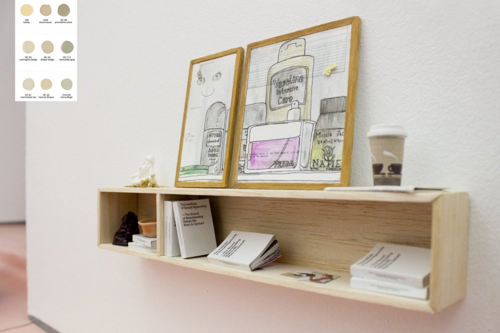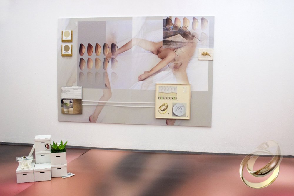 Using a standard HD advertising aesthetic that typically targets white cis women, Patricio’s installation is reminiscent of a Clinique counter in a department store or a plastic surgery office in the western world. The installation consists of digital and sculptural collages such as ‘Proxy-Partilism and its DSM-IV Body Focus’ (2015) and ‘Pheno-Bestiality and Cross-Species Sexual Activity’ (2015). Both are large digital prints on cardboard with other materials such as kapatex, wood, straw mat, plastic, screws, and dried flower. Two large banners – ‘Banner01: Betume’ (2015) and ‘Banner02: Re Tox’ (2015) – hang beside a third digital print called ‘Infantilism Assemblage or Fantasies of a Return to Infancy’ (2015). Various other sculptural objects occupy the installation’s centrepiece, ‘Compound 02 (parieta/ occipital)’ (2015), consisting of a pile of cardboard boxes filled with fake moss, plants, sea snail shells, and other digital prints. There are wooden cabinets like ‘Module F2M’ (2015), filled with 3D printed sculptures, drawings, and books that hangs on a wall.