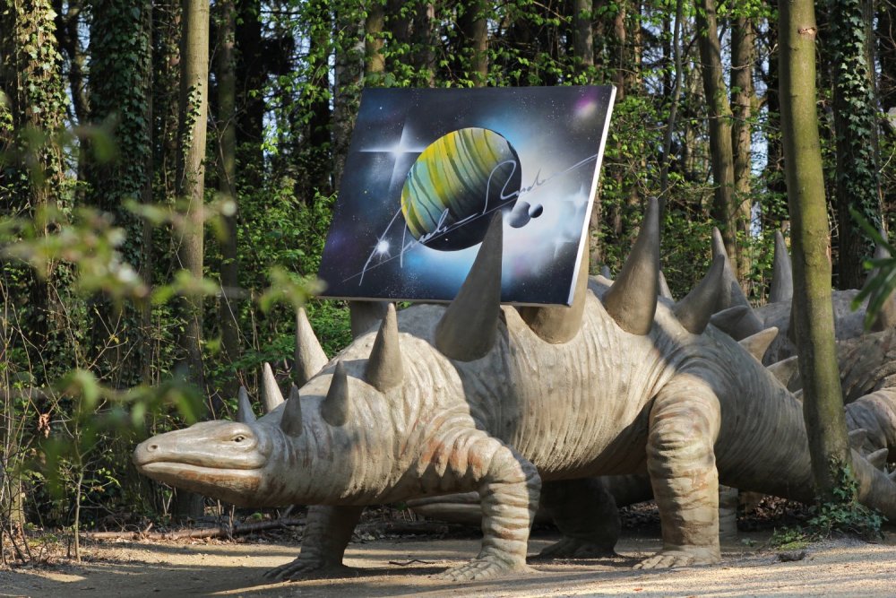 New Scenario, founded by artists Paul Barsch and Tilman Hornig in late 2014, is a dynamic platform for conceptual, time-based and performative exhibition formats “that happen outside the real of the white cube”. With Jurassic Paint, Barsch and Hornig invite the participants to combine painting as a “creative act of the imagination” with the construction of the dinosaurs, whose likeness “emerges from fanciful and narrative processes of the human and scientific mind”. The canvas works and the dinosaurs share, as the exhibition’s press release identifies, the same ‘Lebensraum’ or living space, creating a new scenario.