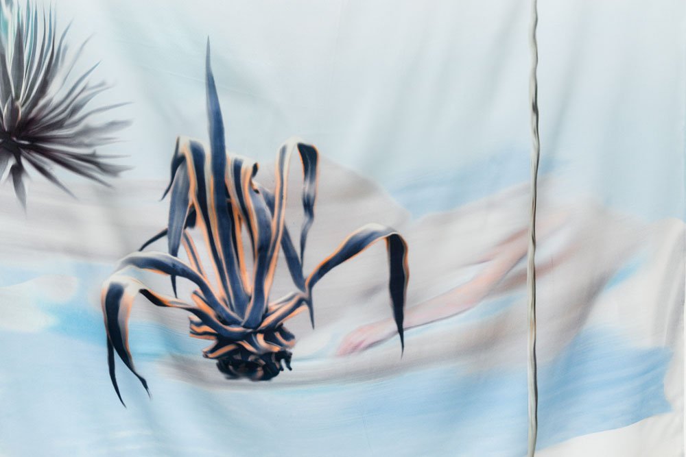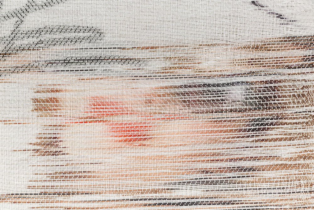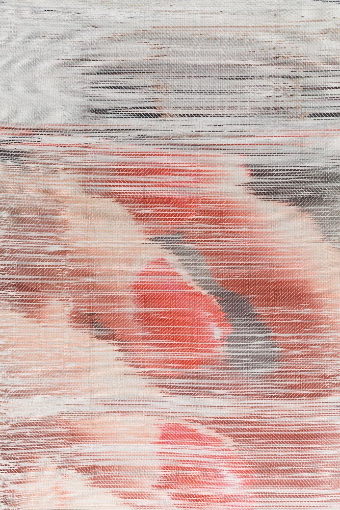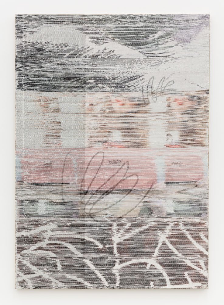 Steciw’s heavily gestural C-print, dibond, and wood framed sculptures exist on the wall as seen in ‘Composition 028e’ (2015) and as a free-standing wheeled piece entitled ‘Composition 028aaa’ (2015), asking the viewer to look at, around and through the multi-layered works. Utilizing run-of-the-mill stock photographs, she composes digital collages of different images of the same thing but then abstracts them to the point of unfamiliarity. This re-mixing of banal internet imagery is similarly explored by Wolowiec in her complex textile pieces. Using readily available Instagram content, which she gathers from the geotag feature of the image-sharing app, she digitally distorts the files into aesthetically pleasing composites that are then printed onto various fabrics which she ultimately hand-weaves together.