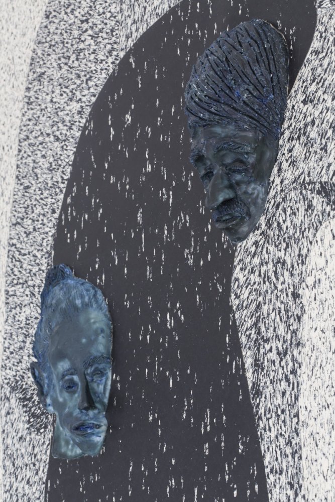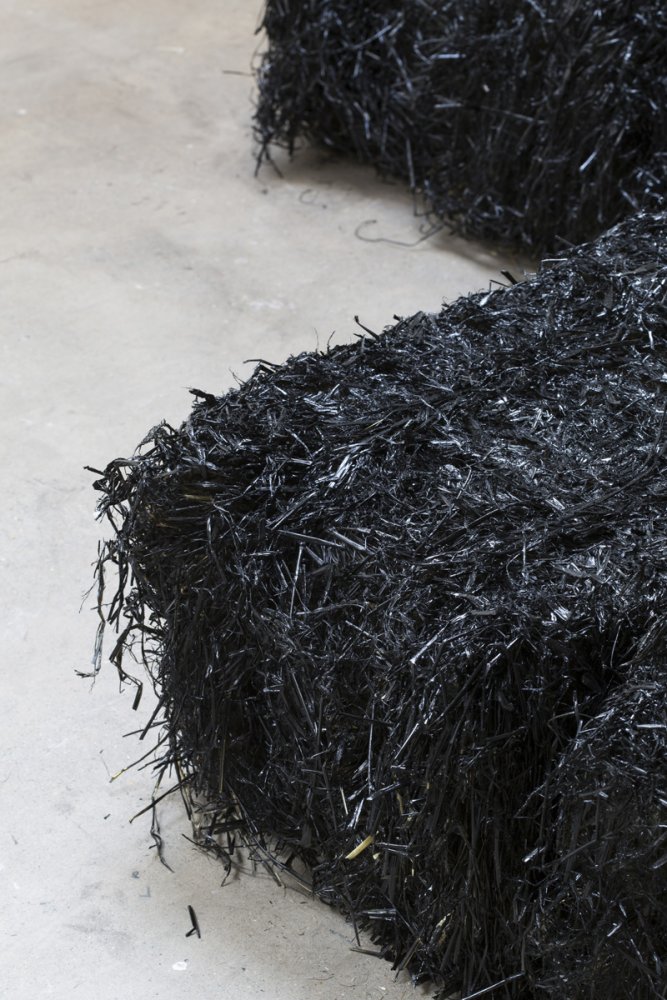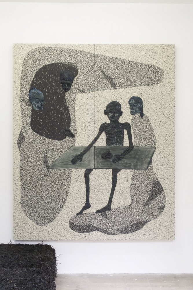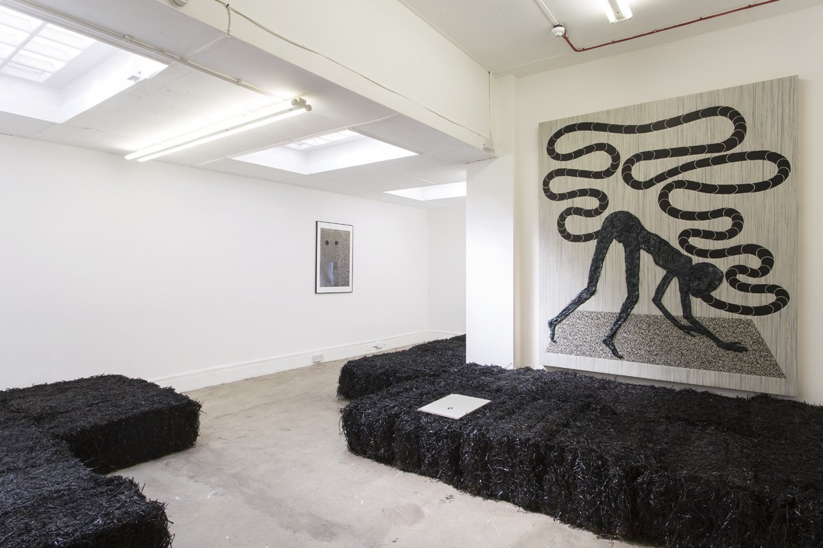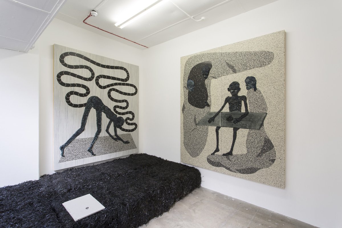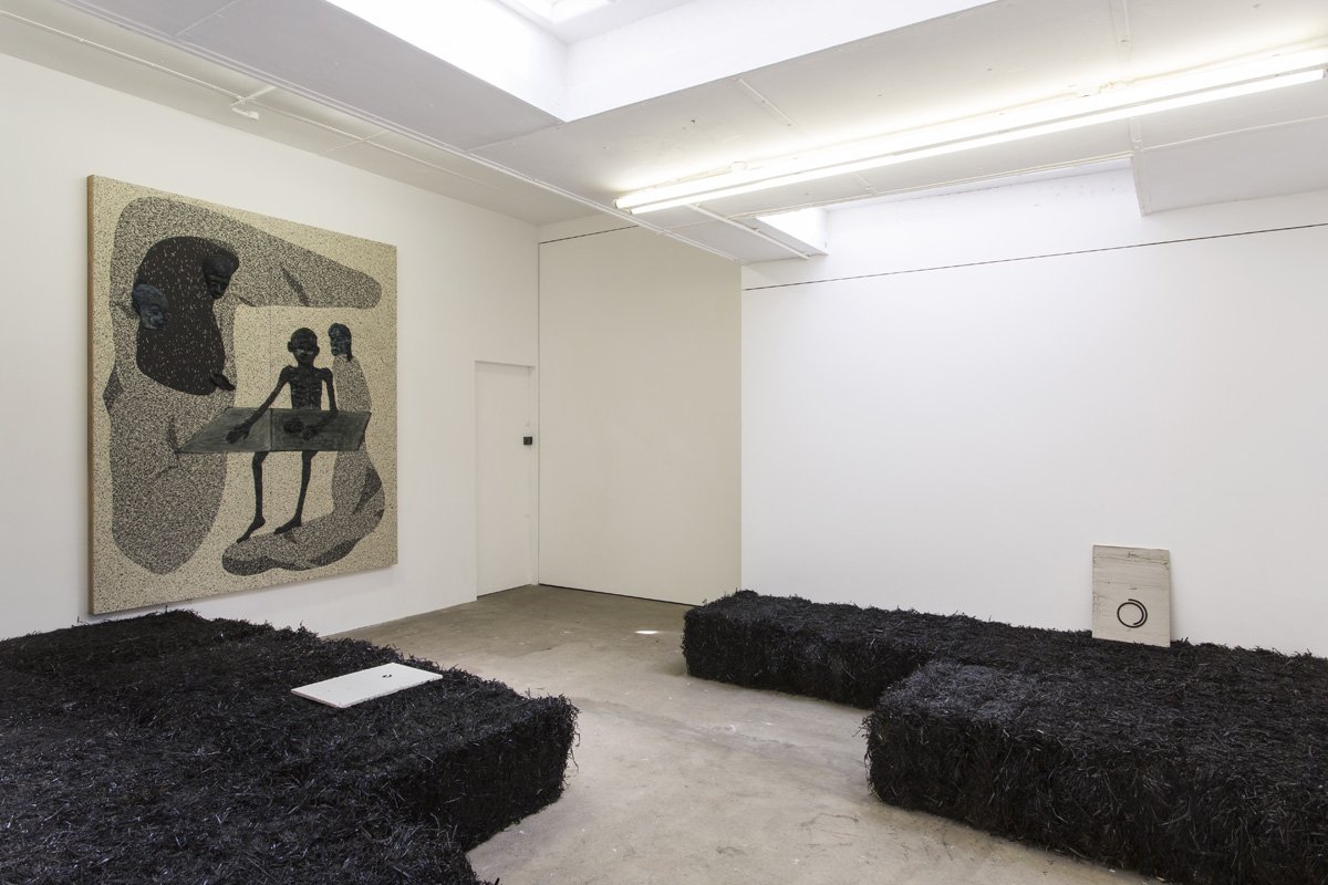 Belgium-based, Aline Bouvy made two new friezes or reliefs made from industrially produced linoleum cut up by the artist called ‘The Description Doesn’t Fit’ (2015). The reliefs are large and with people in them. Curiously they are descriptive in that you see something so illustrative (or figurative) as a person crawling with a swirly pipe leading all the way from their anus to their mouth over what could be grains, like the harvest Davenport’s tractor couldn’t harvest, although it is also just the raw material of the image’s surface. The other frieze by Bouvy sits close by and features a central figure, black with thick linoleum at a table – ribs protruding – and surrounded by ghost-versions of him/her self, whose bodies have been replaced by the same fainter material applied underneath the crawling figure. **