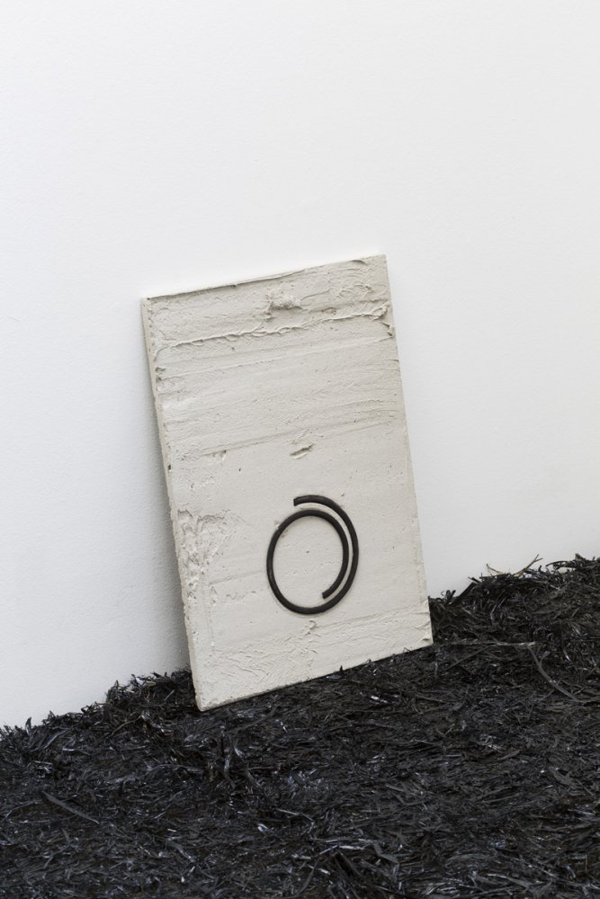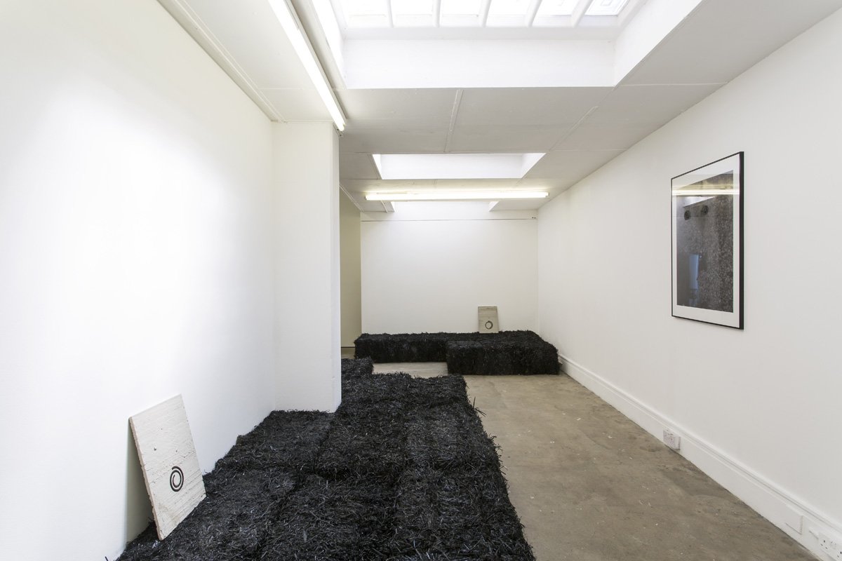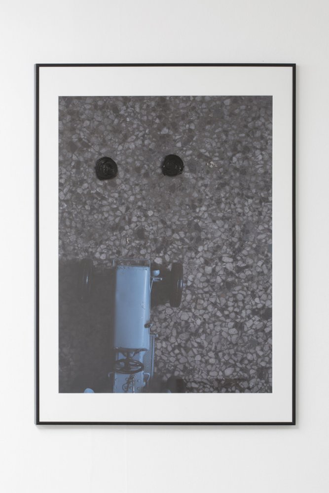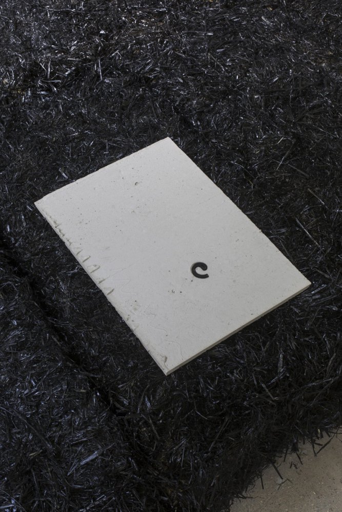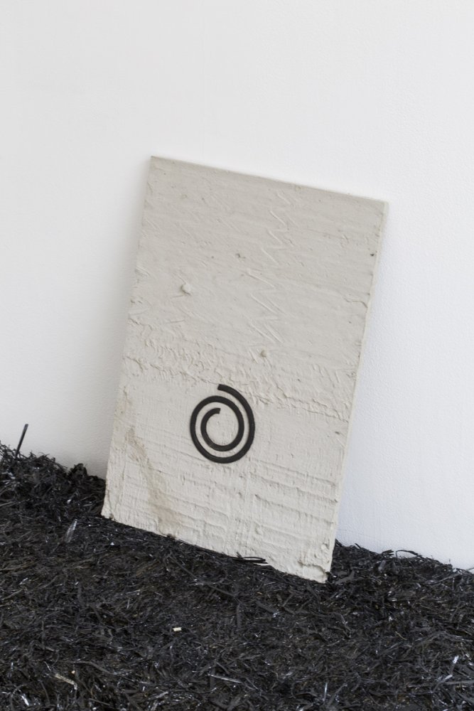 For New Palubub, Davenport made a small series of concrete slabs that have different shaped and sized swirly mosquito coils on their fronts. They (‘Tablets i – iii’) lie, unattached on black painted straw bales. An image of two black corn on the cobs also accompany a birds-eye-view photograph of a tractor, the scale of which is undeterminable, that is harvesting a surface – also undeterminable. It looks like the tractor is harvesting stones. On top of the photograph is painted two small black oil paint blobs or eyes, which makes the image smile. It fits that the tractor is the mouth.