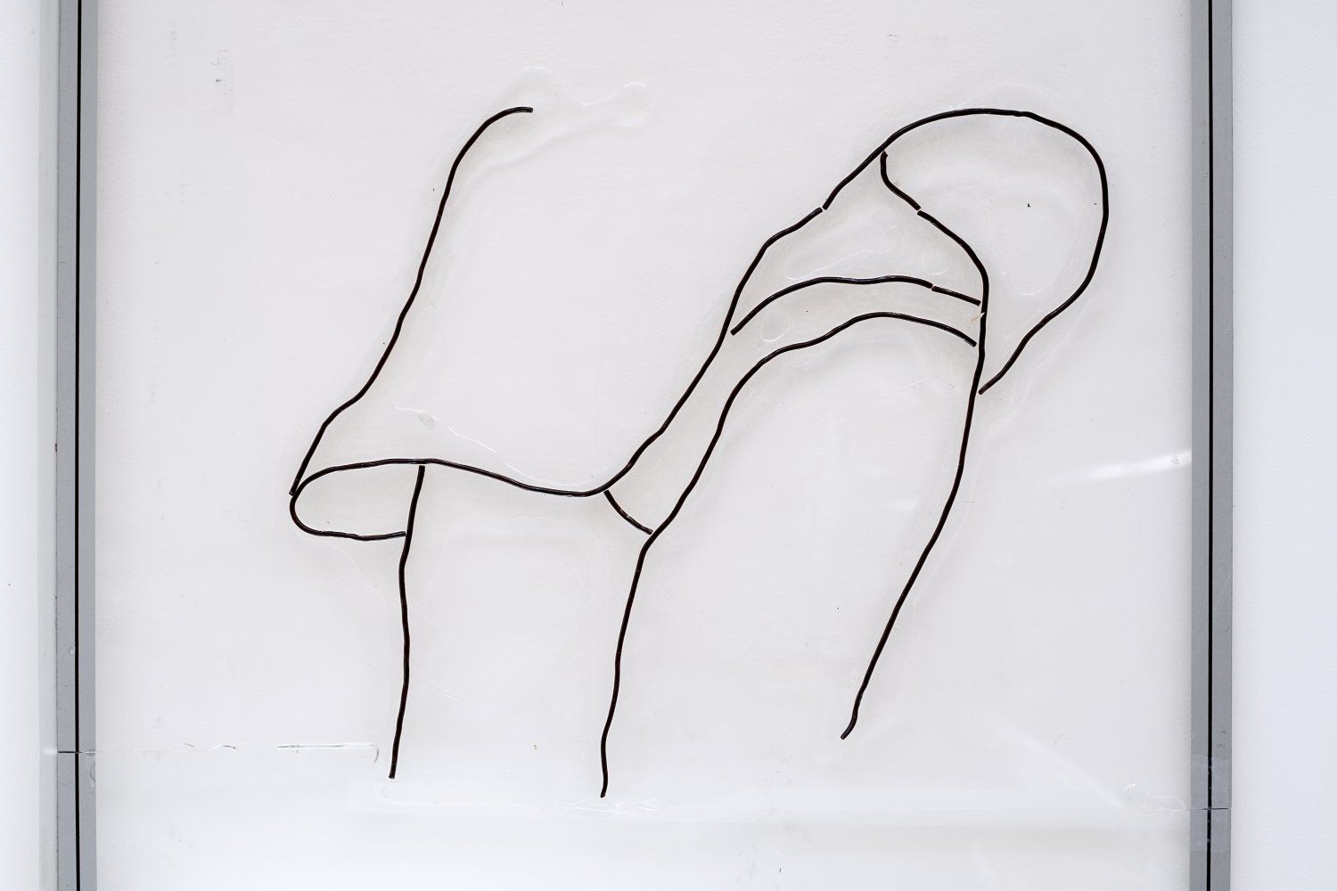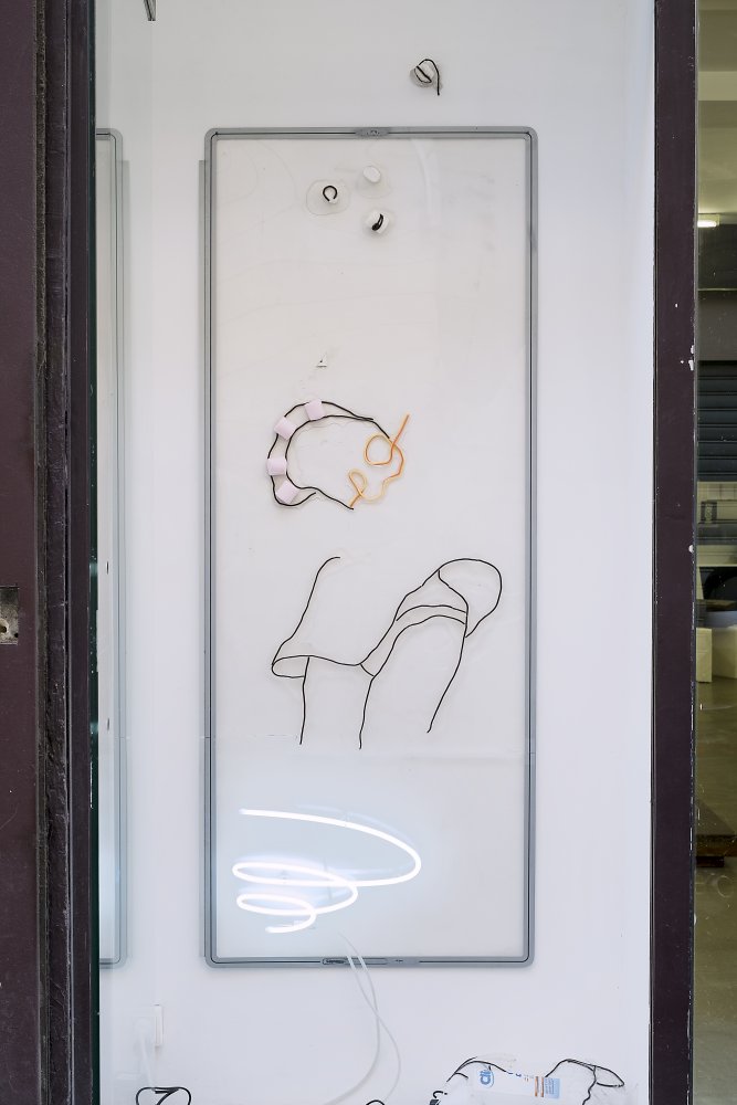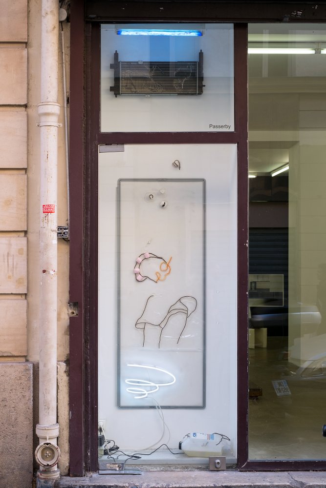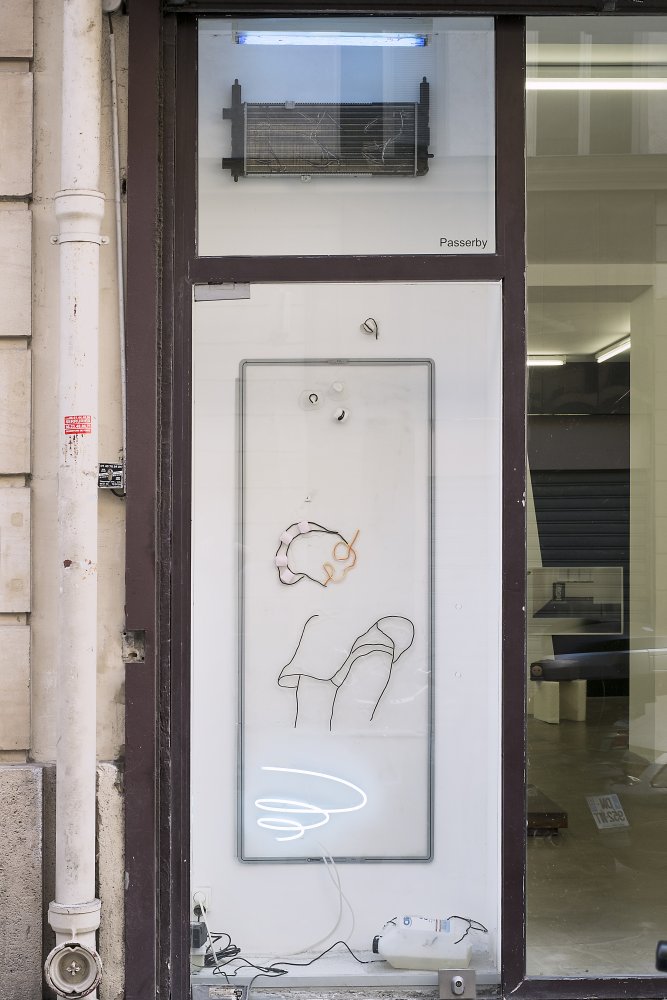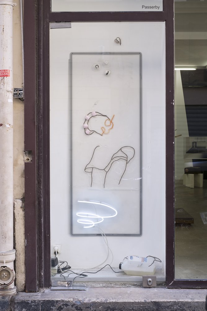 In the small ‘Passerby’ space in the front window of Paris’ Galerie Alain Gutharc, Bending Binding were invited to make a piece of work by curatorial group Exo Exo. Between September 7 and September 25 Loop of Faith was there. A portrait and display of visibility and/or visuality, a figure looms and leans over with pink marshmallows for hair curlers. Under what looks like liquorice lace for a head, there’s a hair outline, as well as skirt that is blowing up in the non-existent window wind.