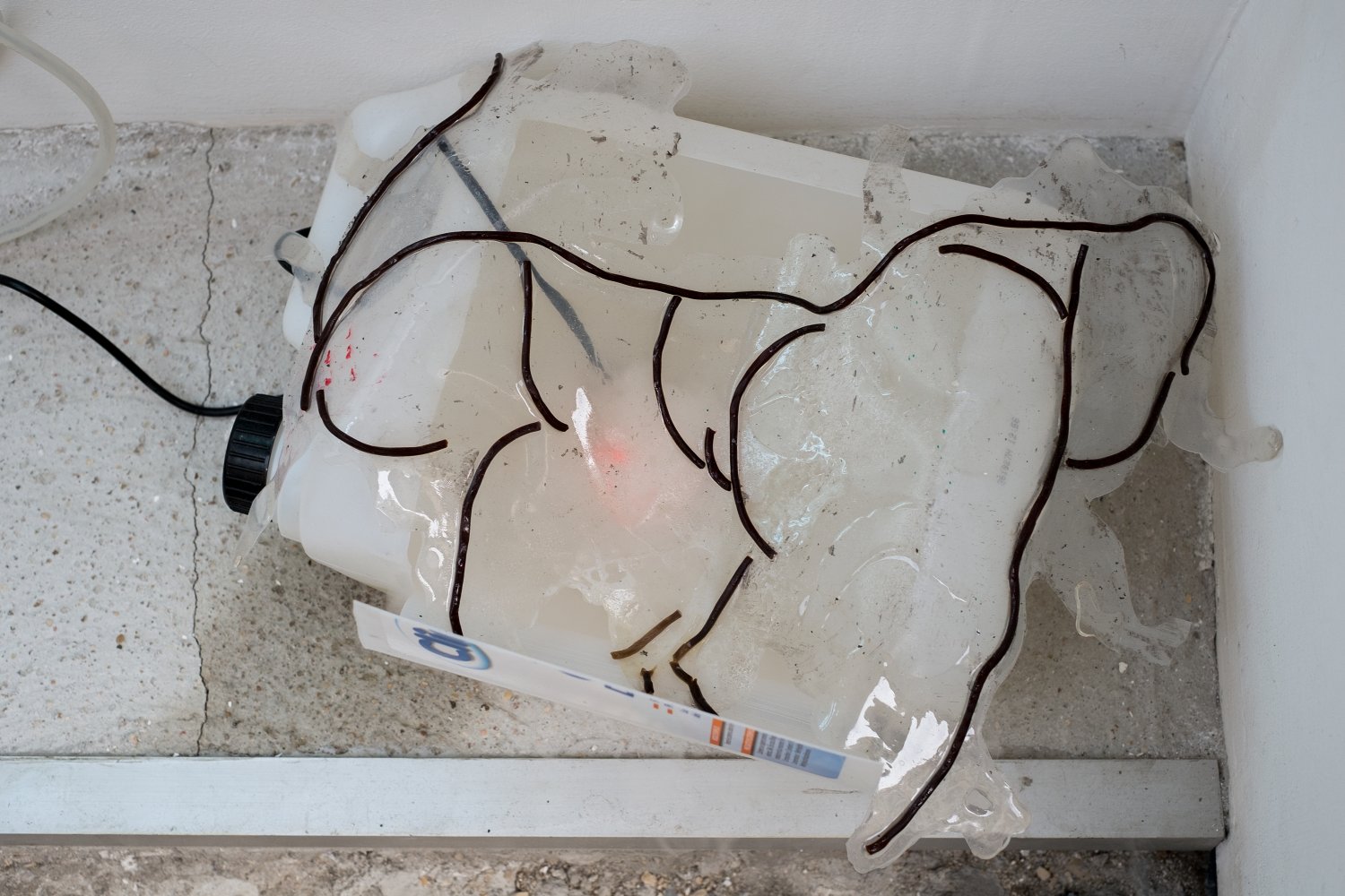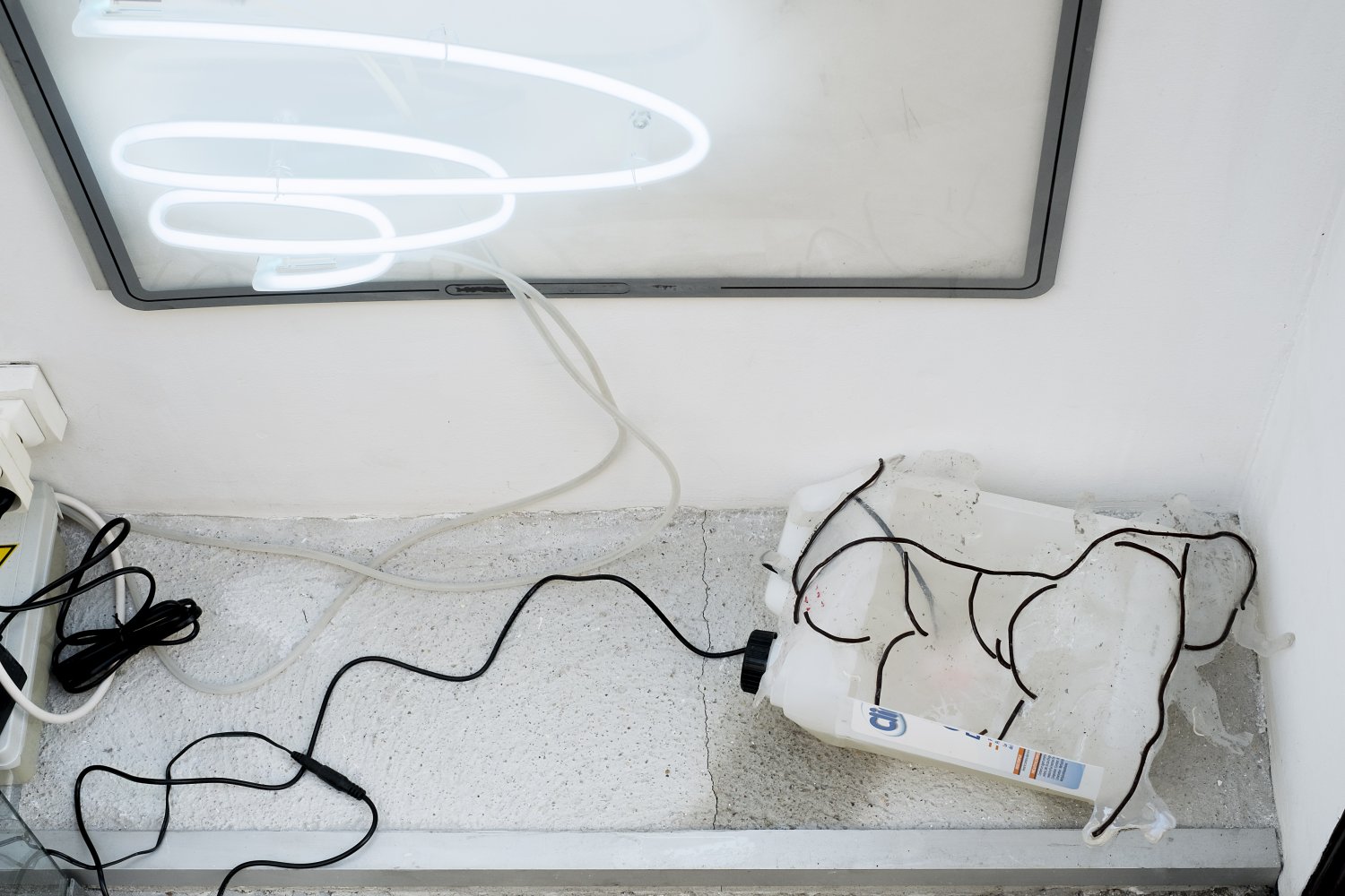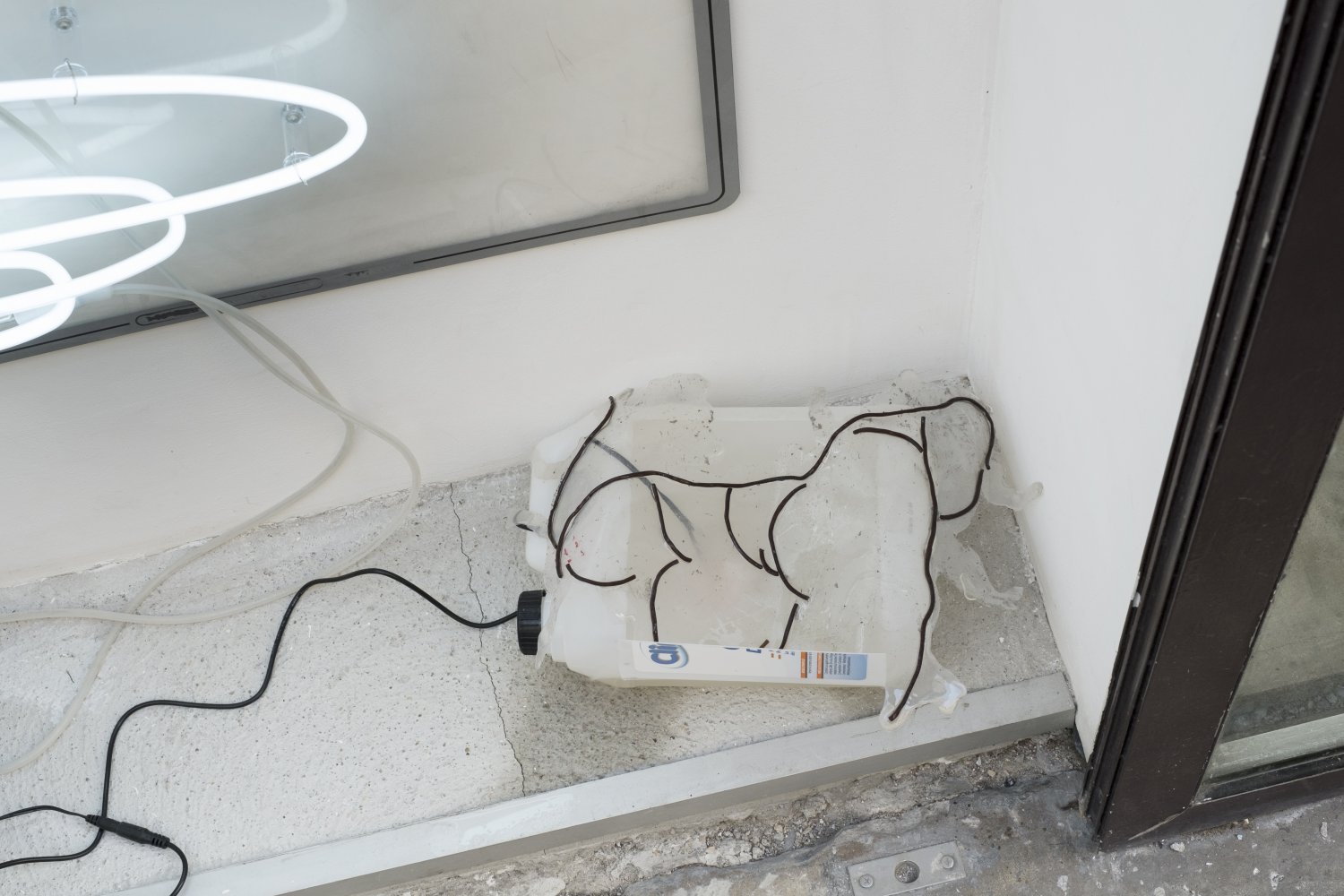 At the bottom of the diorama is a half-filled carton of dirty water, an ultrasonic fog generator, which seems plugged into the lower tip of the tornado. At the top of the Passerby space is an air conditioning condenser, a physical object and motif that Bending Binding have worked with before. It has been scratched in to, drawn on to, using marks that go against the horizontal grain of the condenser. It feels strange, like, despite this being drawn on and defaced the physical behind of the object is enough that it still can be there. It still can be used to catch all the water possible in the air of the the small 98cm x 290cm x 34cm display space and turn it back into water that is distributed (or just there) around the pockets of the person created by the liquorice lines.