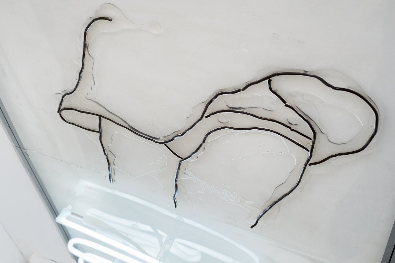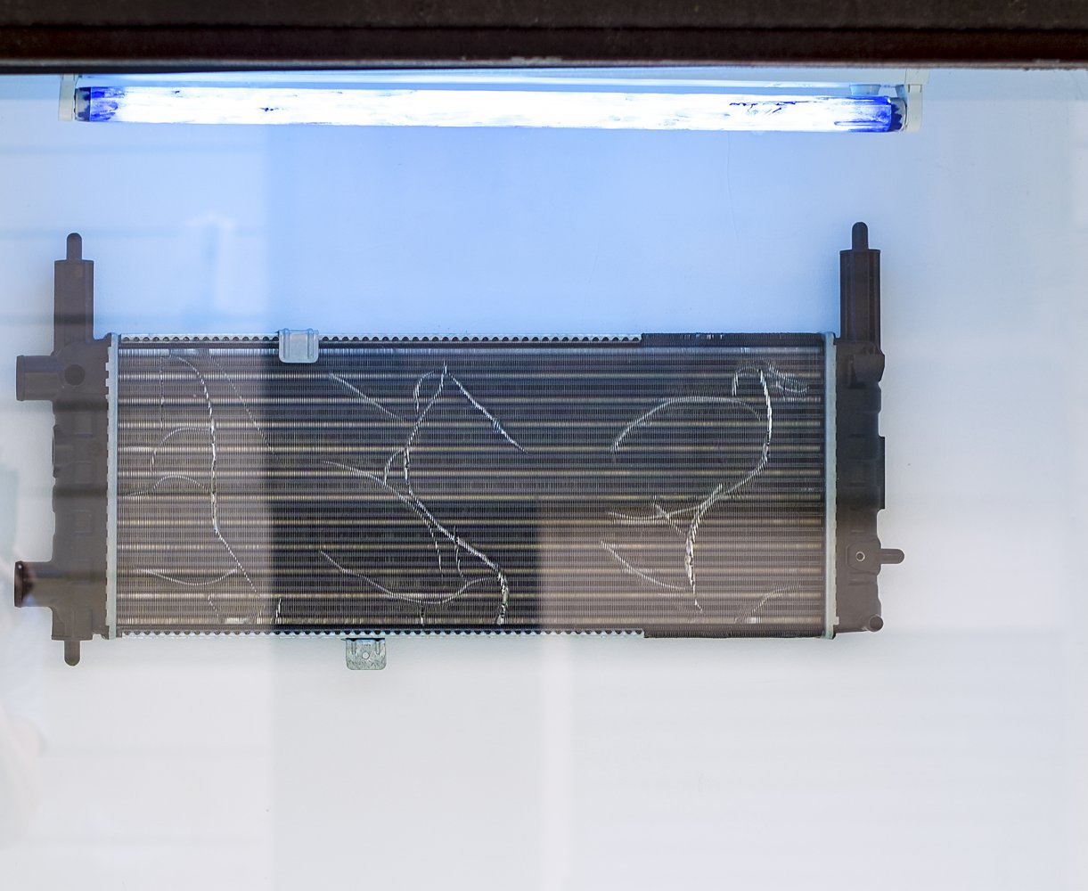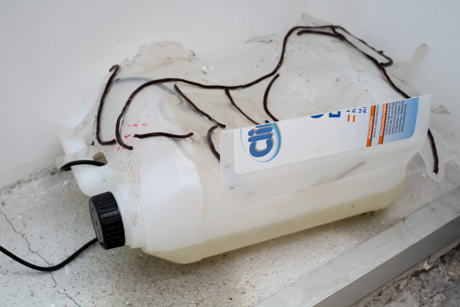 At the bottom of the diorama is a half-filled carton of dirty water, an ultrasonic fog generator, which seems plugged into the lower tip of the tornado. At the top of the Passerby space is an air conditioning condenser, a physical object and motif that Bending Binding have worked with before. It has been scratched in to, drawn on to, using marks that go against the horizontal grain of the condenser. It feels strange, like, despite this being drawn on and defaced the physical behind of the object is enough that it still can be there. It still can be used to catch all the water possible in the air of the the small 98cm x 290cm x 34cm display space and turn it back into water that is distributed (or just there) around the pockets of the person created by the liquorice lines.