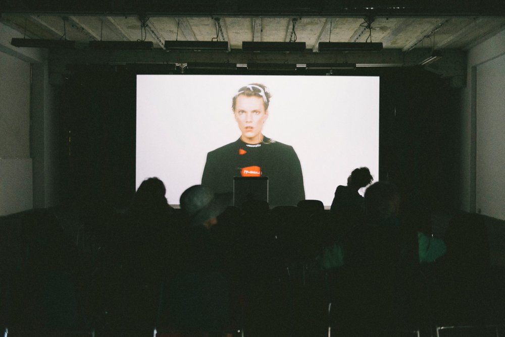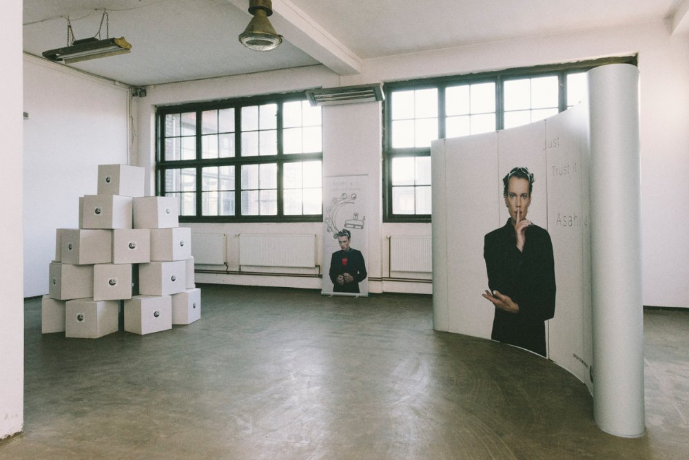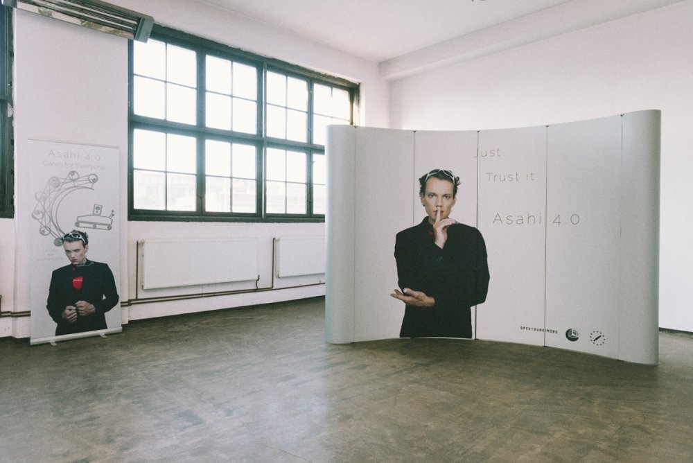 ‘The Universal Blob‘ is screened in a small room with red cushions. In another room there are various stations. One is a grey plinth with a small robot on top that looks like it might have an eye, or at least a head. Behind the robot is the first time we see the repeat pattern of ‘Asahi’’s brand, or image, printed on a display board. The image is a black, grey and white diagram of the core of the earth with a grey wifi rainbow coming out of it at a right-angled corner. It’s everywhere in the works curated by the robot and it also accompanies the light font that says ‘Asahi 4.0 is coming’ in a promise-image on a screen mounted on the wall. Then there is a person walking holding cards with the brand-image on it, being photographed, holding also a glass of white wine.