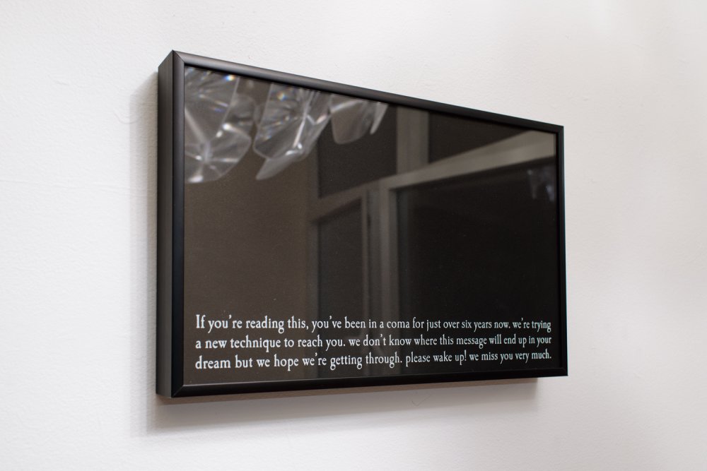 When I raise my eyes to the wall on my left, I see a small black frame holding a glossy black square, with small white letters at the bottom. They read: “If you’re reading this, you’ve been in a coma for just over six years now. we’re trying a new technique to reach you. we don’t know where this message will end up in your dream but we hope we’re getting through. please wake up! we miss you very much.” This is ‘pervert’s lament’ (2015) by Joseph Buckley. Oddly titled but entrancing, this piece plays counterpoint to Beckwith’s ‘rosie path…’. Where that one leads to a subtle deepening of my sense of embodiment through the search for meaning, ‘pervert’s lament’ absorbs me by causing a moment of hyper-awareness and reflexivity about the divisibility of consciousness and physical reality. Looking up from the words’ invitation to dream in a coma, I see a disembodied faceless head, and realize it’s my head, its features obscured in the blank black surface. By peering at the words in the frame I become part of the art, absorbed literally in its frame, figural and literal, a kind of allegory of a mind lost, enacting the text itself. I step back into the world around me as if stumbling from a trance.