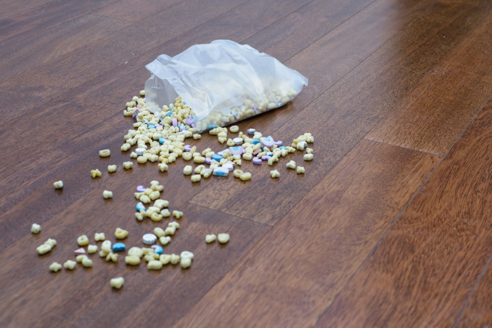 Walking across the bare wood floor to peer at the blackened windows I nearly stumble over Beckwith’s second piece, ‘Spelt’ (2015). What appears to be a pile of Lucky Charms half spilled from a plastic bag lie on the floor, as if a hungry and lazy toddler had given up its snack in boredom. Amused and curious, I once again find myself looking at the ground, this time to discover that the pieces are each handmade and don’t conform exactly to said cereal’s pattern, although the marshmallows look tasty. There are symbols I don’t recognize. Like the carpet, they suggest meanings but stop short of saying anything definite. My amusement mingles with fascination and admiration, for upon closer investigation I discover two things at the same time. First, I’m crouched almost on my knees, my body once again suborned in the task of decipherment, and second, the pieces of cereal, while still amusing, begin to suggest a syllabary of a language I didn’t know. Part nonsense, part child’s play, yet interpretation  all the way down.
