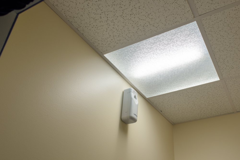 Whether by the alchemy of happy chance or Meyohas’ curatorial skills, the last piece I visit seems to contain in microcosm these nudges towards  transcendence in the world, not beyond it. A porcelain-tiled booth protruding from the kitchen wall is covered with a velvet curtain hanging on a shower rod. I step through it and enter Jonathan Mildenberg’s ‘Conversations’ (2015), which looks like a bathroom. It could be a shower or toilet stall, except the actual toilet and shower are missing. The tiles are on the outside, like an exoskeleton. The interior is painted a boring color, the kind you might expect if you bred a strip mall with the average commercial bathroom. A metal bar on the back wall greets my eyes, which then see a white towel folded up on the floor, a foot from a mirror on the right wall. The mirror’s size and position means I can only see the middle of my legs. Curious. I’m about to bend down when a puff and then mechanical noise startles me. I looked up to see – and smell – an automatic air freshener dispenser high on the left wall. I turn down to the towel, this time struck by its positioning and the shape of the room, which could as easily have been a prayer closet for a hyper-sanitary suburban monk. To see one’s face in the mirror requires that I kneel down onto the towel. Because it’s an artwork in a gallery, I do so gingerly, already amused, intrigued, and slightly disorientated by the room and its purpose. Only when I am fully in view of myself do I experience a strange sense of wonder. Here I am, kneeling reverently in this ironic room of bodily cleansing, sheltered from the rest of the gallery by the dark velvet curtain; for the third time bent over, halfway towards prostration. This time, though, I’m comfortably settled on the towel beneath me, my knees firmly on the ground towards which Beckwith’s pieces have already pulled me twice.