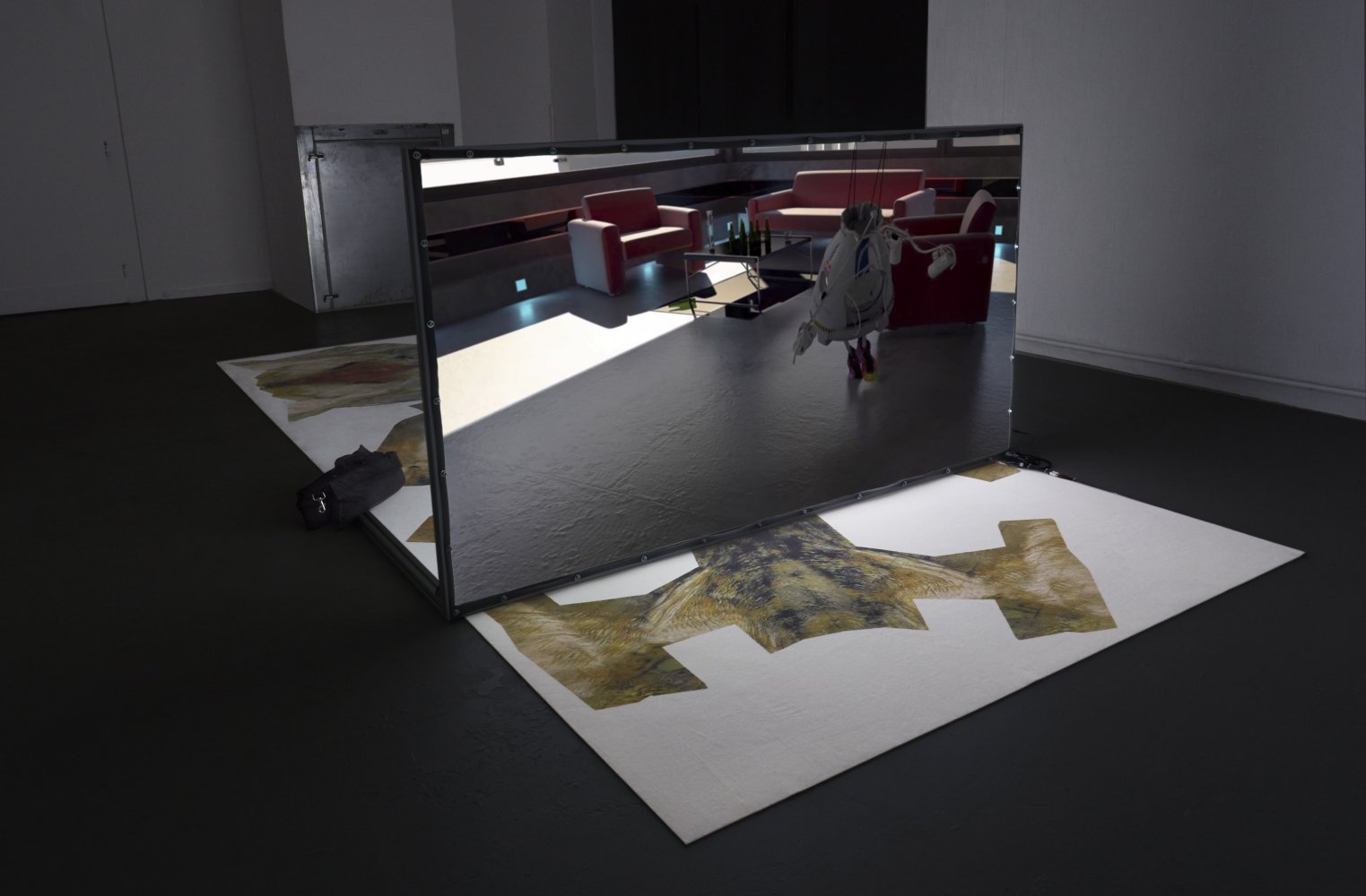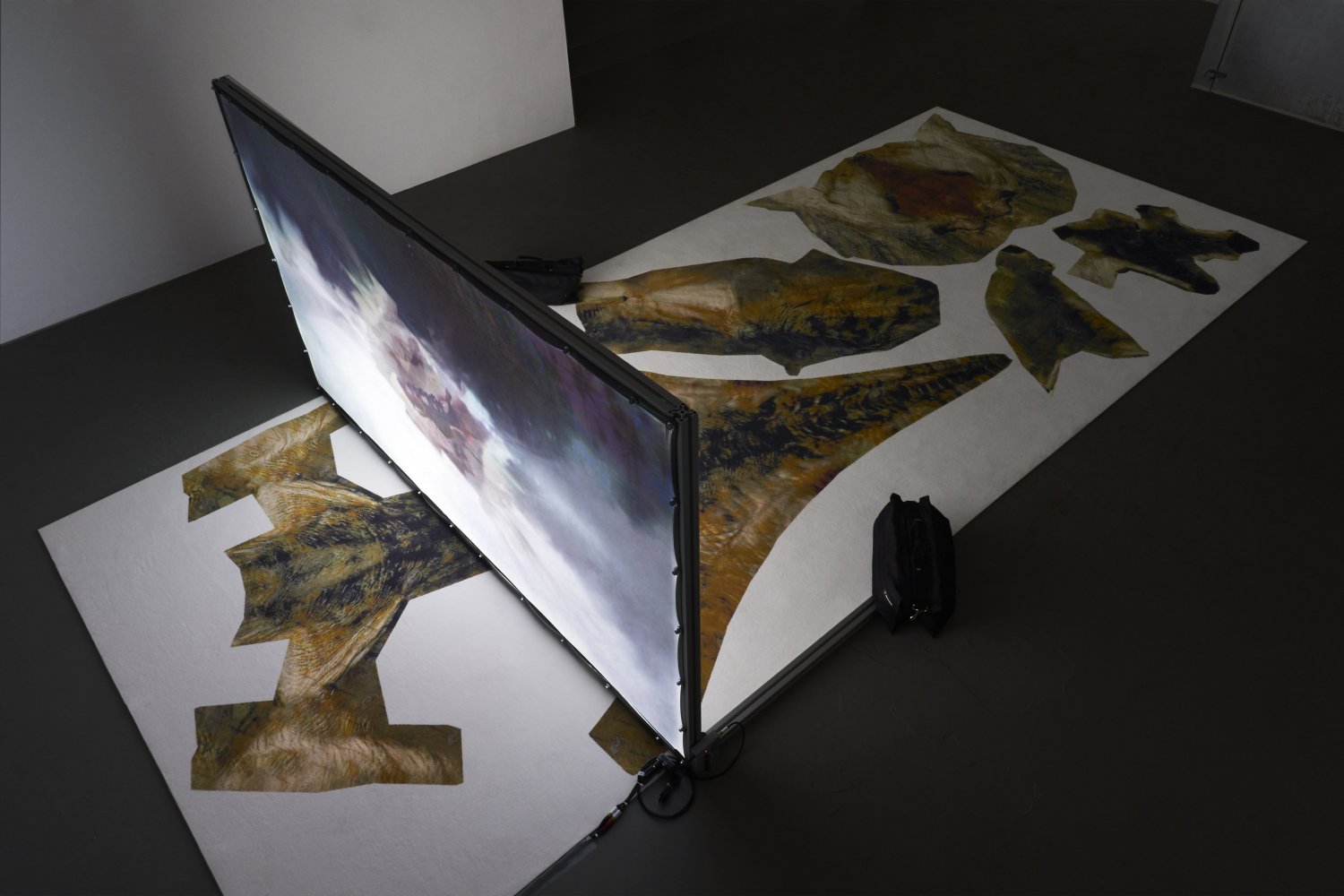 There is a screen supported by an aluminium frame standing in the middle of Berlin’s Ashley. It’s on a rectangular white carpet on a black painted floor in a single-room space on Oraniestraße, where the viewer is invited to sit cross-legged in front of a projection with headphones. The carpet is covered in splodgy brown cutouts that at first glance appear irregular and random. The ‘Preliminary Material for 2022’ video by Maximilian Schmoetzer, for his event of the same name screening January 20 to 23, is already on.