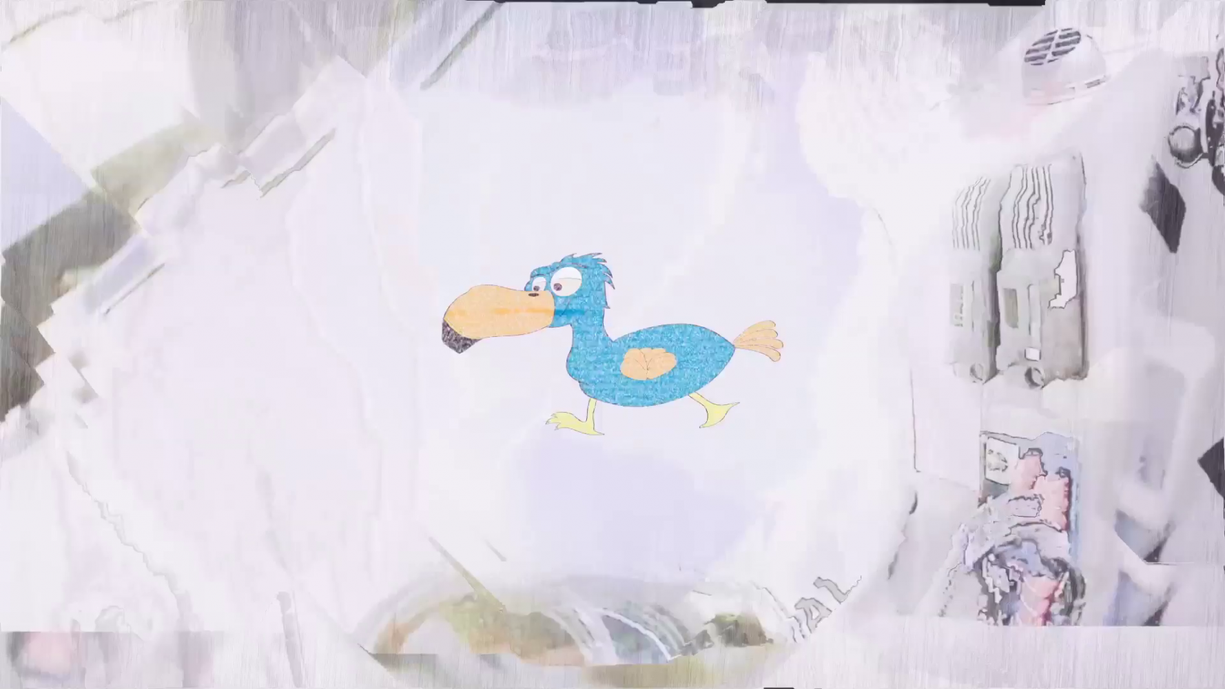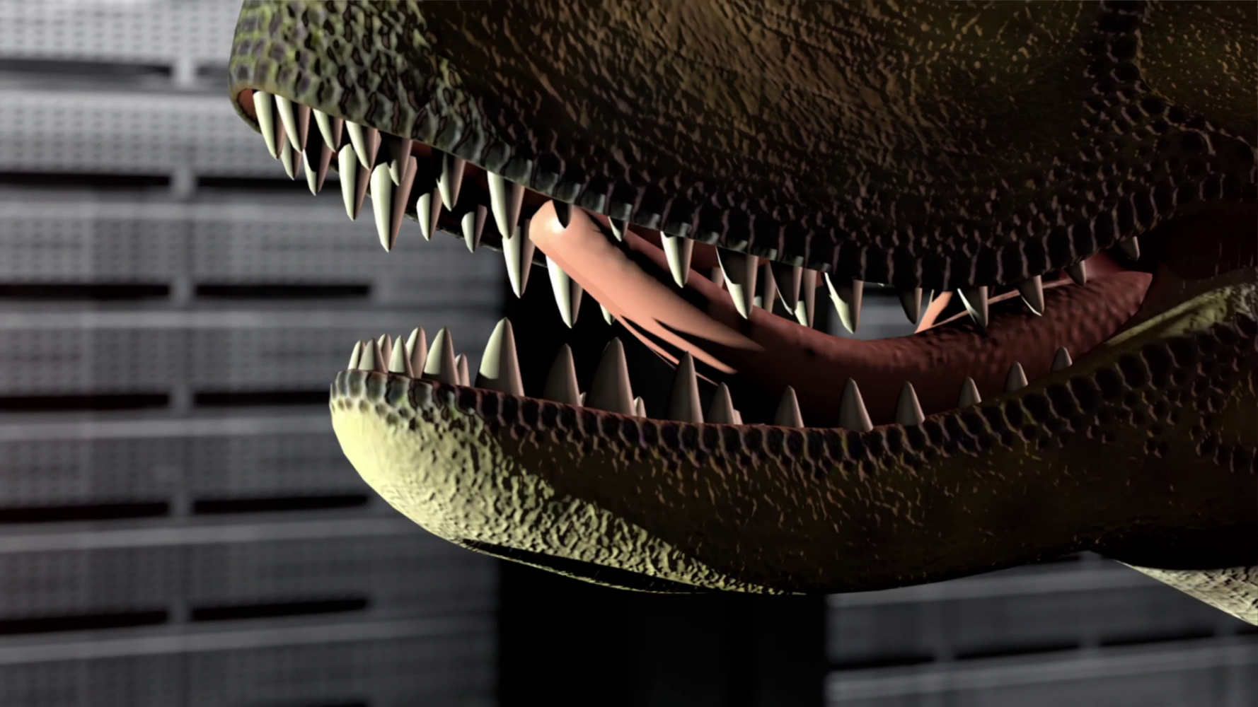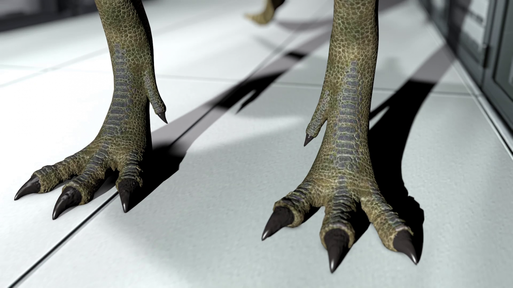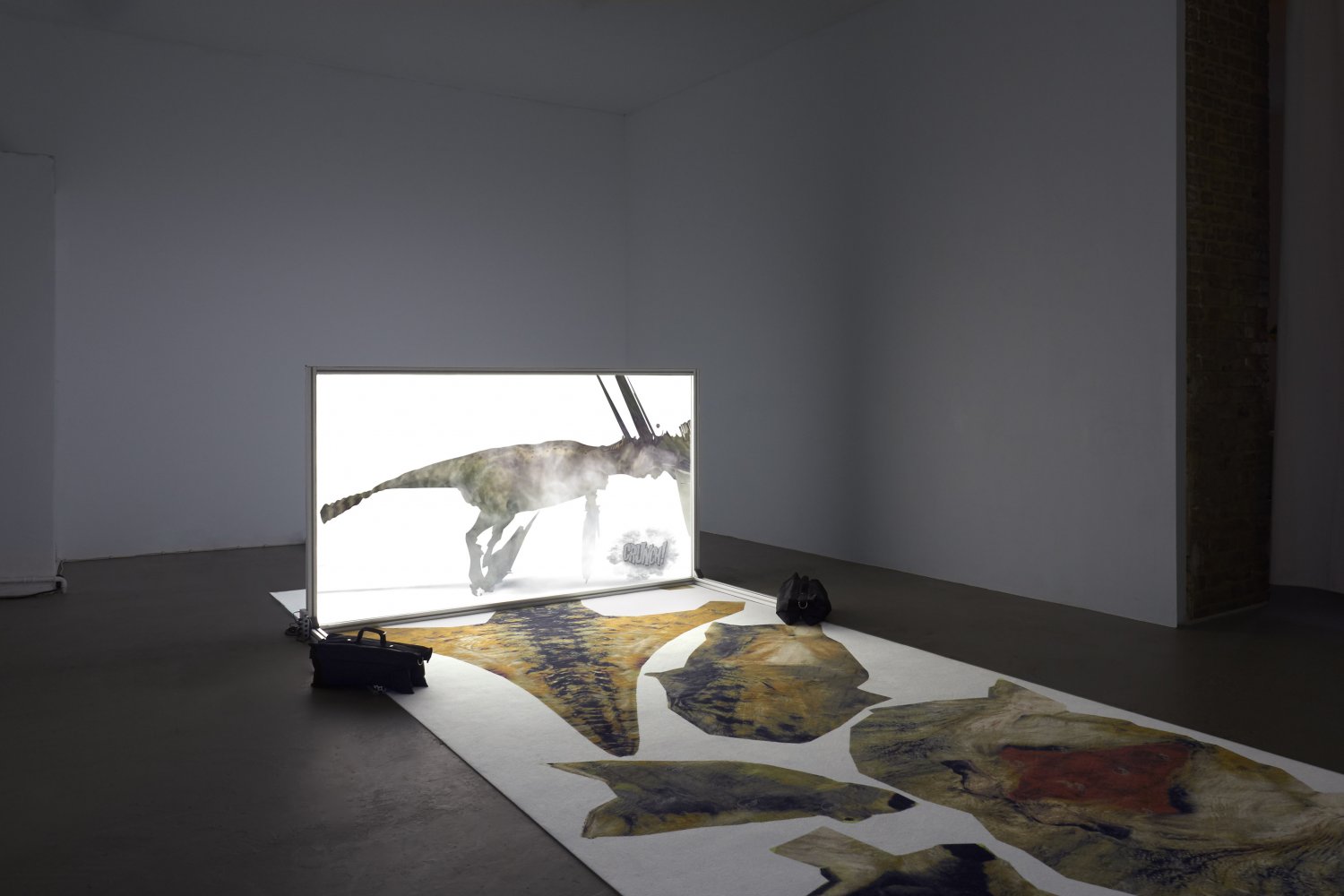 It’s unclear if it’s at the beginning or near the end when a 3D computer generated dinosaur appears. As it moves within the frame it becomes apparent that the shapes on the carpet are in fact the predator’s skin, flattened out. “It’s just a script you have to follow”, says a voiceover and you wonder if this extinct animal is in fact the narrator.