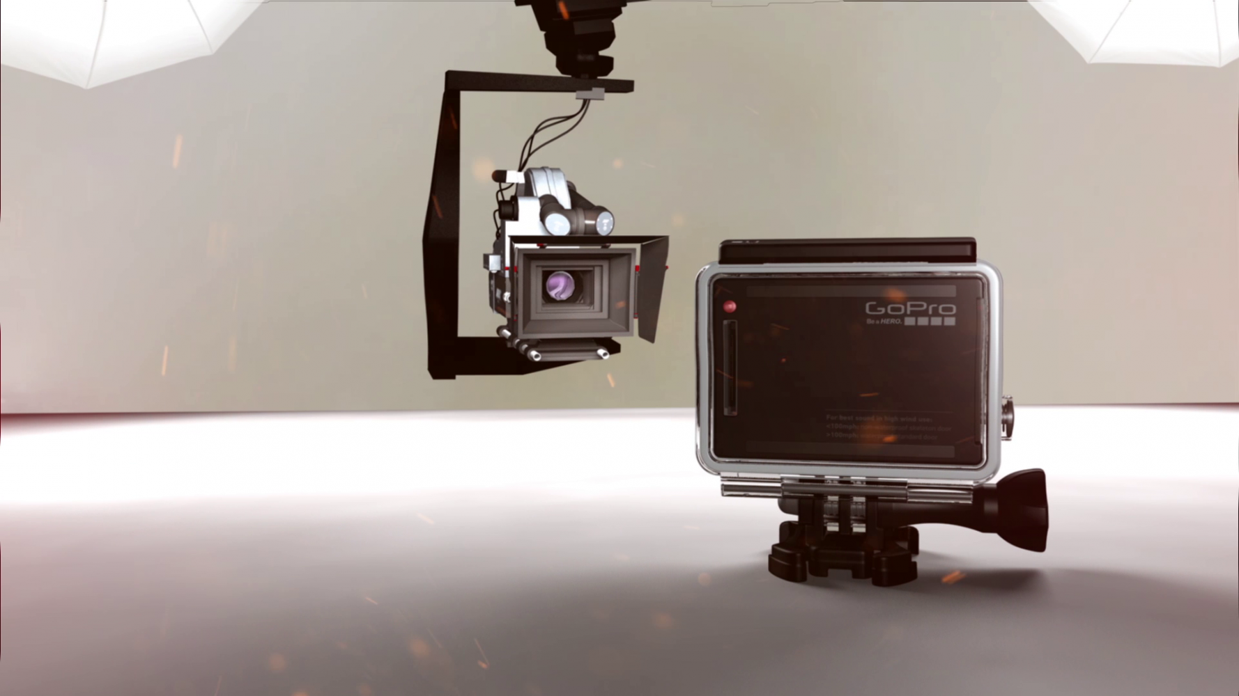 The interior of the capsule is captured in a wide angle frame that we recognise as one from a GoPro. “Be a hero”, the narrator says, and we see the small action camera at the centre of a photoshoot. The product’s theme line is not meant for its user anymore, the product itself has become the hero.