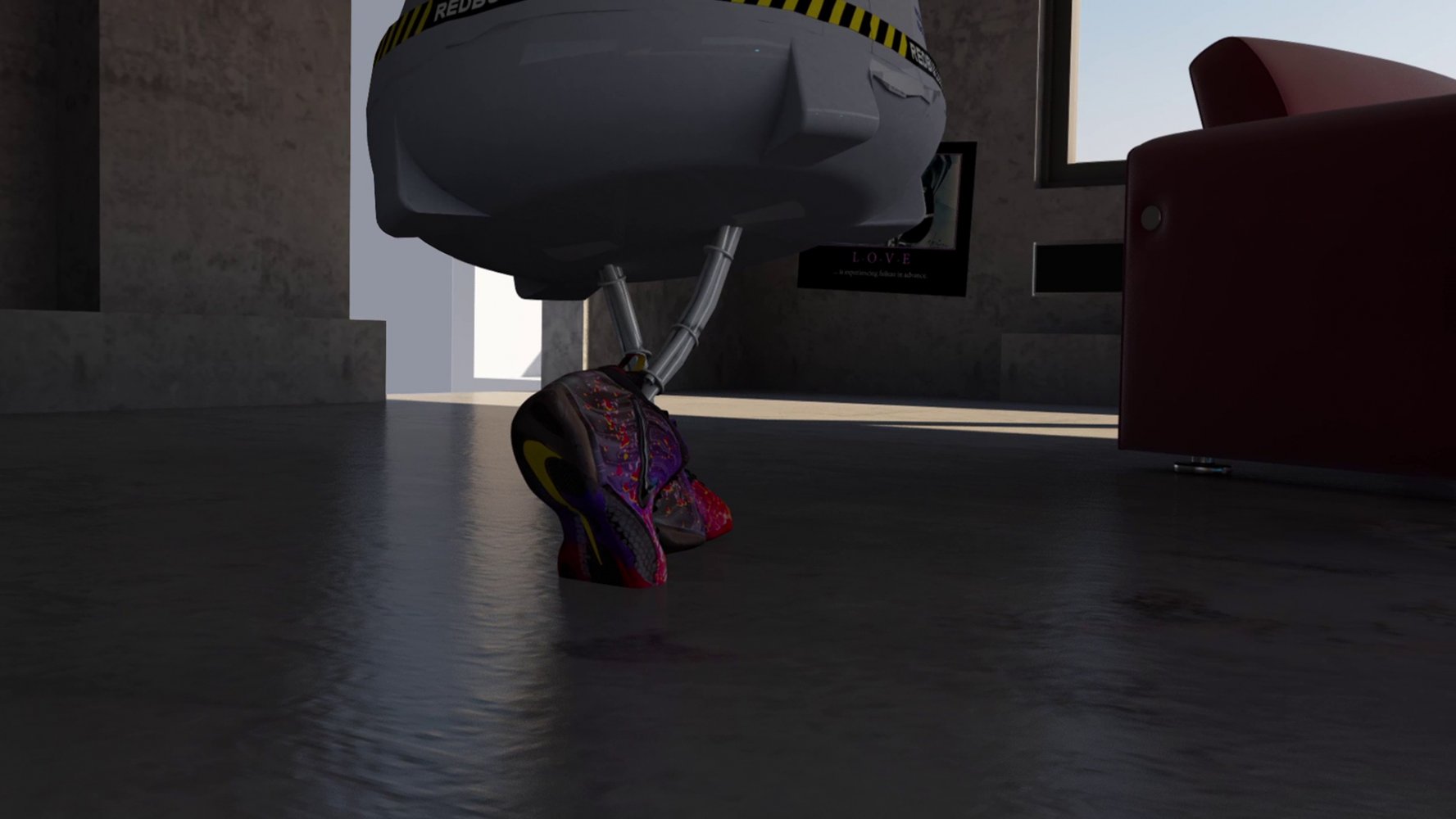 The focus, then, is more on the objects in Schmoetzer’s piece, as well as the corporate sponsorship that made Baumgartner’s trip possible. After all, it appears, the product image is more stable than the human behind it. Plastered in Red Bull energy drink logos, the capsule that carried Baumgartner to a world record, travels through the troposphere. Found footage of a boy appears as he shows the interior and exterior of a colourful Nike shoe. Later, the personalised capsule is situated in a modern apartment, anthropomorphised and walking around in these same Nike shoes. Outside we recognise the galaxy.