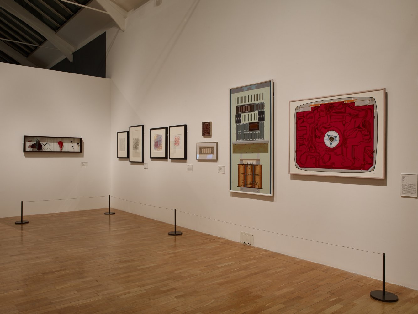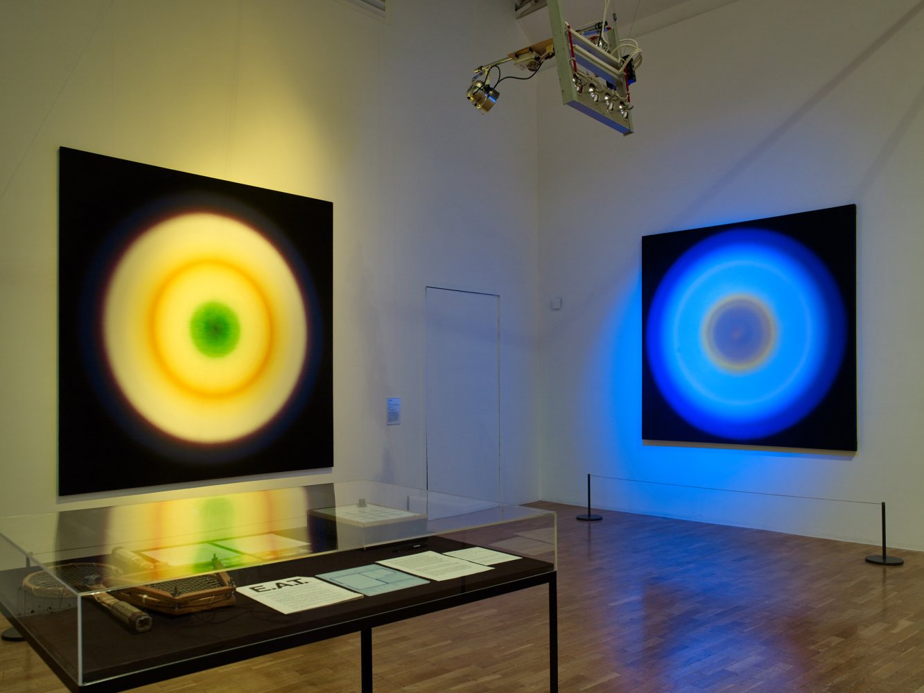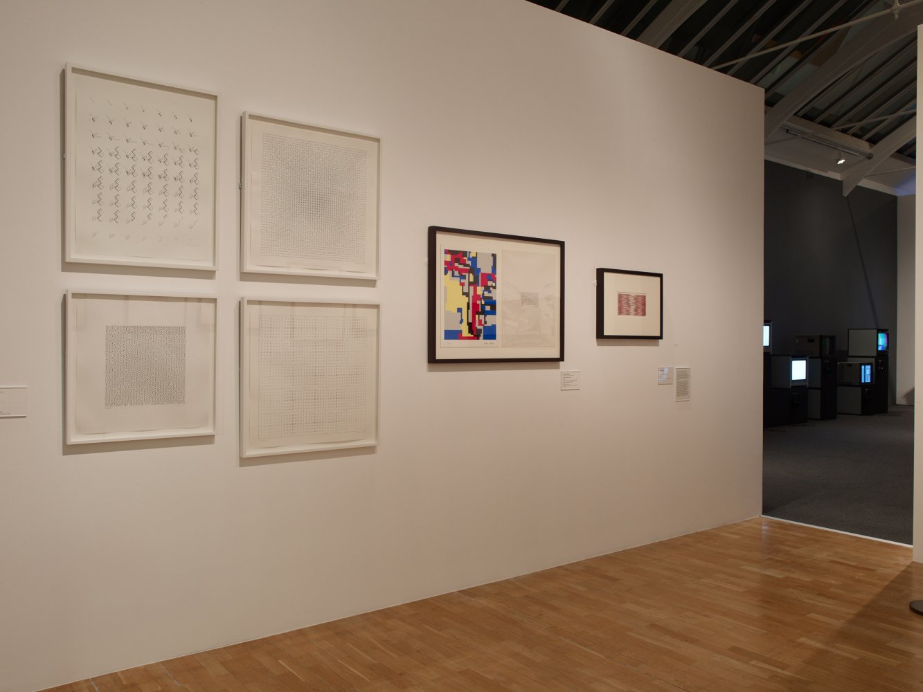 The exhibition is arranged in reverse chronological order, but I thought that I’d reverse this reverse, as it were, and start with the earlier work. Upstairs is carpeted and peaceful. There’s lots of work up here – Ulla Wiggen’s paintings of electronic circuits (1967), Vera Molnar’s computer drawings (1974), E.A.T’s modified objects for performance (1966), to name just a fraction but to also illustrate the diversity of material. There is plenty of moving image –video and early computer generated works.