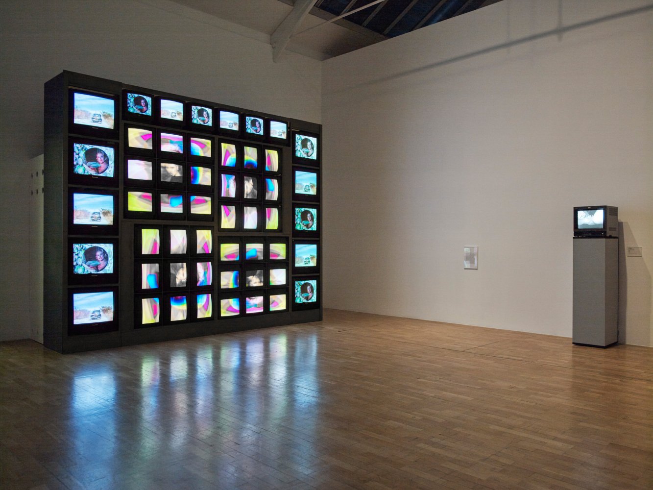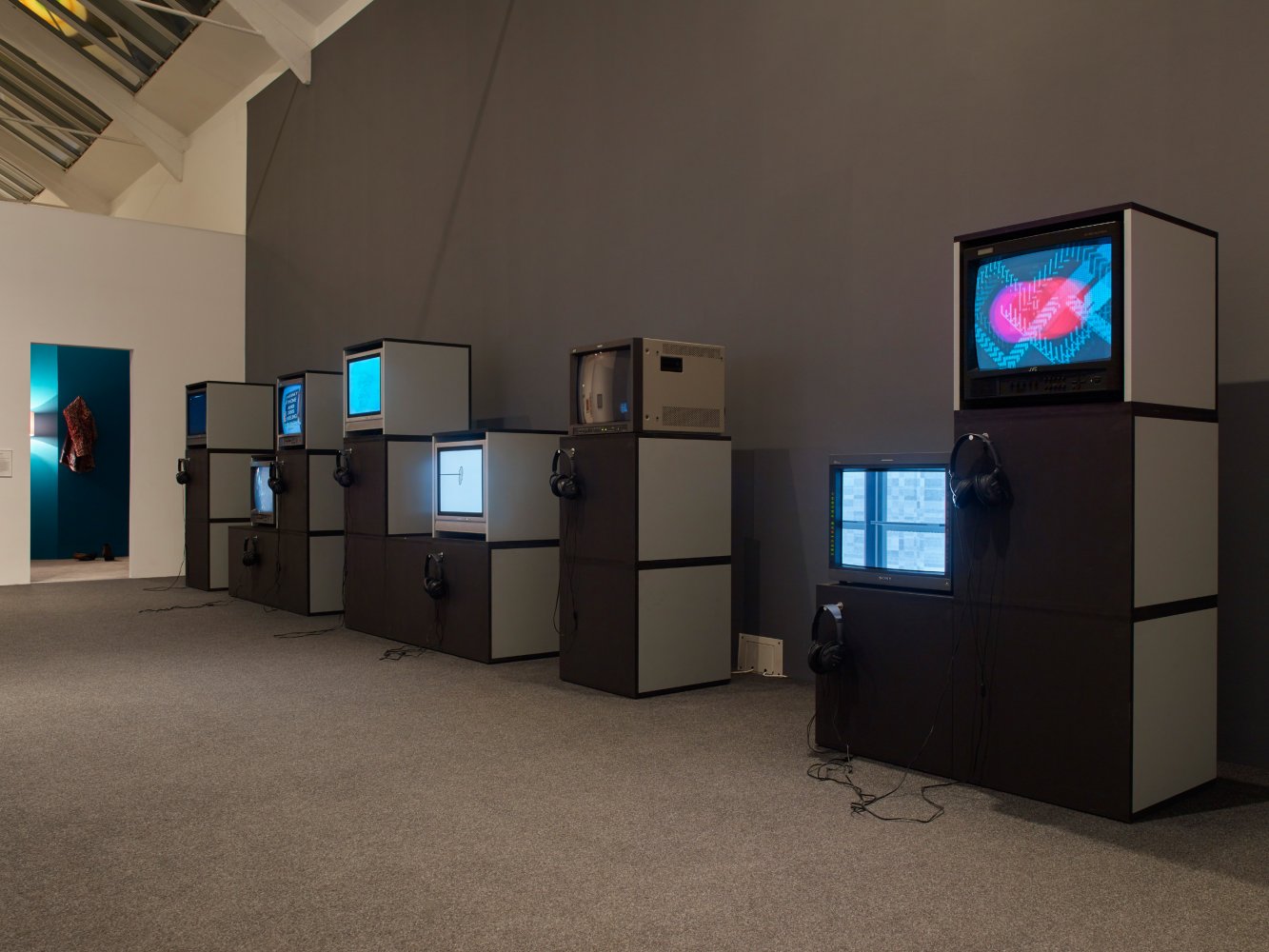 In Judith Barry’s film ‘Space Invaders’ (1981-1982) a voice muses over a night sky “we don’t know what’s really out there, just more stars, I guess”. The film continues into scenes of discos and video arcade games. A boy lies on his bed watching TV, dreaming, while the word ‘escapism’ intercuts. Dreaming toward the TV is echoed in Lynn Hershman Leeson’s interactive installation ‘Lorna’ (1979-1982). The work is styled like a 1970s apartment. A TV on a dresser plays an interactive film of the agoraphobic Lorna trapped in her apartment with her own TV, the only channel to the world outside. Nam June Paik’s ‘Internet Dream’ (1994), is a large video wall sculpture consisting of 52 screens displaying snippets of broadcast and electronically processed images. Is this heavy machine dreaming of the internet; that maybe more screens can break the single channel-induced stupor?
