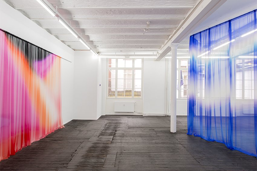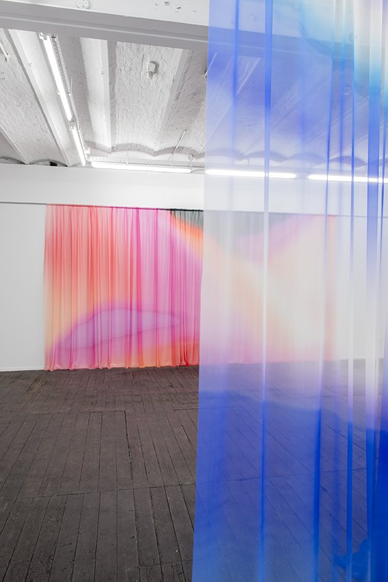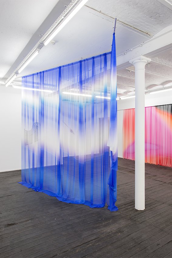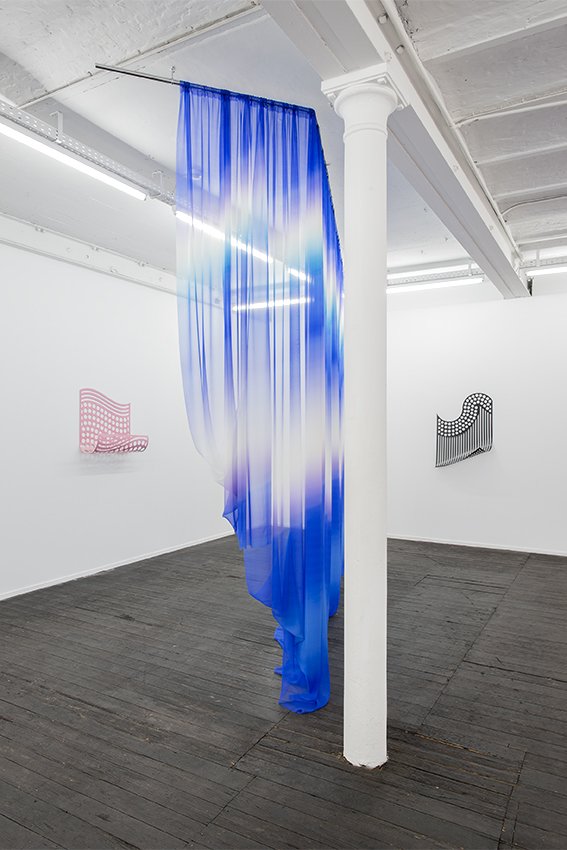 The room is filled with colourfully printed silk hung from polished steel, among laser cut and curved aluminum sculptures painted with expoxy and steel bent into organic ‘effortless’ forms. However, the titles of the works become the main focus of the exhibition and redefine how the sculptures are viewed. ‘SUPER RESTORATIVE, WAKE-UP LOTION, CLARINS’, ‘HOW TO DRAPE RIHANNA’S RED HAIR VOGUE COVER’ and ‘HOW TO DRAPE THE COSMETIC PROPERTY OF AN AMETHYST’ are some examples of the confident yet bombastic statements that accompany the objects.