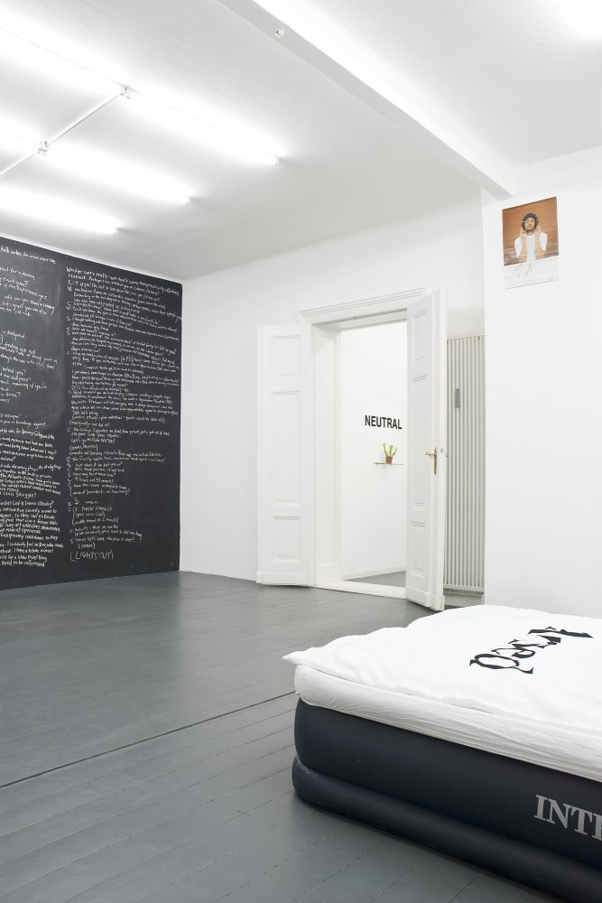 A text by philosopher Robin MacKay accompanying the show elaborates the theoretical underpinning of Warwick’s self-mocking visual shtick. Mackay’s biting essay considers the cultural dominance of the word space. Places are imbued with creative capital in their transformation to spaces: the project space, the research space, the gallery space. This neutralizing word is unparalleled in the art world, a strong signifier for a transitory and white-washed cultural landscape, devoid of meaning and positioned towards boundless potentiality. While a certain Berlin lifestyle (and the reverence afforded to it abroad) is critiqued, Neutral acknowledges a more structural problem. The insatiable desire for newness propels the creative class toward cities like Berlin, but the by-product of their appearance is an emptying out of substance they seem to take everything and add nothing.