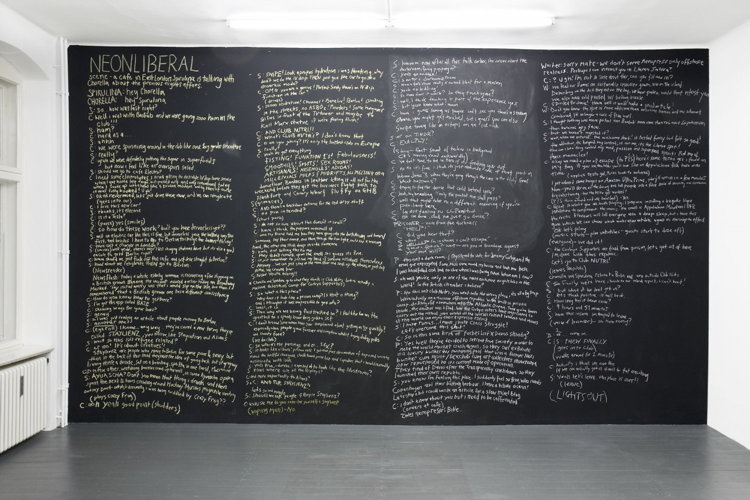Neutral is a text-heavy tour de force, revealing an apathetic subset of Berliners, the so-called ‘staylienz’ who, intending to visit for a short time, end up living in the city for a decade “sat on a beanbag, splifta in one hand”. Musician-artist Steven Warwick (aka Heatsick) develops a series of similarly catchy neologisms throughout his solo exhibition at Exile, running January 30 to March 5. The central narrative ‘NEONLIBERAL’ is a tale of two bubbly Brits Spirulina and Chorella who embark on a spontaneous road trip from London to Berlin in their driverless car to check out the hottest new nightclub, the next Berghain, Club Nutri. Thinking they’ve arrived at the venue, they find themselves trapped in a maximum security prison-vessel for Jeremy Corbyn supporters, drifting offshore. In a mounting procession of absurdities, they decide that the only way to free themselves is to take “Testo Gel”, grow Appalachian folk singer beards and bore the guards to sleep with their prosaic music. Success. They make it to Club Nutri and are admitted after only a nine-hour wait. Disappointed by how easy it is to get in, they immediately turn back for home. Berlin. Is. So. Over.