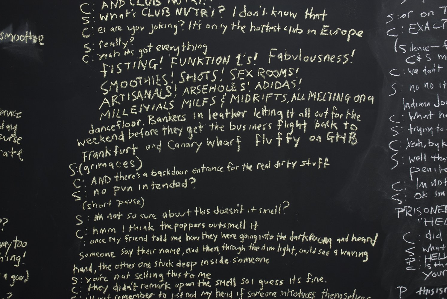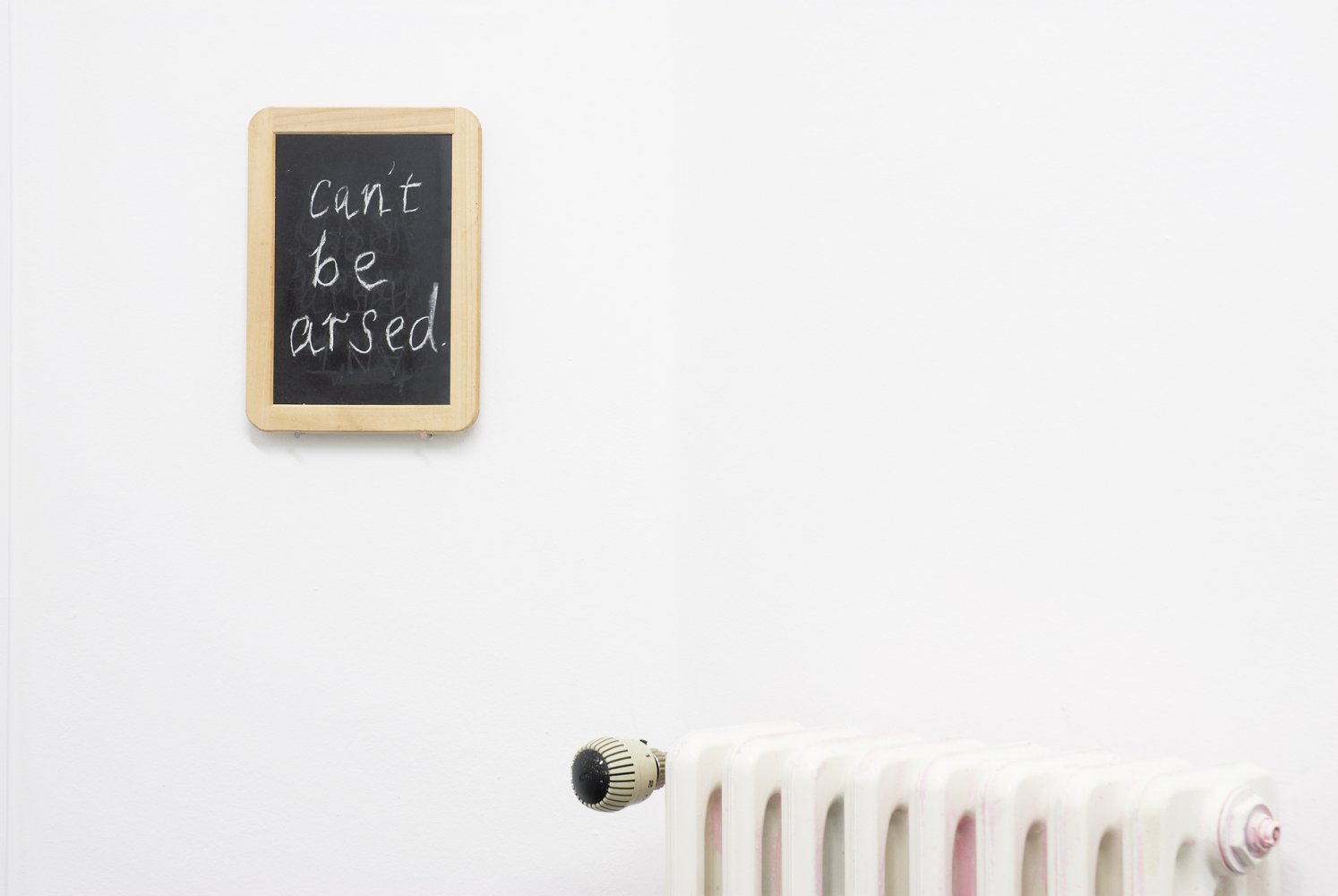 The screenplay is hand-scrawled on a chalkboard in the gallery, taking up the length of a whole wall. The only other thing in the large room is a bed, a blow-up mattress in the centre of the floor, sheets printed with an unambiguous message: “CAN’T BE ARSED”. Complementing the ‘NEONLIBERAL’ characters’ names, a bag of fresh large-leaf spinach stands in for the plump pillow at the head of the bed. Visitors are invited to sit or lie on the bed to read the script –a strange reversal of the usual lazy experience: instead of watching a projected film we are confronted with a wall of densely-packed script and only our imaginations to add colour to the story, in this almost clinically neutral setting. The show’s other props –houseplants, a pair of sneakers, Heatsick’s own grated u-bahn platform record sleeves –corroborate the oozing neutrality, comfort, placid health goth style, and lack of ambition until we feel almost at home in our own spacious, minimal Berlin apartments, wandering between rooms unfazed and uninspired.