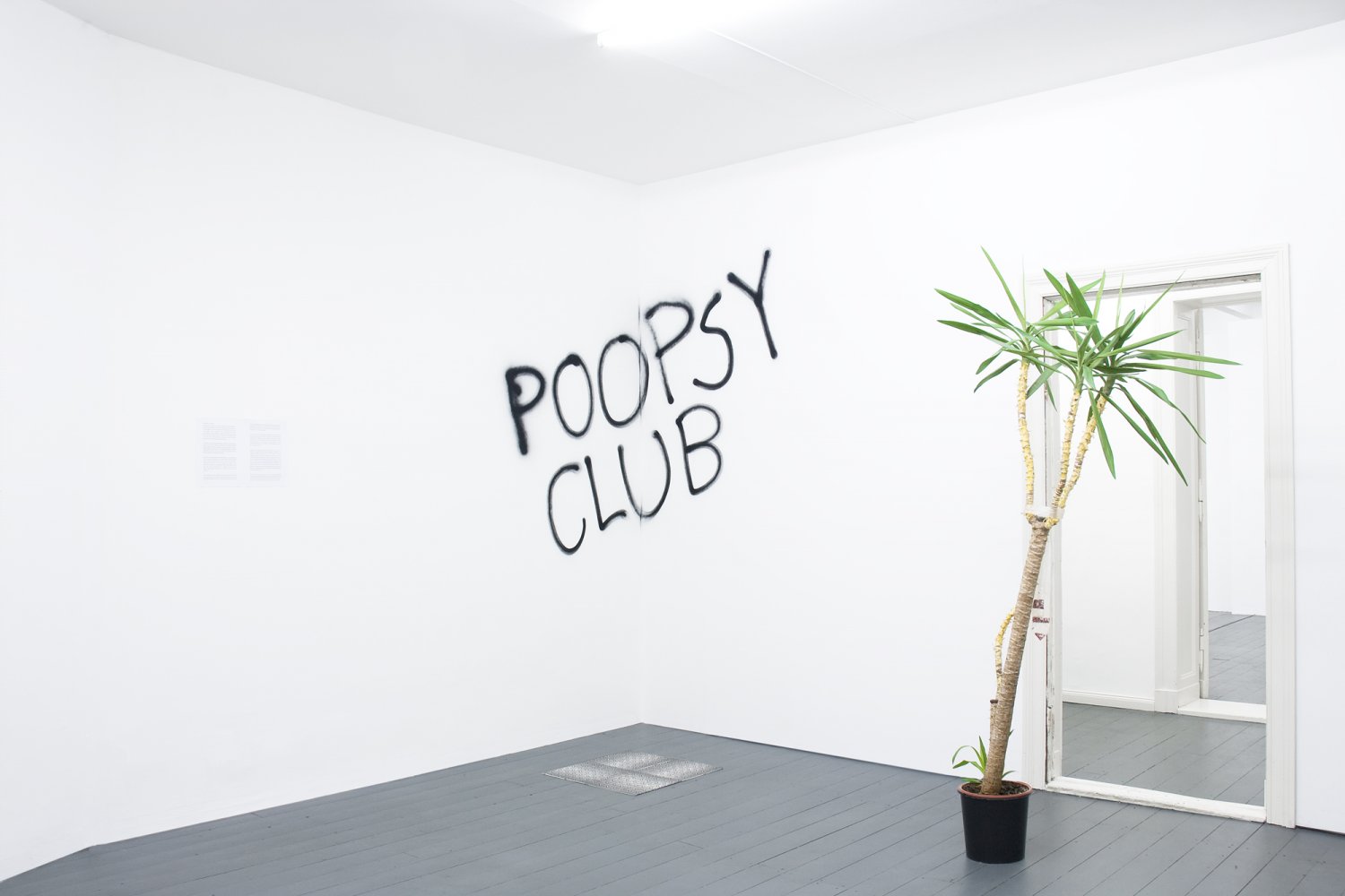 Steven Warwick, 'POOPSY CLUB' (2016). Install view. Spray paint on wall with four Heatsick RE-ENGINEERING record covers. Courtesy Exile, Berlin.