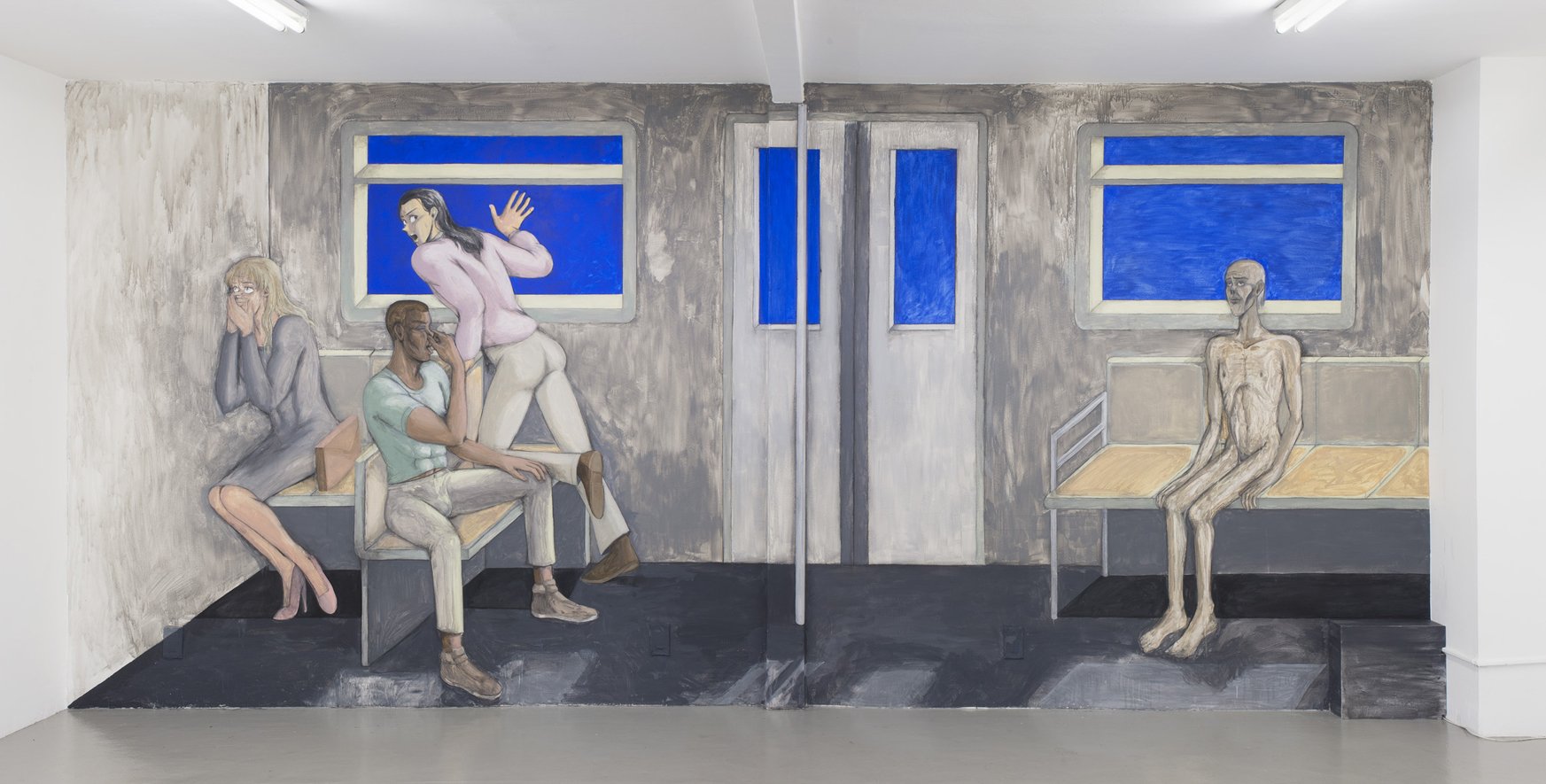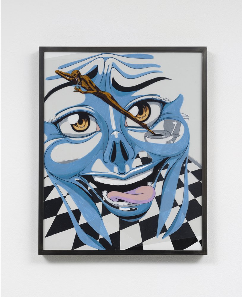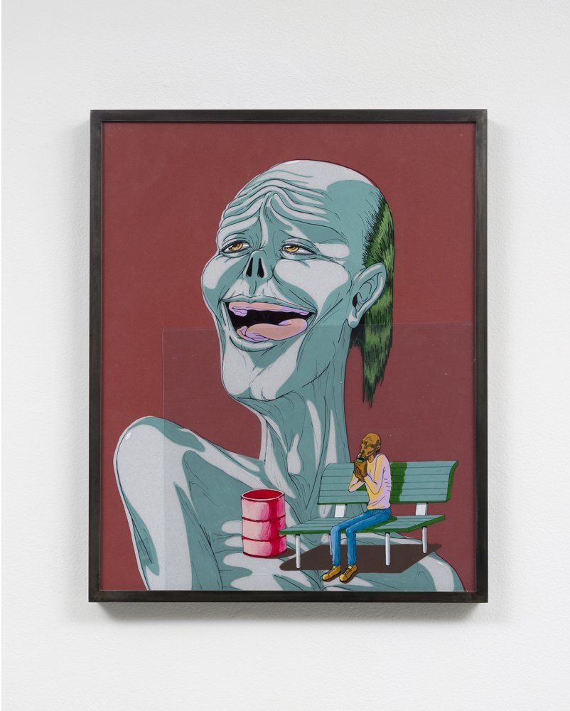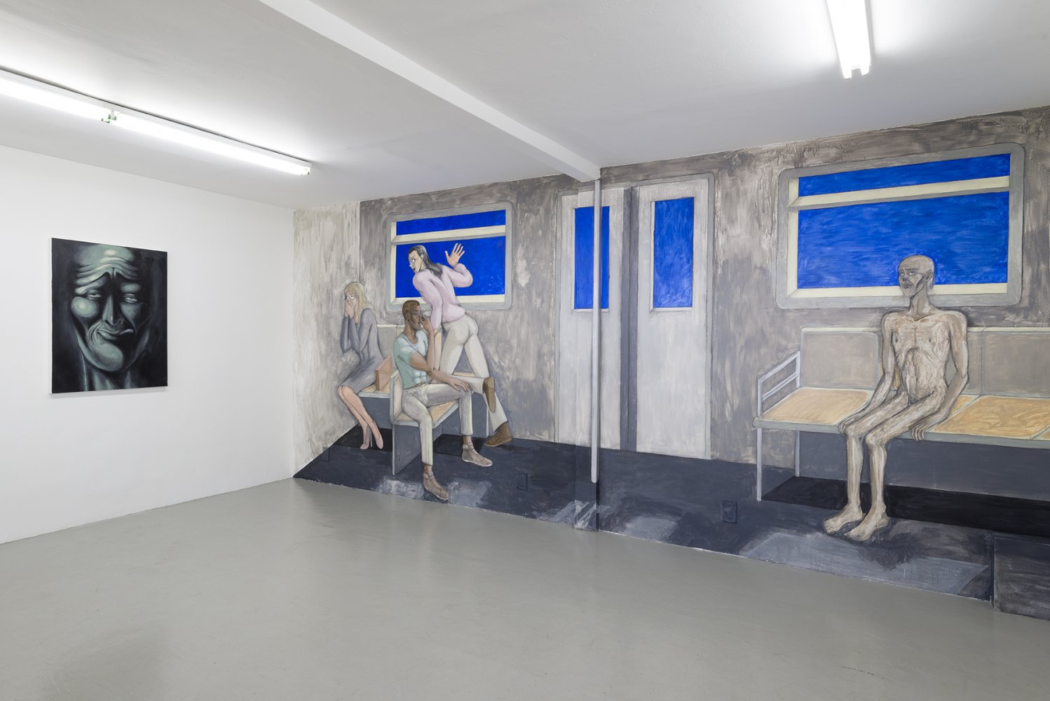 The six wall works of King and Slave each operate in the vein of individual comic panels, displaying scenes of characters’ oscillating self-worth within vignettes of interpersonal emotional dependence. A withered, desperate character grins a toothless smile while sipping on a Big Gulp next to a trash can in ‘Bench’ while another howls in a moment of rejection from their stronger dominant partner in ‘Bed’. Painted literally as a piece of shit, the onslaught of heavy drinking flushes another figure down the toilet in ‘Blue Face’, despite (or because of) the backdrop of intense emotional enjoyment and gratification. In the painting ‘BDSM’, the Leopold and Loeb affair is strongly implied as two sickly figures restrain a healthy young male for their own uncertain pleasure. Throughout the exhibition, all of Ceccaldi’s characters are portrayed as barely living corpses, best demonstrated by his sprawling mural ‘Subway Cumrag’ where a blithe, rotting, nude figure sits alone on an approximation of a Manhattan-bound L train to the terror and disgust of his fellow passengers. What could very much be Ceccaldi’s self-portrait in ‘Dirty Mint’ muses at all the morass, hung alone on the left hand side of the gallery with his tongue poking out.