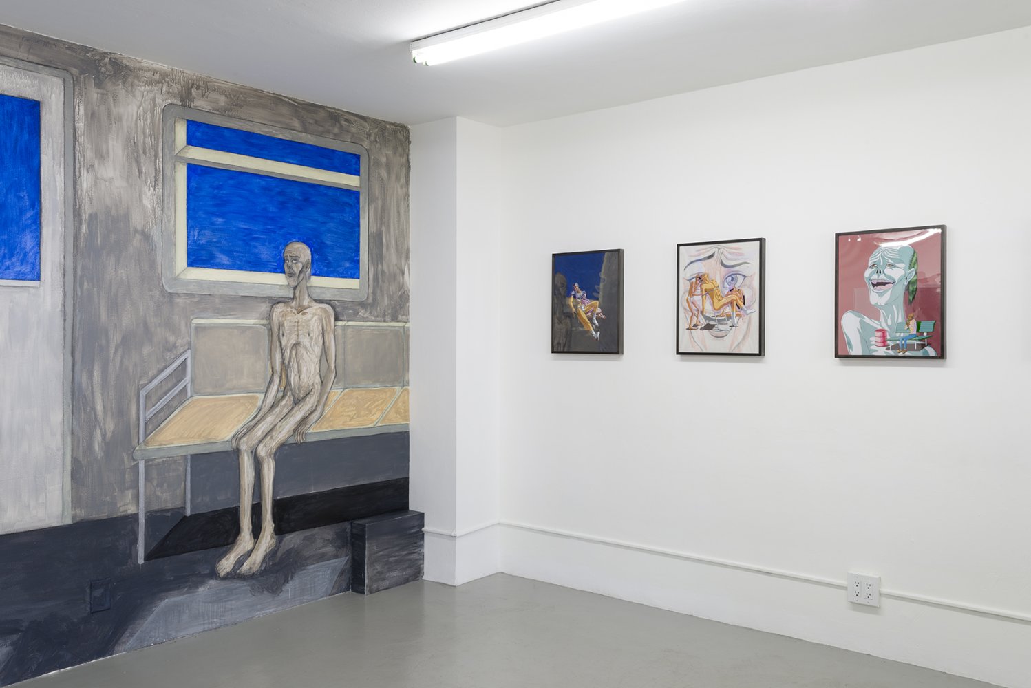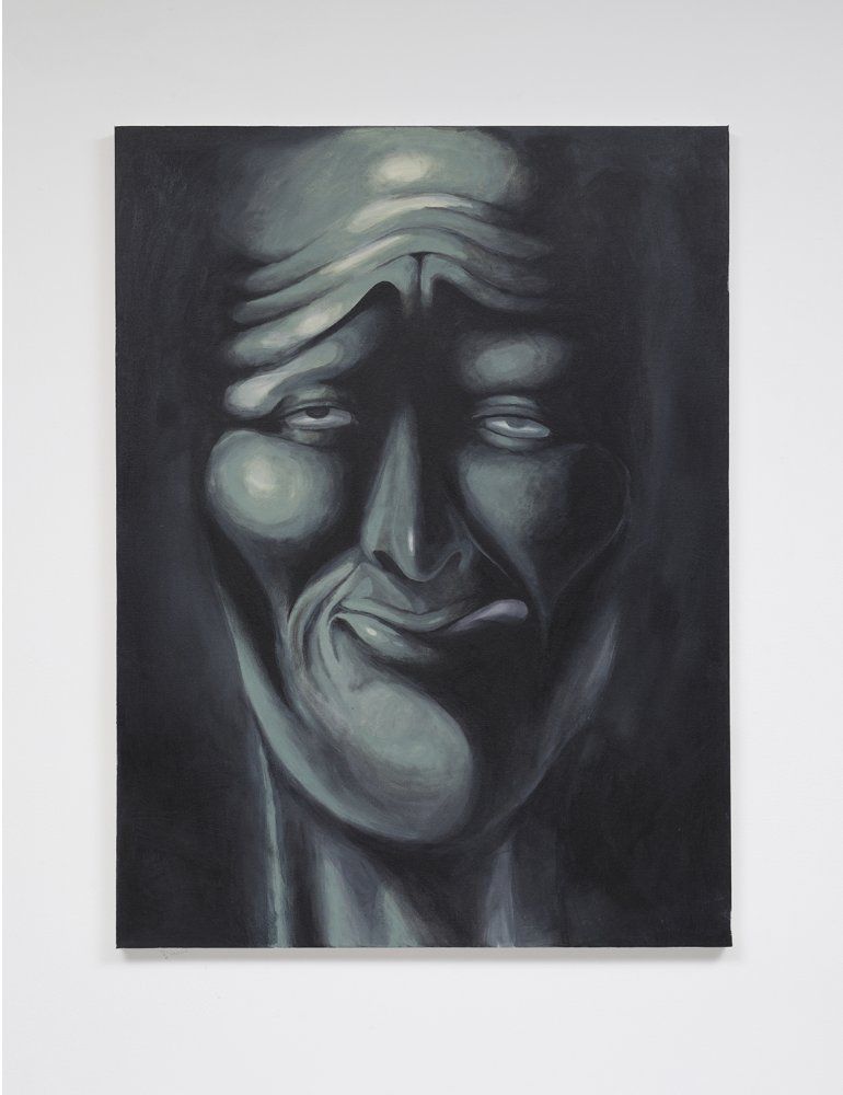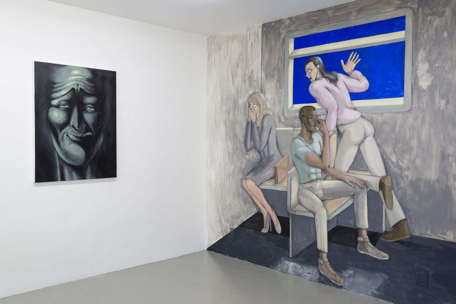 The six wall works of King and Slave each operate in the vein of individual comic panels, displaying scenes of characters’ oscillating self-worth within vignettes of interpersonal emotional dependence. A withered, desperate character grins a toothless smile while sipping on a Big Gulp next to a trash can in ‘Bench’ while another howls in a moment of rejection from their stronger dominant partner in ‘Bed’. Painted literally as a piece of shit, the onslaught of heavy drinking flushes another figure down the toilet in ‘Blue Face’, despite (or because of) the backdrop of intense emotional enjoyment and gratification. In the painting ‘BDSM’, the Leopold and Loeb affair is strongly implied as two sickly figures restrain a healthy young male for their own uncertain pleasure. Throughout the exhibition, all of Ceccaldi’s characters are portrayed as barely living corpses, best demonstrated by his sprawling mural ‘Subway Cumrag’ where a blithe, rotting, nude figure sits alone on an approximation of a Manhattan-bound L train to the terror and disgust of his fellow passengers. What could very much be Ceccaldi’s self-portrait in ‘Dirty Mint’ muses at all the morass, hung alone on the left hand side of the gallery with his tongue poking out.