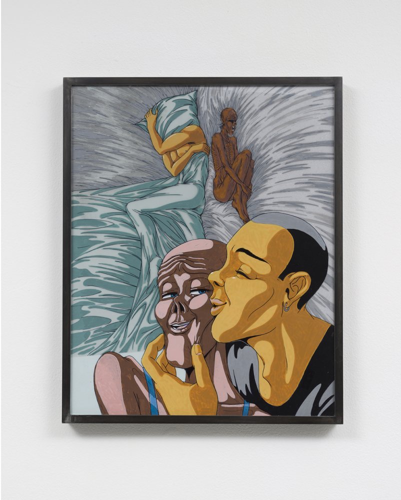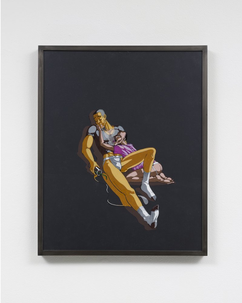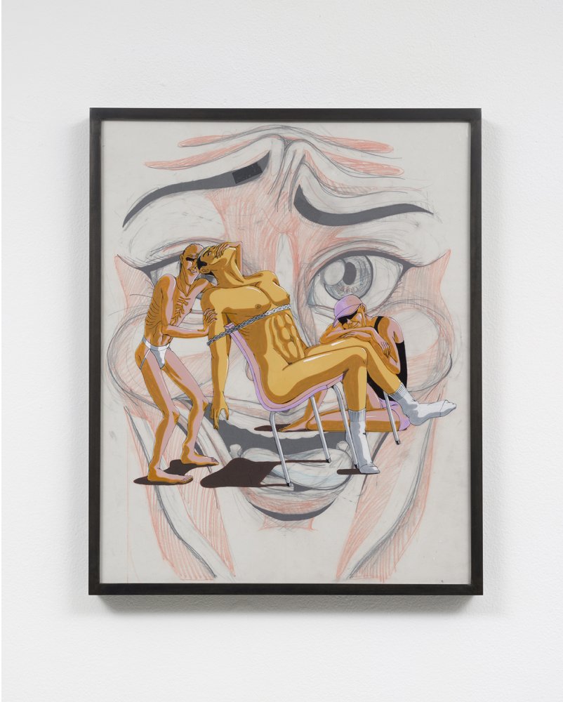In referencing the Leopold and Loeb case, Ceccaldi’s animated paintings extend deeper into the abyss of psychological motives and desires that fuel human sexuality, vanity and self-worth; all topics present in previous comics and exhibitions. His shows at Paradise Garage in Los Angeles and MJ Gallery in Geneva featured hand-painted clothes displaying characters on the verge of breakdown, either freaking out or embellishing the perilous terrain intersecting youth culture, entitlement and gender identification. While Ceccaldi’s work at Jenny’s veers away from his use of clothing as medium, it is firmly rooted in displaying the anxiety and angst that haunt so many of his characters caught between the terror of sexual, social and self-fulfilment.