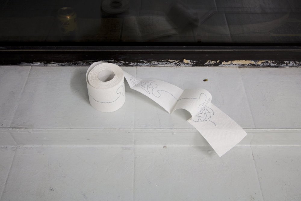 On the other side of the room, a printed text winds around a roll of toilet paper by Camilla Steinum. With some difficulty, bits and pieces can be read: “Dirt comes out via the mouth…again and again unprocessed and embarrassing…trying to find meaning…the words, worlds.” The print feels strongly connected to the accompanying text, stringing the exhibition together by a thread of poetic-manifesto styled musings.**