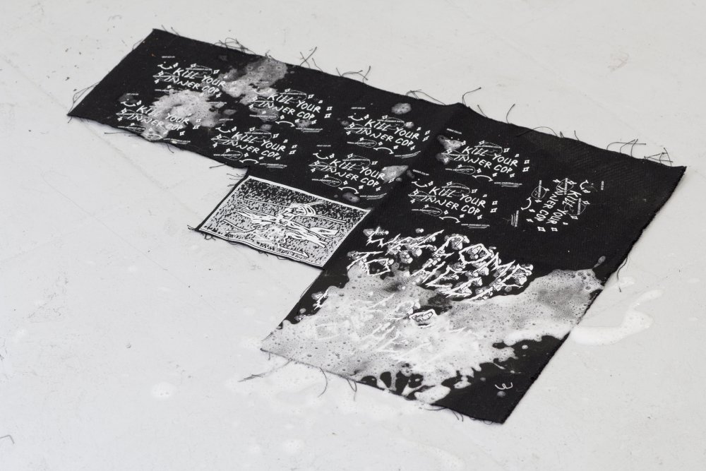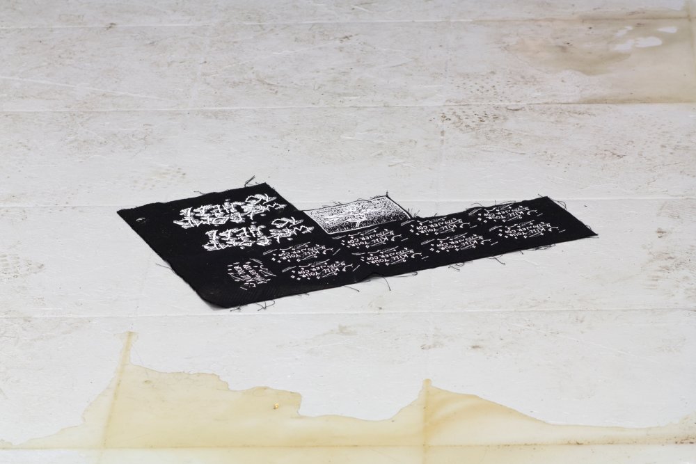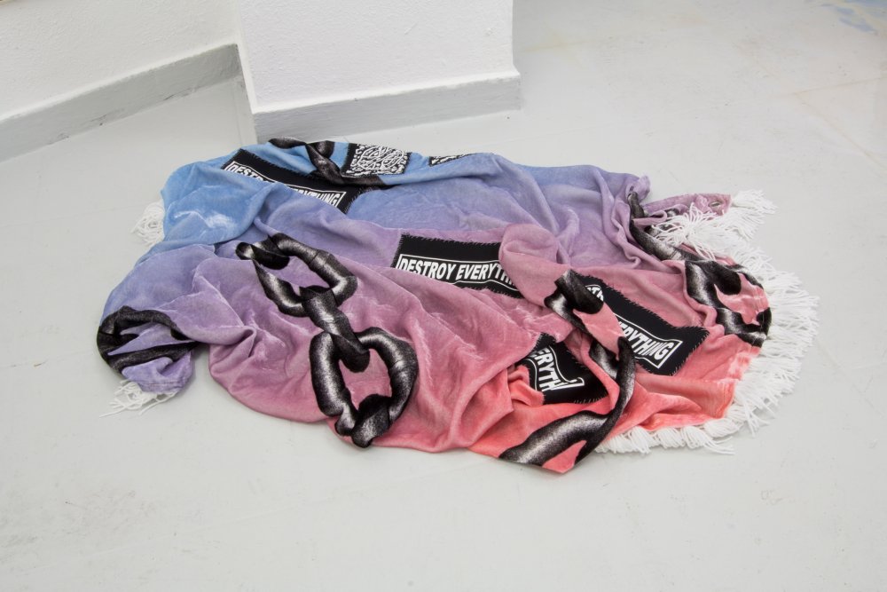 Similar in size and shape, Burkhard Beschow‘s ‘Holes’ feels skeletal in relation. Wire, metal parts and cloth are tangled in a violent mess. The letter ‘E’, among other unidentifiable pieces of debris, is suspended in some sort of barbed wire trapping. Jake Kent‘s ‘Dropping the A Bomb’ and ‘Hanging out in someone else’s puddle’ pile political slogans in a heap on the floor. Silk screen patches yelling “DESTROY EVERYTHING” and “KILL YOUR INNER COP” are sewn into the digital prints and silk viscose velvet. The handmade tassels have a tender quality, bringing to mind the lengthy and invested form of obscure labour within activism. Alexander Endrullat‘s ‘Unibody’ places a MacBook on a step and in safe distance from the damp floor. Plugged in and fully charged, it has been permanently welded shut and rendered a completely useless object.