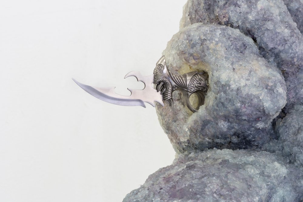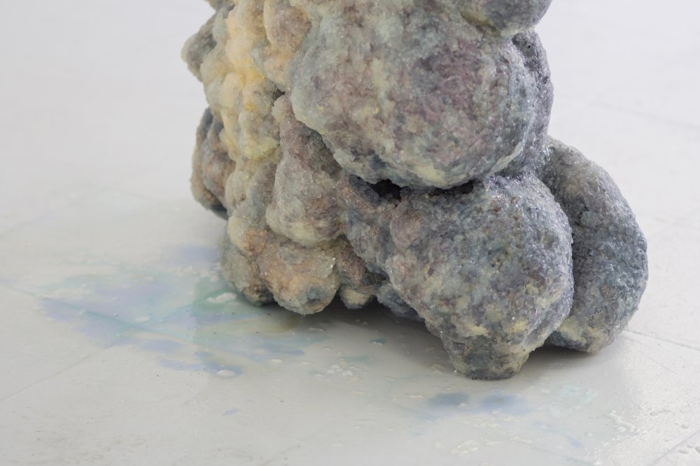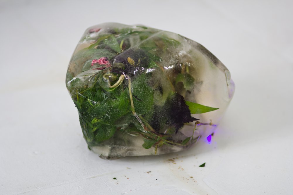 The show’s installation photos capture Kai Hügel‘s ‘Iced Herbs’ as they begin to thaw. LED lights and various vietnamese herbs emerge from within the frozen casing. A light leak begins to permeate the floor, moistening Dorota Gaweda & Eglé Kulbokaité‘s deteriorating aubergine skins. Dotted at random around the room and dissected in half, the vegetables lay splayed out over a hashtag text piece stuck to the floor that reads “CaptiveCEOsToBeReturnedToTheWild”. Michele Gabriele‘s ‘SHITTY-SLIPPY-SLUTTY (A beautiful and dangerous night)’, sits firmly in relation to the rest of the light and somewhat ephemeral works. The crystallised body sits somewhere between a rock formation you might see in a cave and an oversized piece of quartz used for spiritual healing. The pigment mixes with the surrounding moisture, dying the floor blue and purple. Protruding from the side, a PREDATOR knife sticks out from the sculpture’s gut.