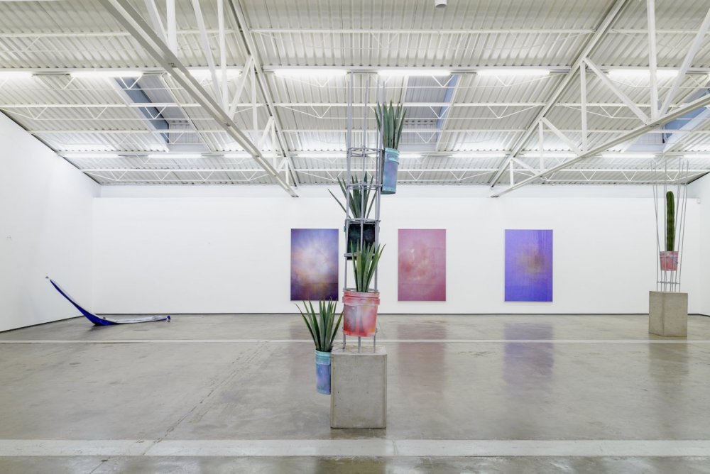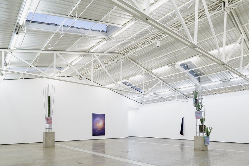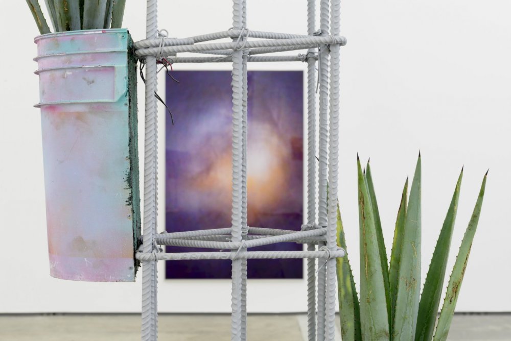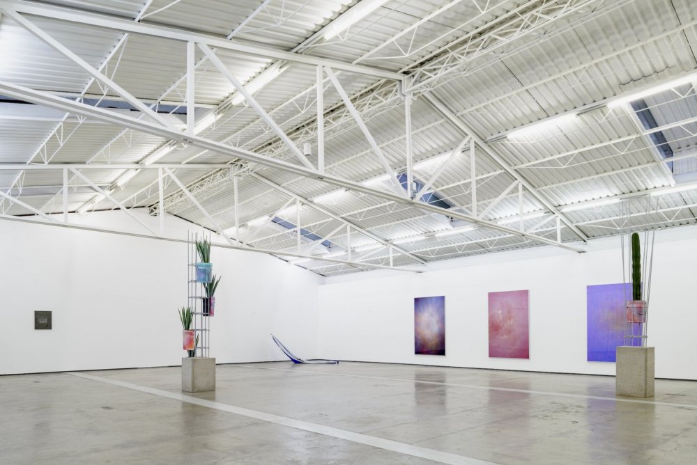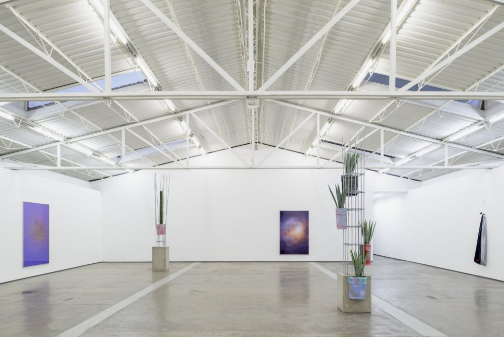 Three large photographs titled ‘Stargazer’ make up a triptych along the main wall and were taken by Missika while in a hammock looking up at the sky. Similar to an abstract painting aesthetic, the amateur style of photography gives off a romantic sensitivity. Highly pixellated, shaky and soft coloured in hue, they act as a trace or memento of a significant individual experience of searching for the moon in the night sky. Potted plants intertwined with incomplete structures are placed in the middle of the room. Mimicking the colours in the photographs, the pots are painted a light pink, blue and purple. Titled ‘Higher Future,’ they cling to thin steel columns grounded in concrete. Another version places a cactus down the middle, its vertical shape in tandem with the steel as they reach towards the sky. In contrast to these more stable monuments, a thin sheet pulled into the shape of a one-man tent shelters another potted plant. The leaves pierce through the top of the fabric.