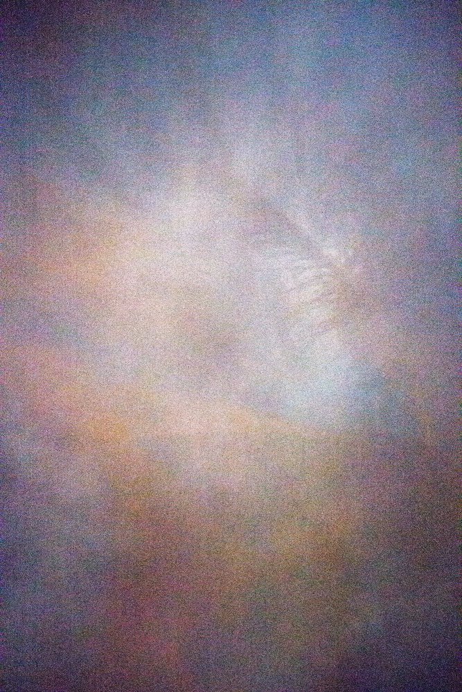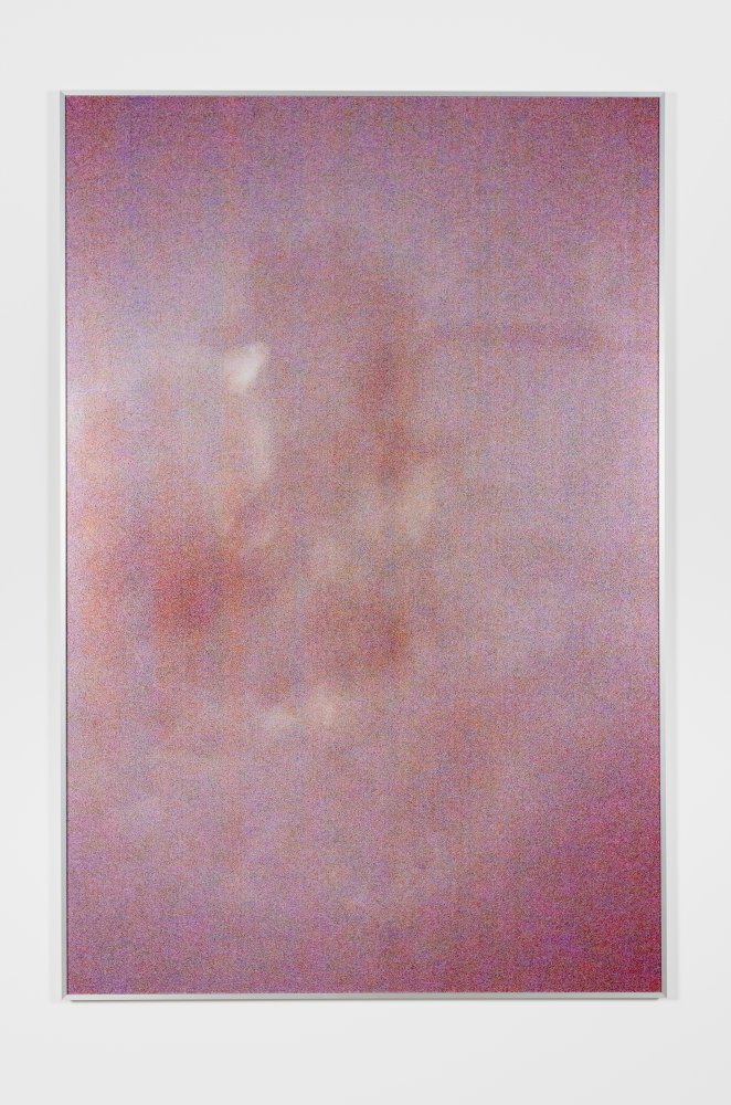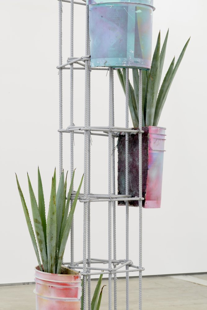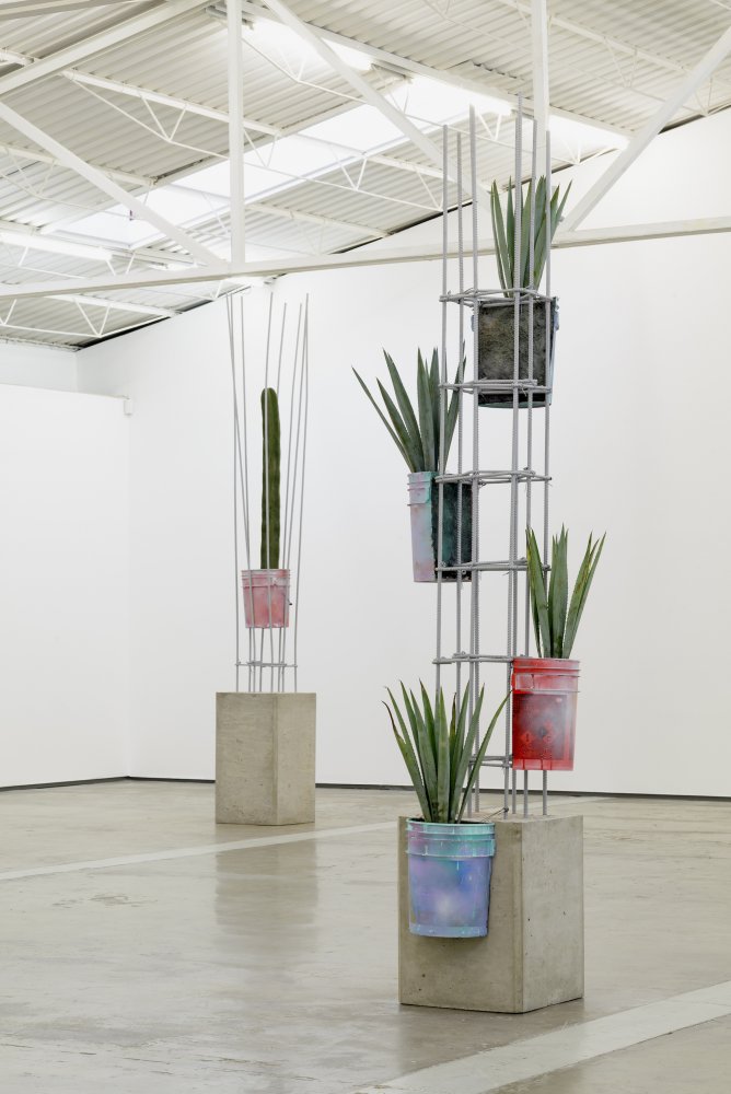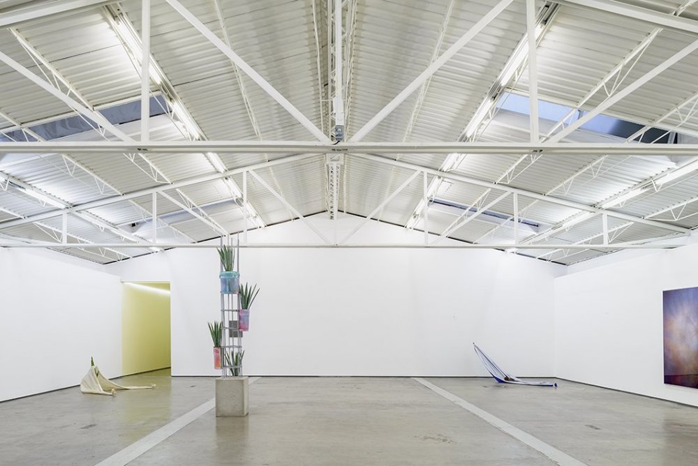 Three large photographs titled ‘Stargazer’ make up a triptych along the main wall and were taken by Missika while in a hammock looking up at the sky. Similar to an abstract painting aesthetic, the amateur style of photography gives off a romantic sensitivity. Highly pixellated, shaky and soft coloured in hue, they act as a trace or memento of a significant individual experience of searching for the moon in the night sky. Potted plants intertwined with incomplete structures are placed in the middle of the room. Mimicking the colours in the photographs, the pots are painted a light pink, blue and purple. Titled ‘Higher Future,’ they cling to thin steel columns grounded in concrete. Another version places a cactus down the middle, its vertical shape in tandem with the steel as they reach towards the sky. In contrast to these more stable monuments, a thin sheet pulled into the shape of a one-man tent shelters another potted plant. The leaves pierce through the top of the fabric.