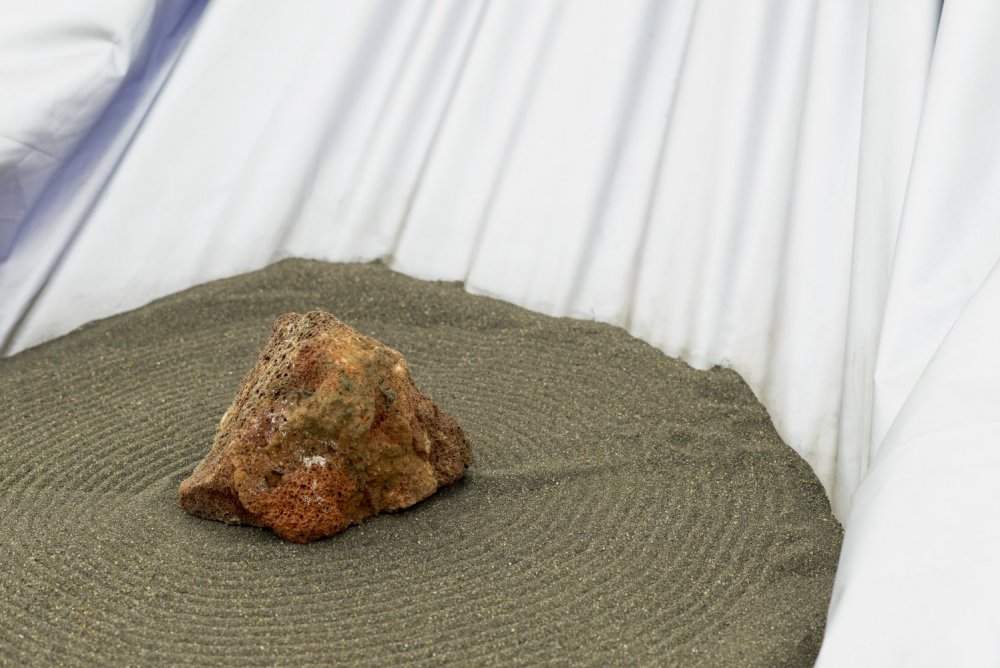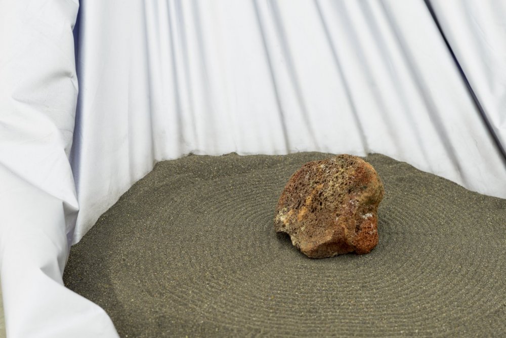 A corridor painted beige is titled ‘Cosmic Latte’, and references the shade chosen by a group of scientists in the early 2000s as being the average colour of the universe. The bright lights that run along the ceiling accentuates the stark emptiness of the hallway, with only a small steel box placed awkwardly on its own. Covering the top, a glass sphere similar to an astronaut’s helmet encases/protects an earthy substance.