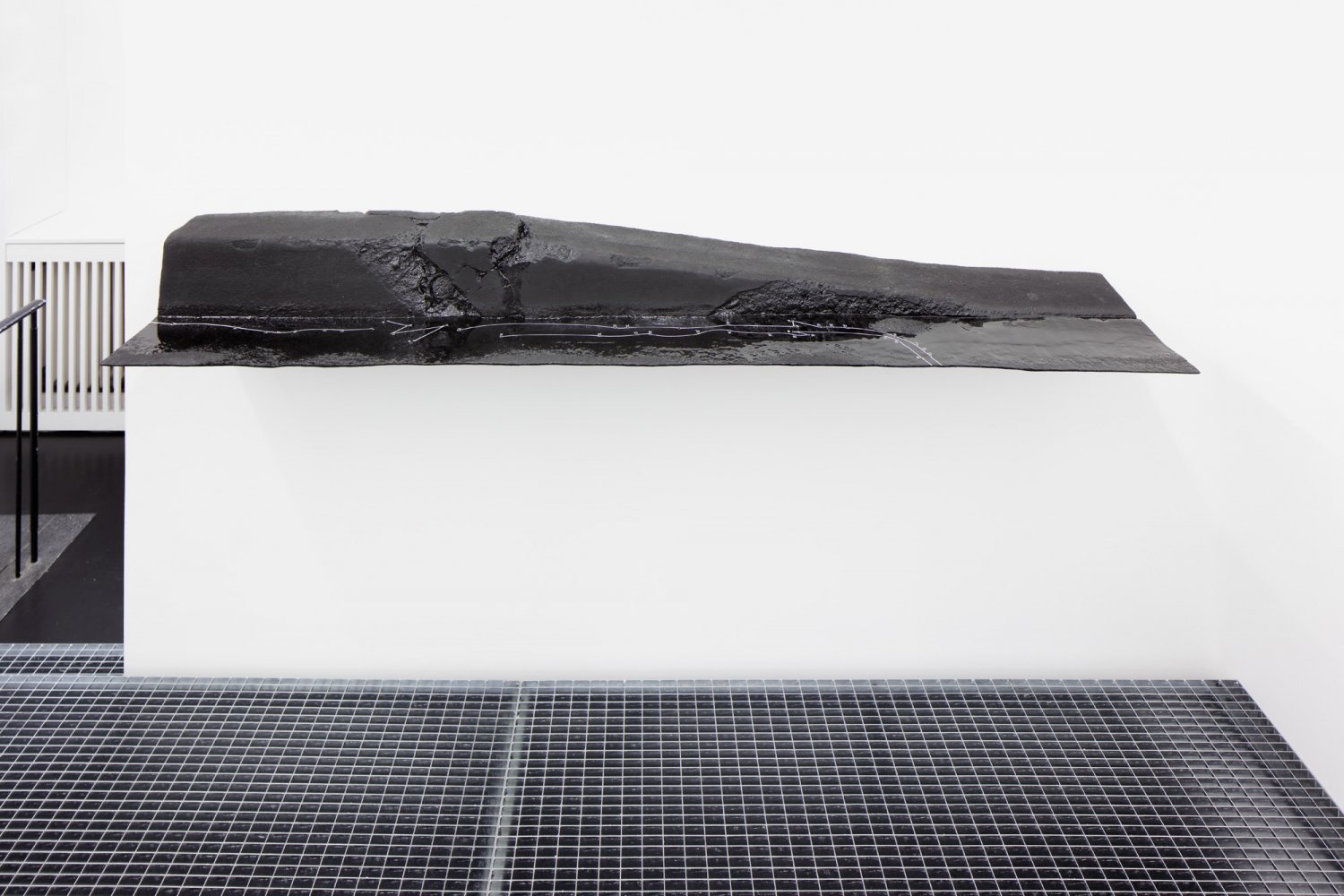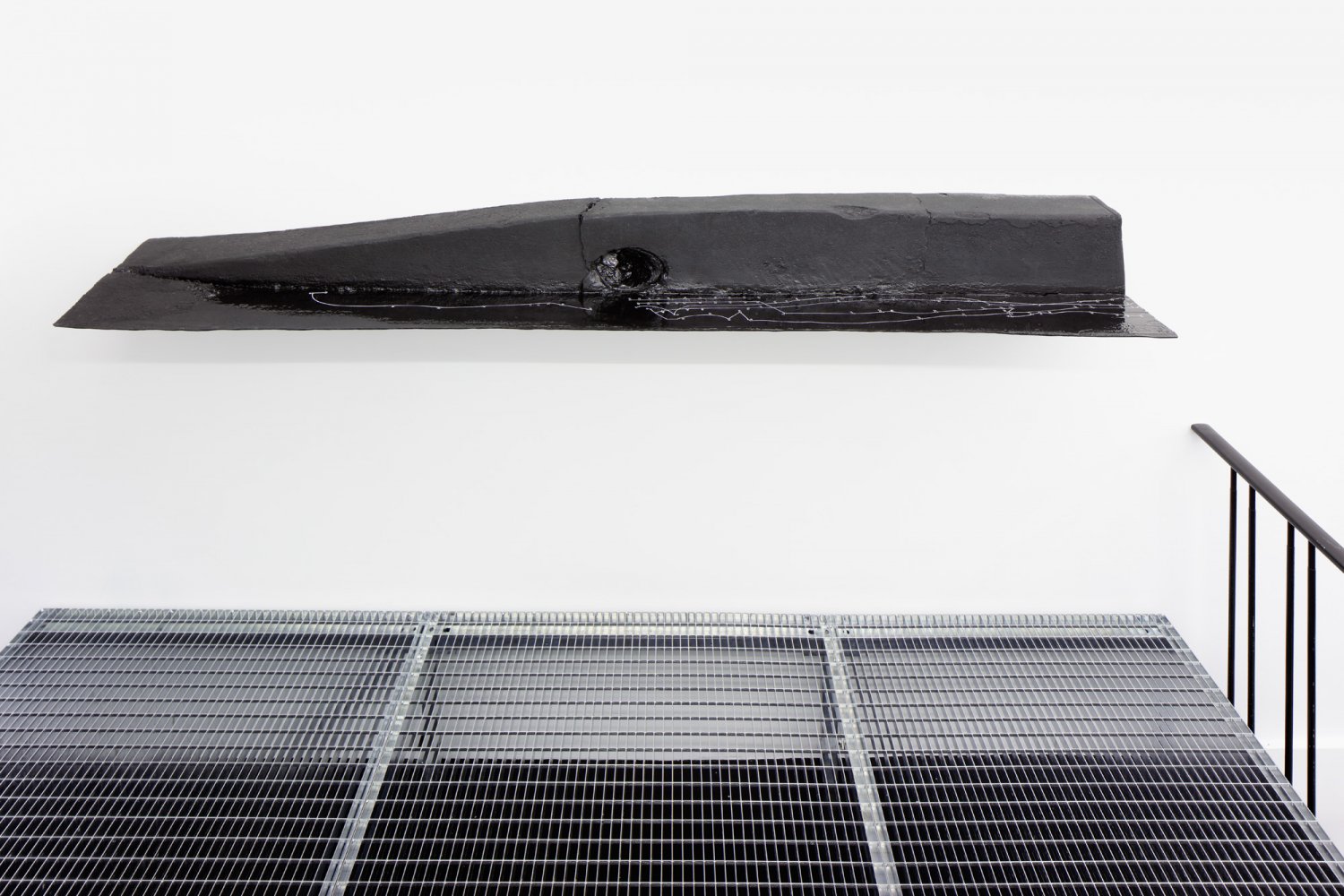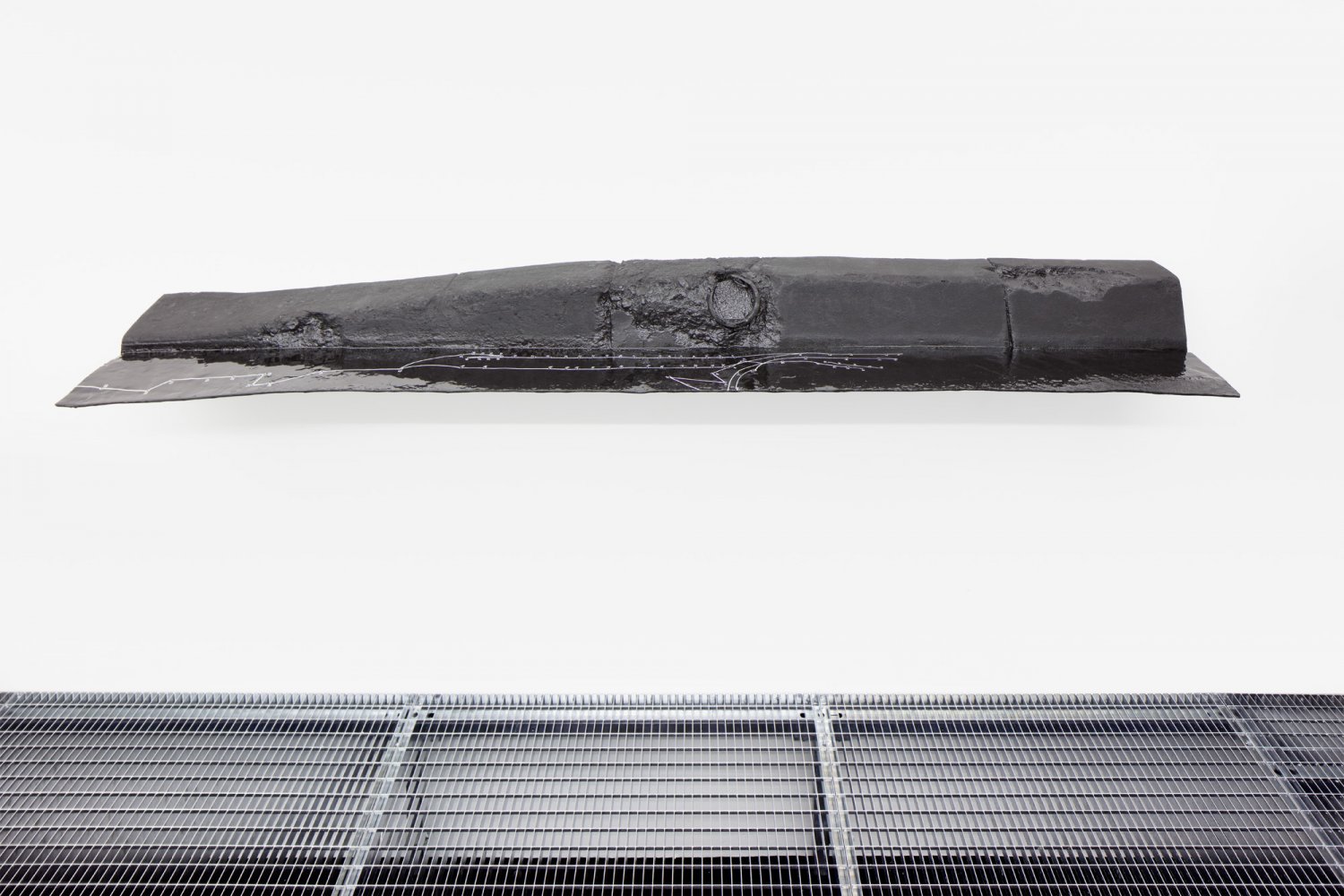 The minimal, but striking, installation elevates a selection of elegant fiberglass sewer openings from the otherwise unnoticed periphery. The wall mounted sculptures ‘Spasm Vessel’, ‘Floating Cleft’, ‘Veering Passage’ and ‘Brain Hollow’ are cast from underground outlets in the Los Angeles sewage system and finished with graphite and epoxy resin. Predominantly black and dark charcoal in colour, the drains slowly trickle water (high gloss resin) into a stagnant pool in the gutter, entombing cut white vinyl maps of the main arteries embedded along the bowl. The maps are charming and reminiscent of circuit diagrams, suggesting a complex network underfoot, and add an important narrative element to the works.