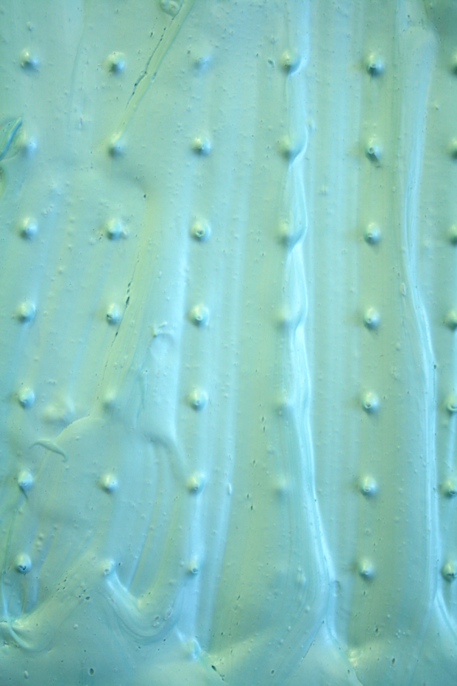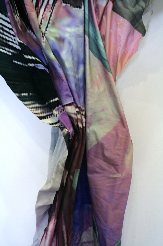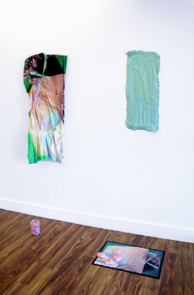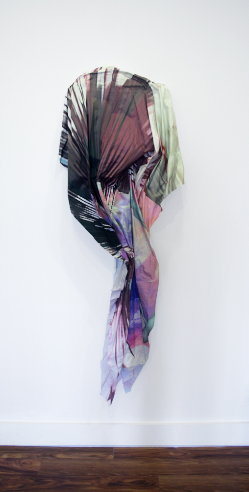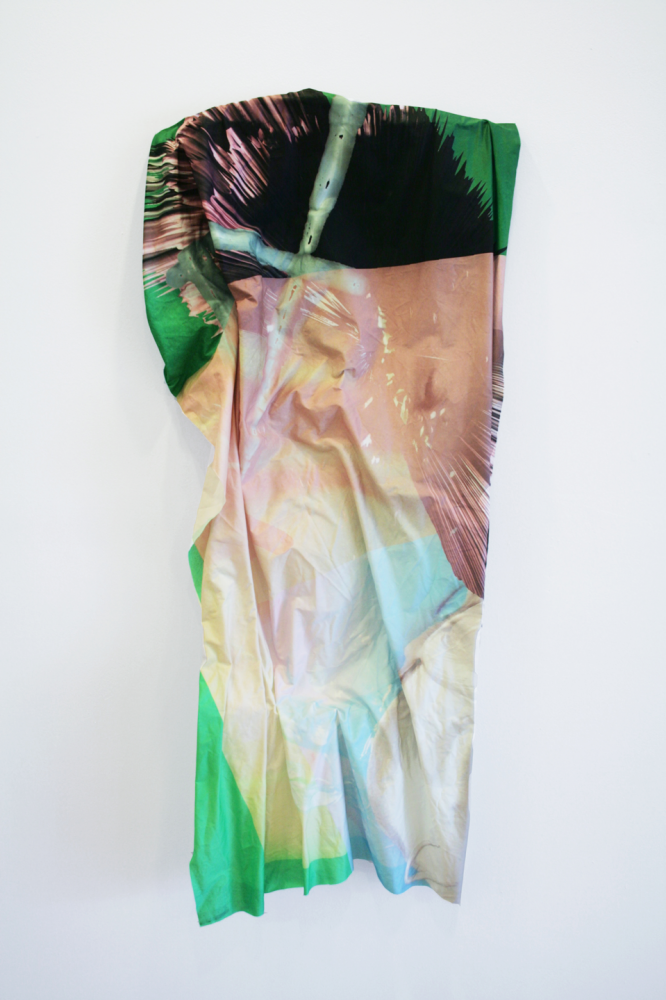 Most of the works drape around the space, hanging from the wall and ceiling. A luminous blue coloured piece of material titled ‘Koi’ sags down like flesh. Draped like clothing or curtain, the multicoloured digital motifs titled ‘Romance’ and ‘Afterparty’ are moulded into an organic shape. Placed on the floor, ‘Shmurda Rebel Chinx’ takes its name from a combination of trap songs in an attempt to “gunkify” its reading.