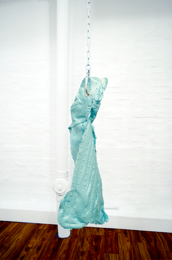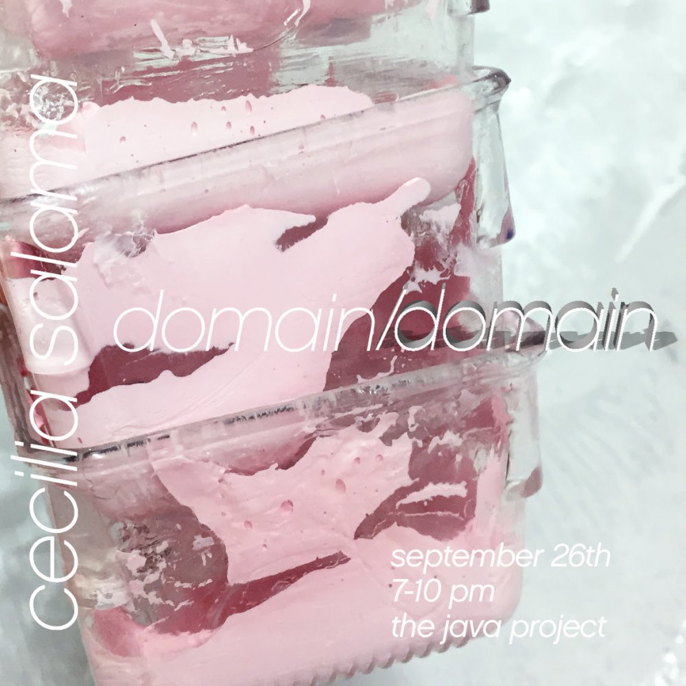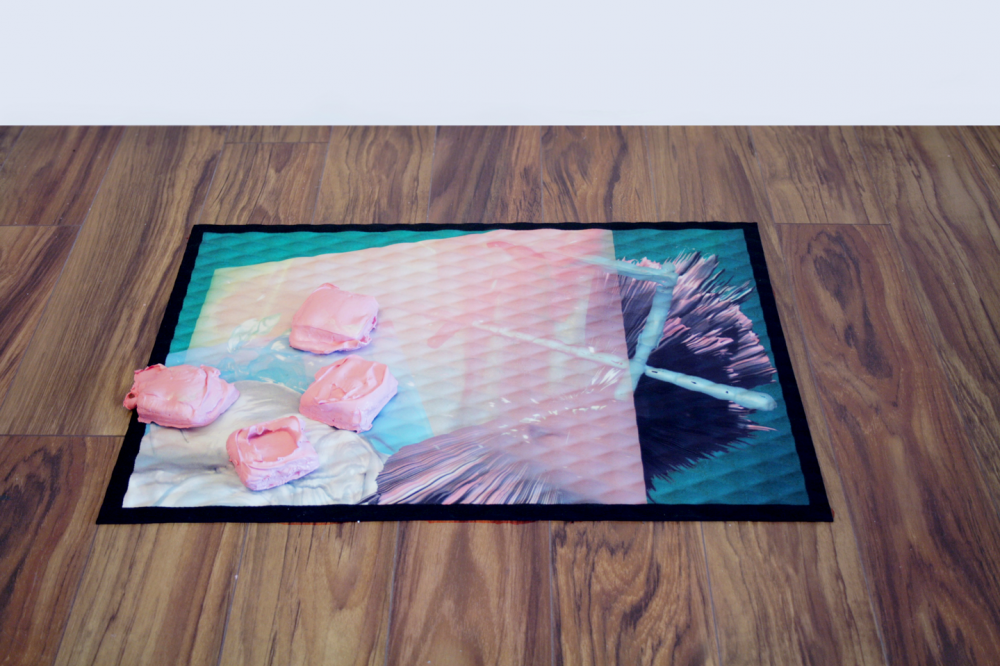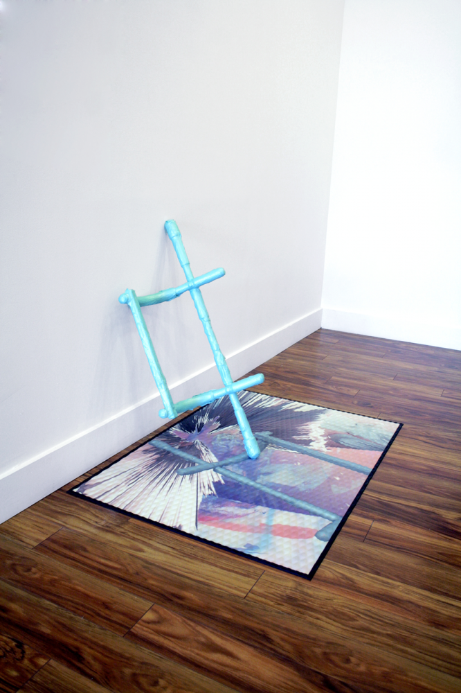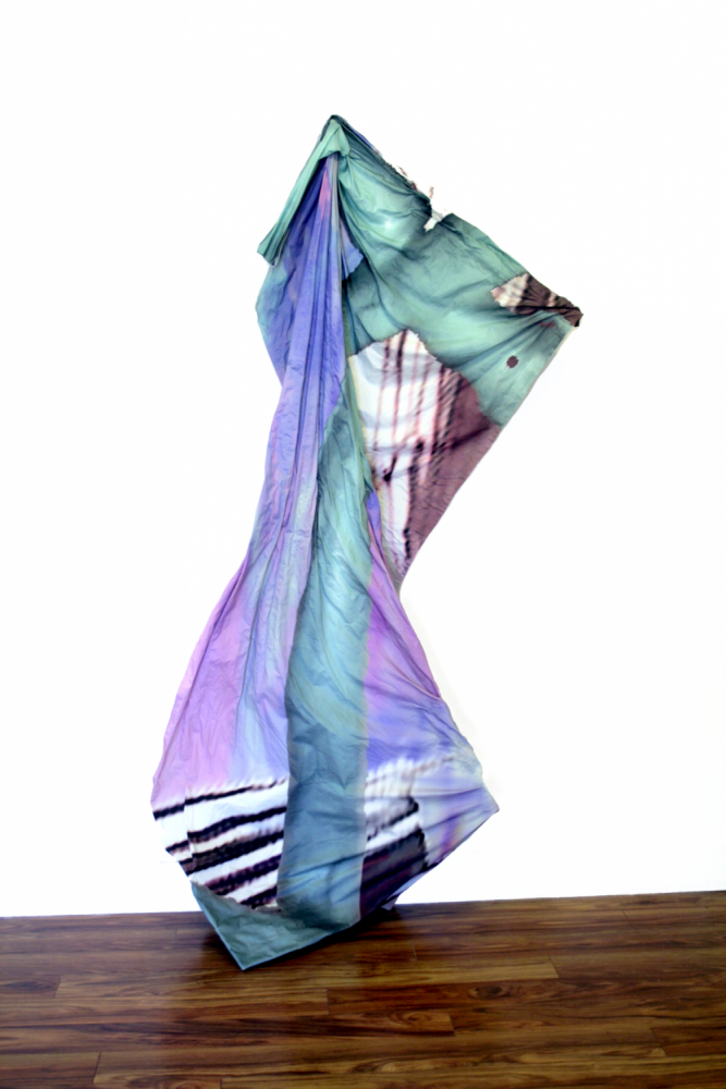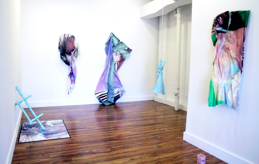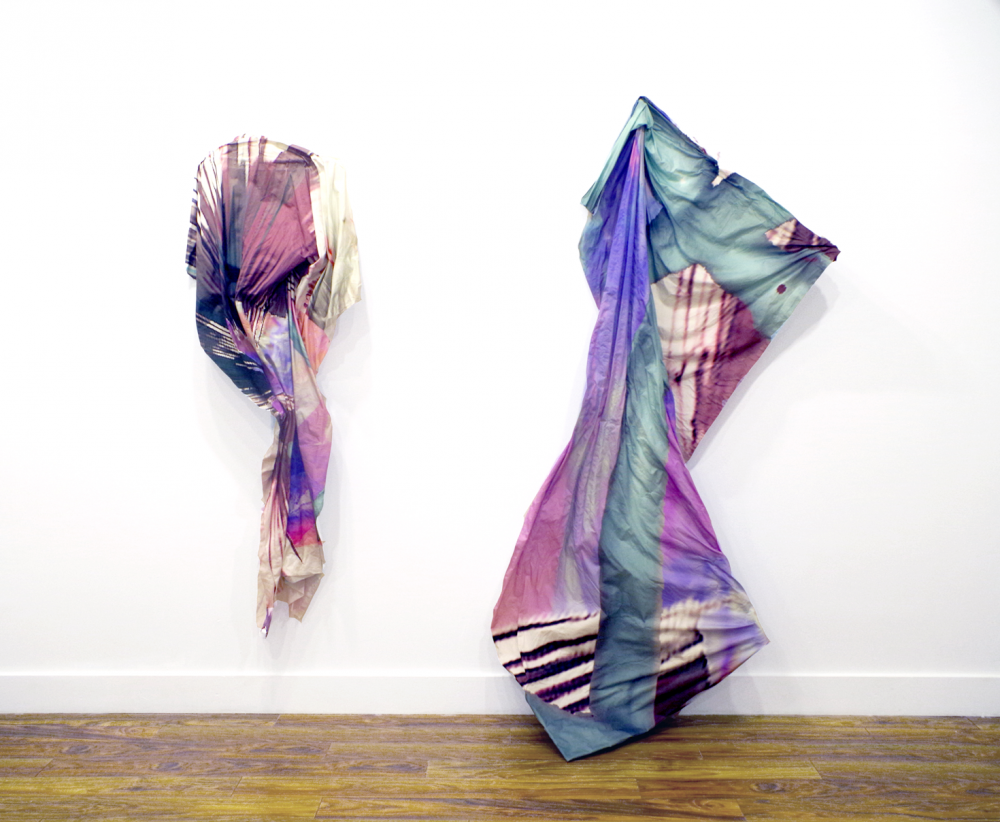 Domain/Domain, a solo exhibition by Cecilia Salama at New York’s The Java Project, September 26 to October 15, 2015, explored the overlapping spaces of our private lives through sculptural installation. Her bright and fashionable aesthetic combines printed photography processed into stiffened fabrics. Focusing on digital motifs of the home office/gym, close-ups of office mats, zip ties, and pull-up bars the work is abstracted into painterly collage that seeks to place the body in a fluid space between the IRL and URL.