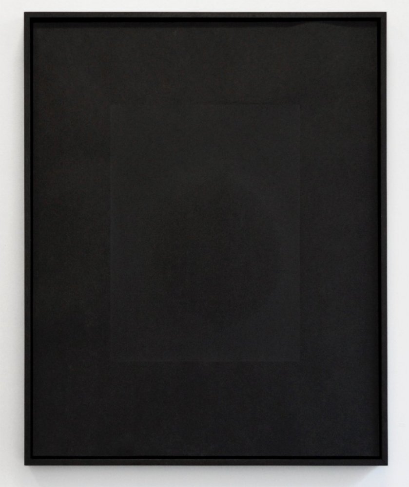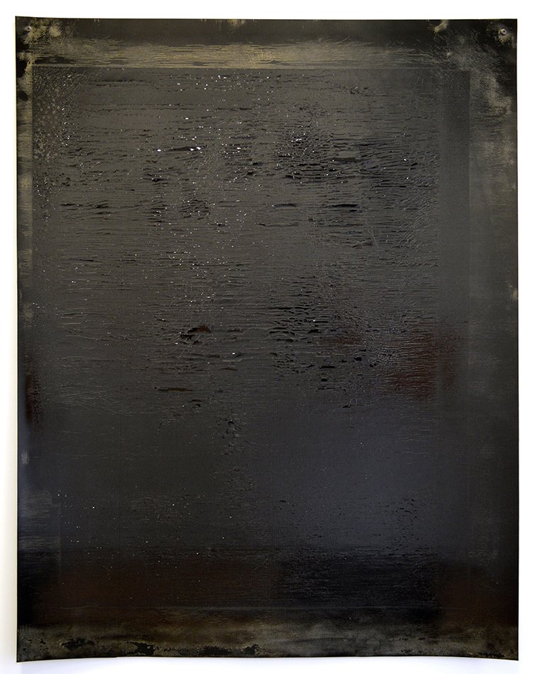 Rao looks at the relationship between surface and deep space by mixing materials that play off one another. Defying the mutability of black-on-black, or matte-on-shiny, the Sans Titres (2015) series absorb into each other, creating a porous effect of interpenetration. Using silkscreen across a variety of rubber, copper and wood paneling, the works begin with an image derived from a primary form of a pixel. Punctuating these works is the triptych of Tang’s ‘Document from Like An Intruder, The Speaker Removes His Cap’ (2015), on which sheets of adhesive plastic collect cigarette butts from his previous exhibition, here tamper with drips of butterfly pea flower tea. Originating from one ‘document’, panels are dispersed, forming what Tang calls “a state of inextricable separation, a self-extraction from the self”.**