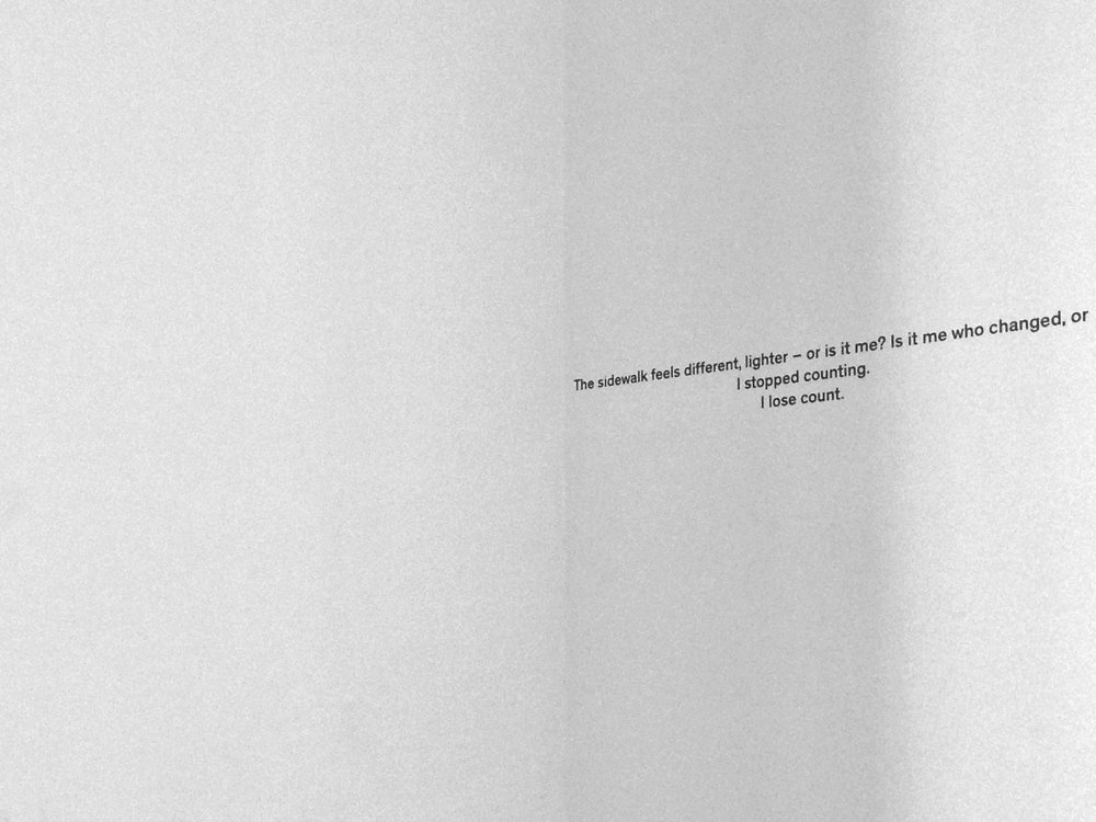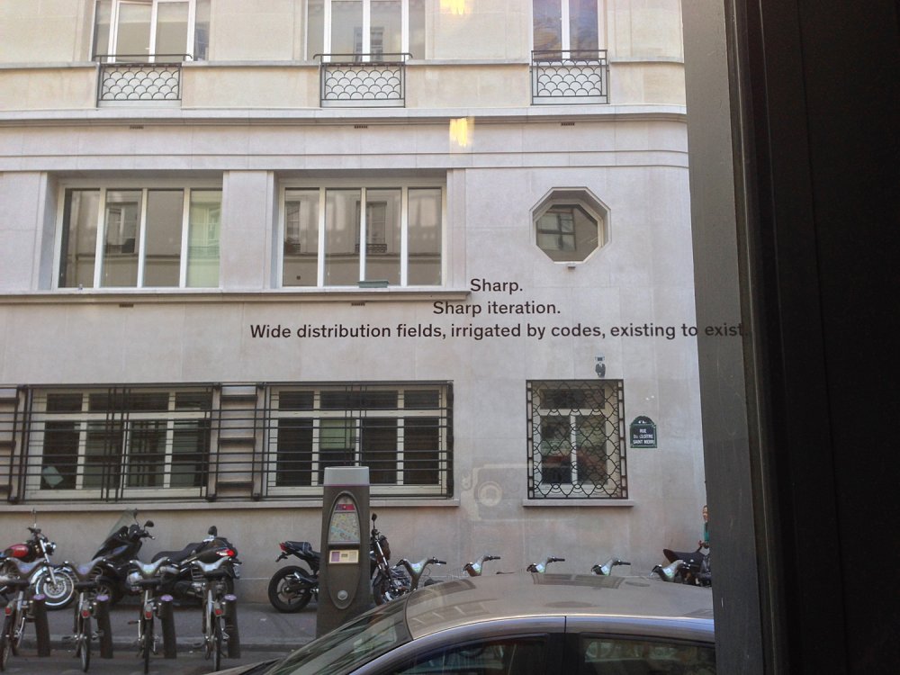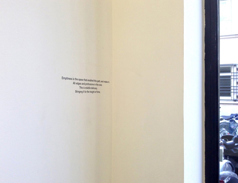 Rao’s monochromatic and abstract language works its way through a variety of media and interrupted by Tang’s poetic texts of adhesive lettering on the wall: