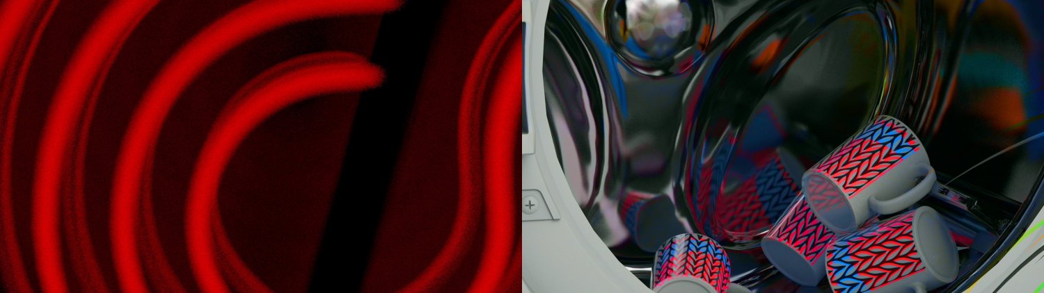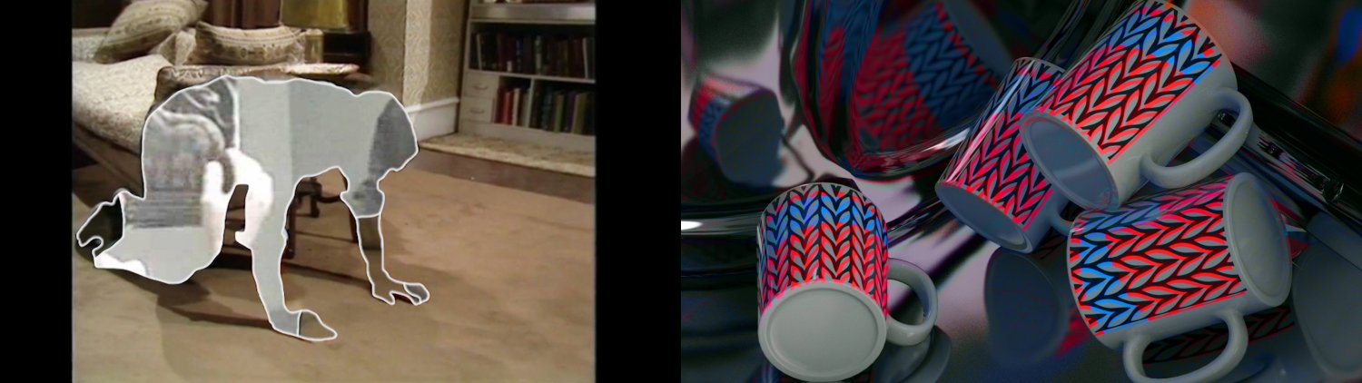 In the two-channel video that plays across the screens, a lot of the background is blue. The blue replaces what otherwise would have been the background of objects, domestic appliances, such as washing machines, and a haunting and occasionally transparent figure that is made of light as though it has been cut out of paper and held up to a lamp. It crawls across the blue corner-less floor. Mugs with patterns on their sides become just patterns in this blue, as though the porcelain is dismissed and dissolved in its hue, leaving the pattern floating and glitch-ing, like an inverted shadow.