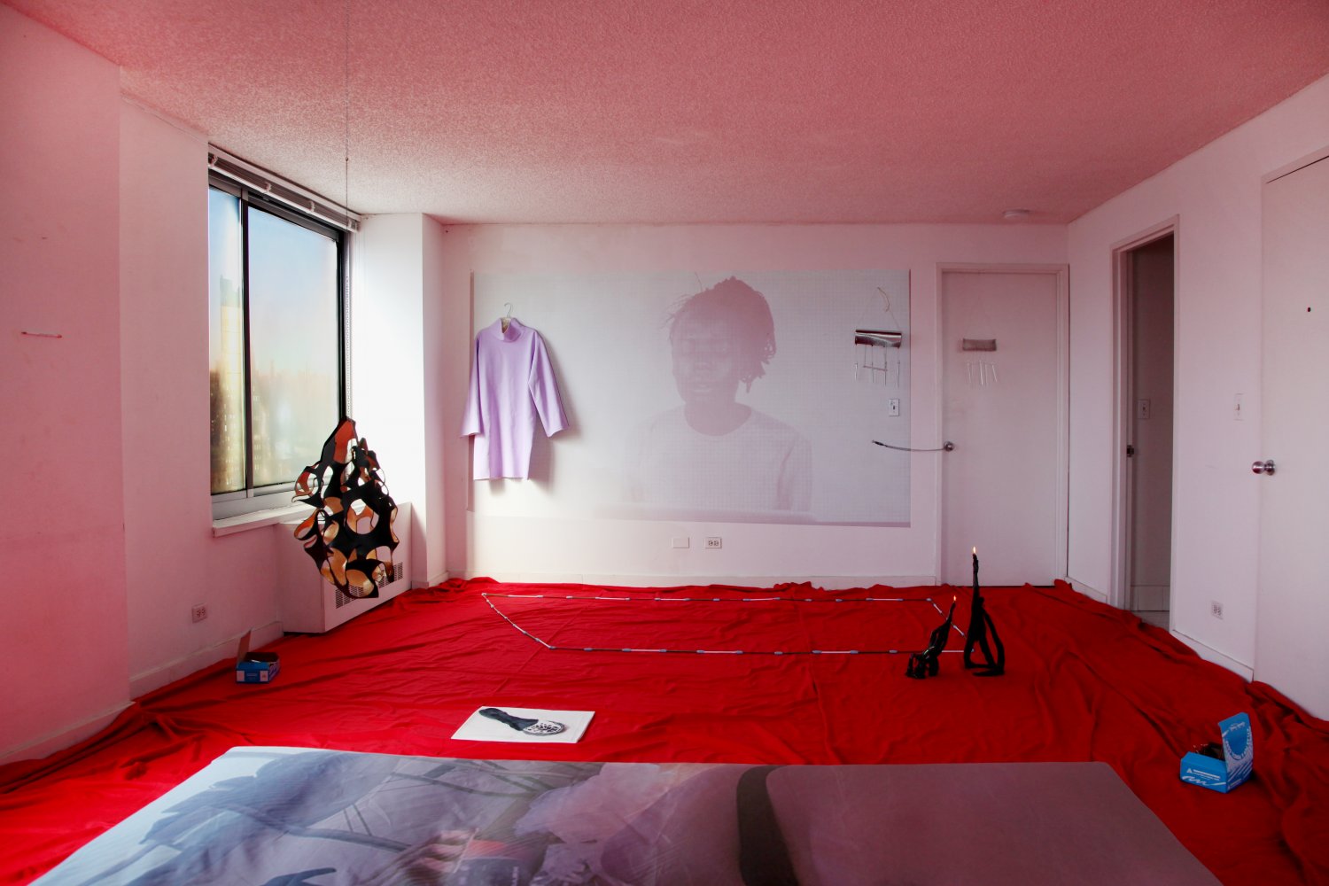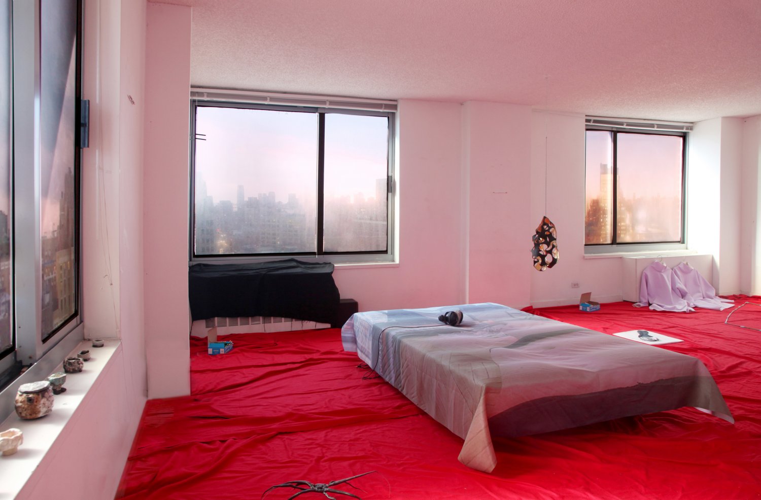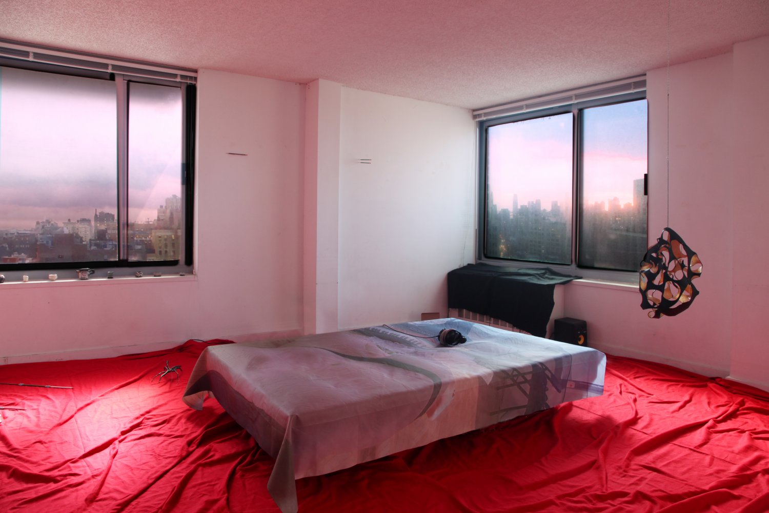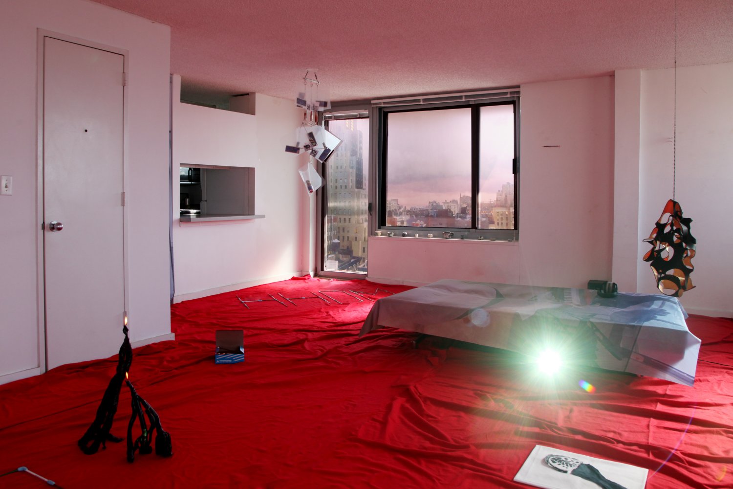 f-holes is laid out as an environment which seeks to reevaluate relationships between the art object and the sonic object, according to the short press release. It displays works by artists and musicians and those who identify as both or in between. With views of the NYC skyline and photographs taken possibly at sunset the room in the photographs glows pink. Or perhaps this is caused by the red material that lies on the floor under each work, projector, bed, footprint, wind chimes, box of engraved pencils, etc.. Or perhaps it is some kind of edited-in after effect.