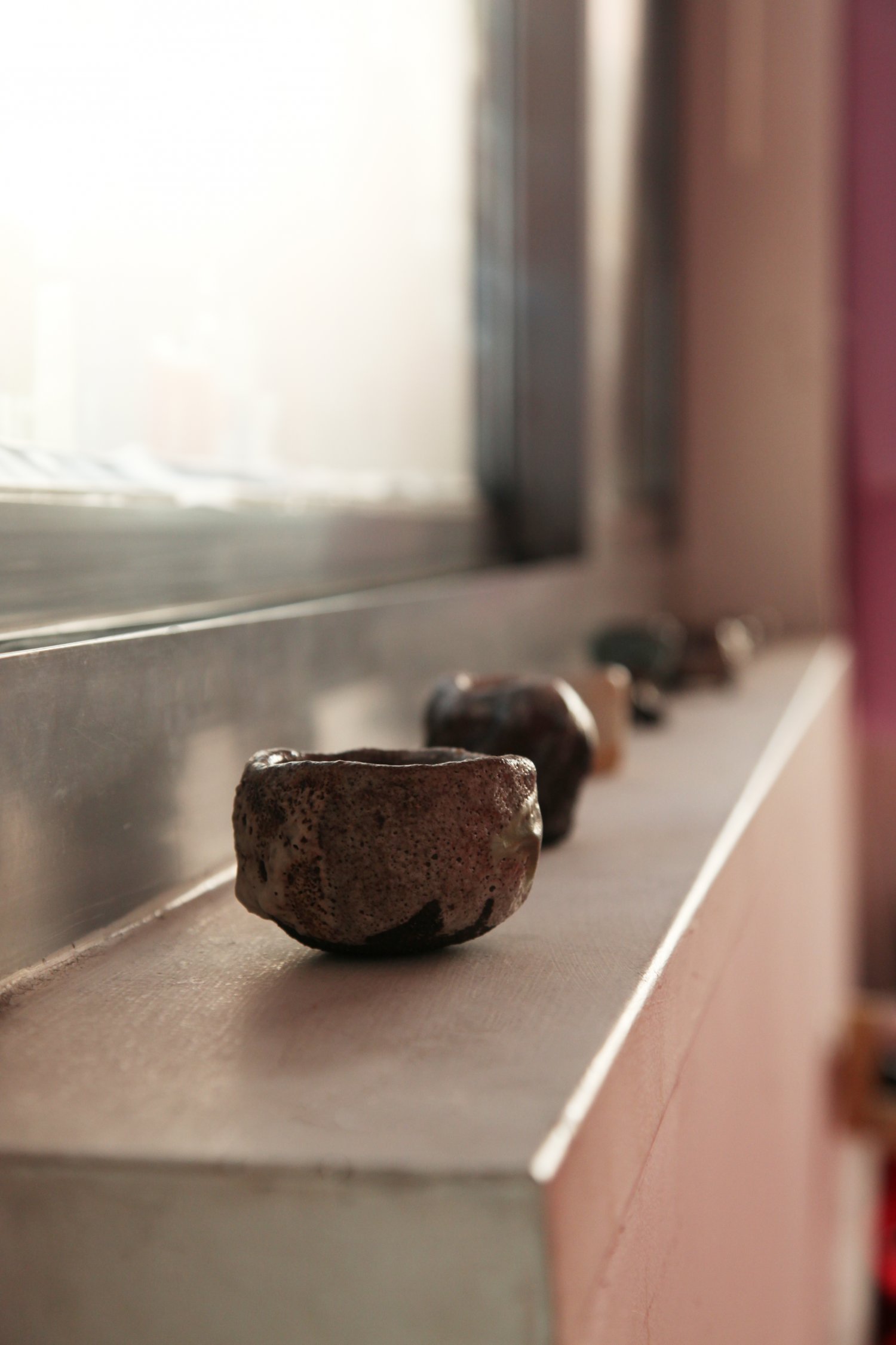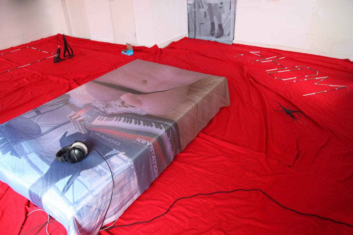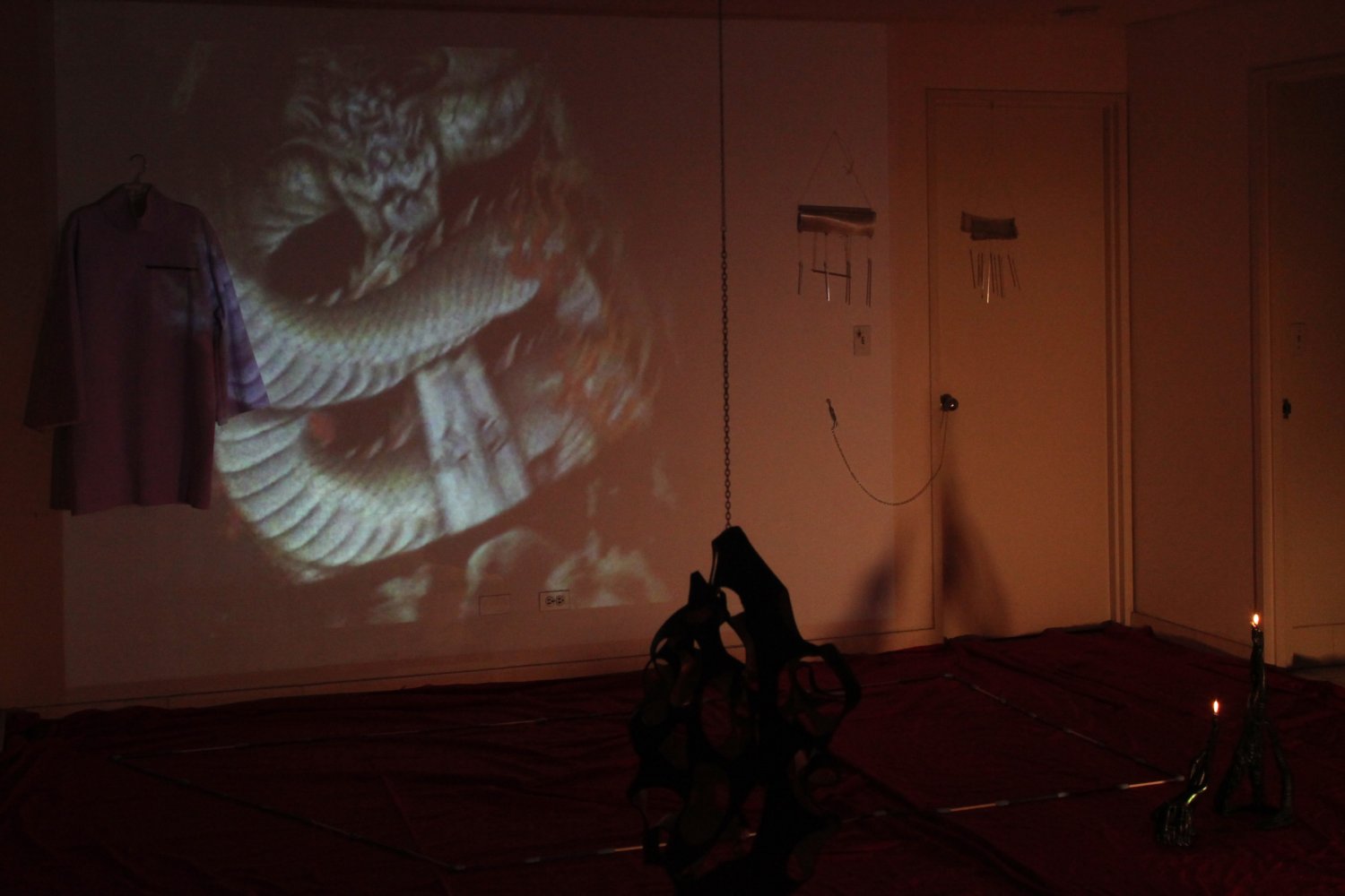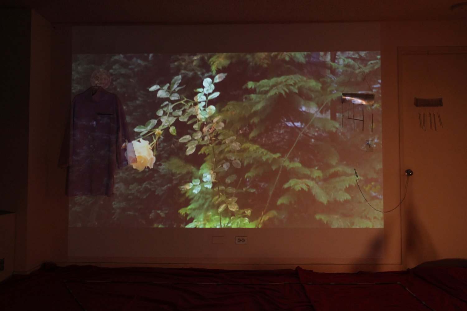 f-holes is laid out as an environment which seeks to reevaluate relationships between the art object and the sonic object, according to the short press release. It displays works by artists and musicians and those who identify as both or in between. With views of the NYC skyline and photographs taken possibly at sunset the room in the photographs glows pink. Or perhaps this is caused by the red material that lies on the floor under each work, projector, bed, footprint, wind chimes, box of engraved pencils, etc.. Or perhaps it is some kind of edited-in after effect.