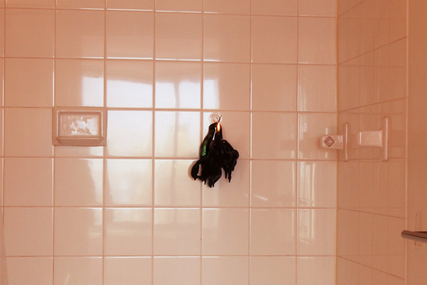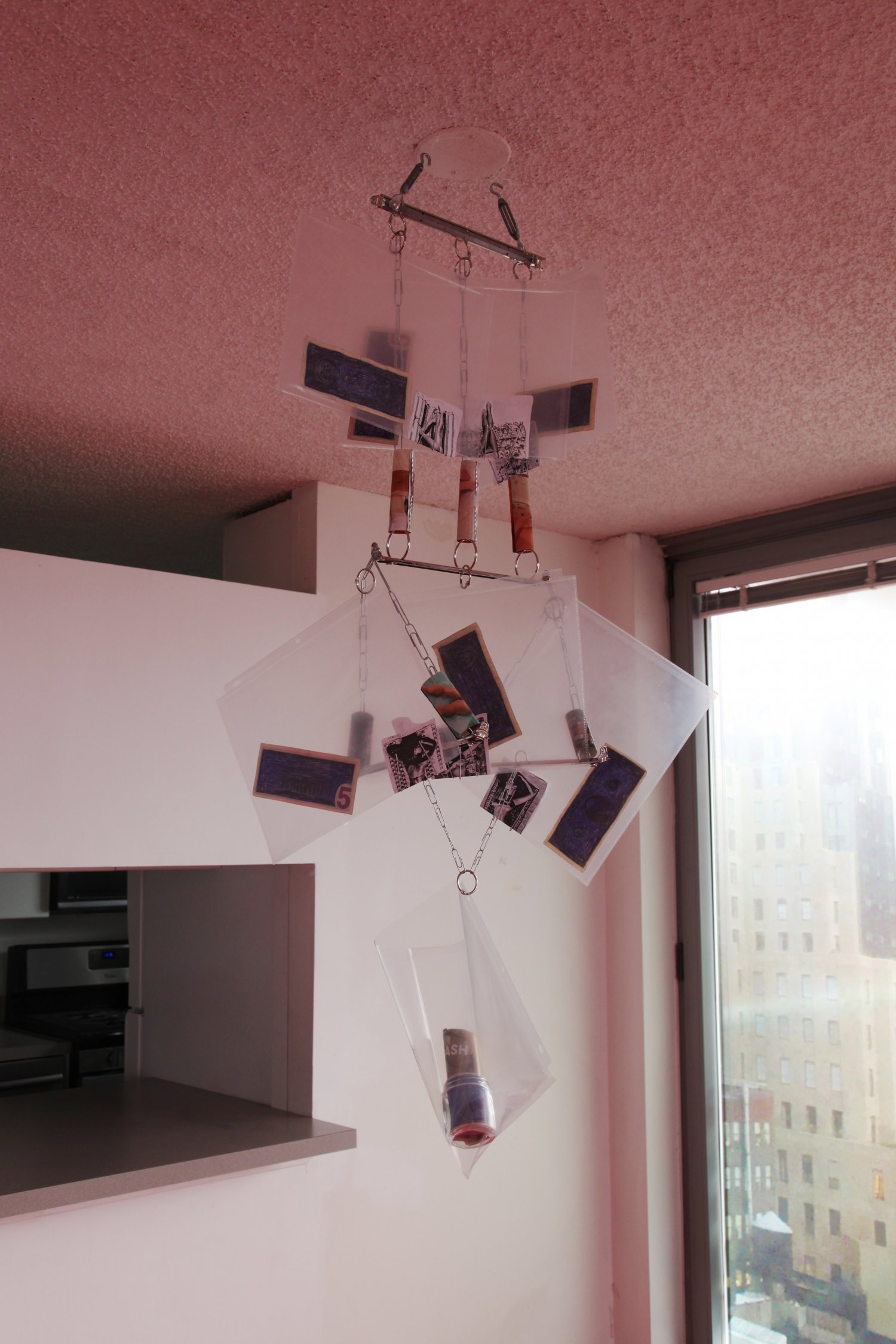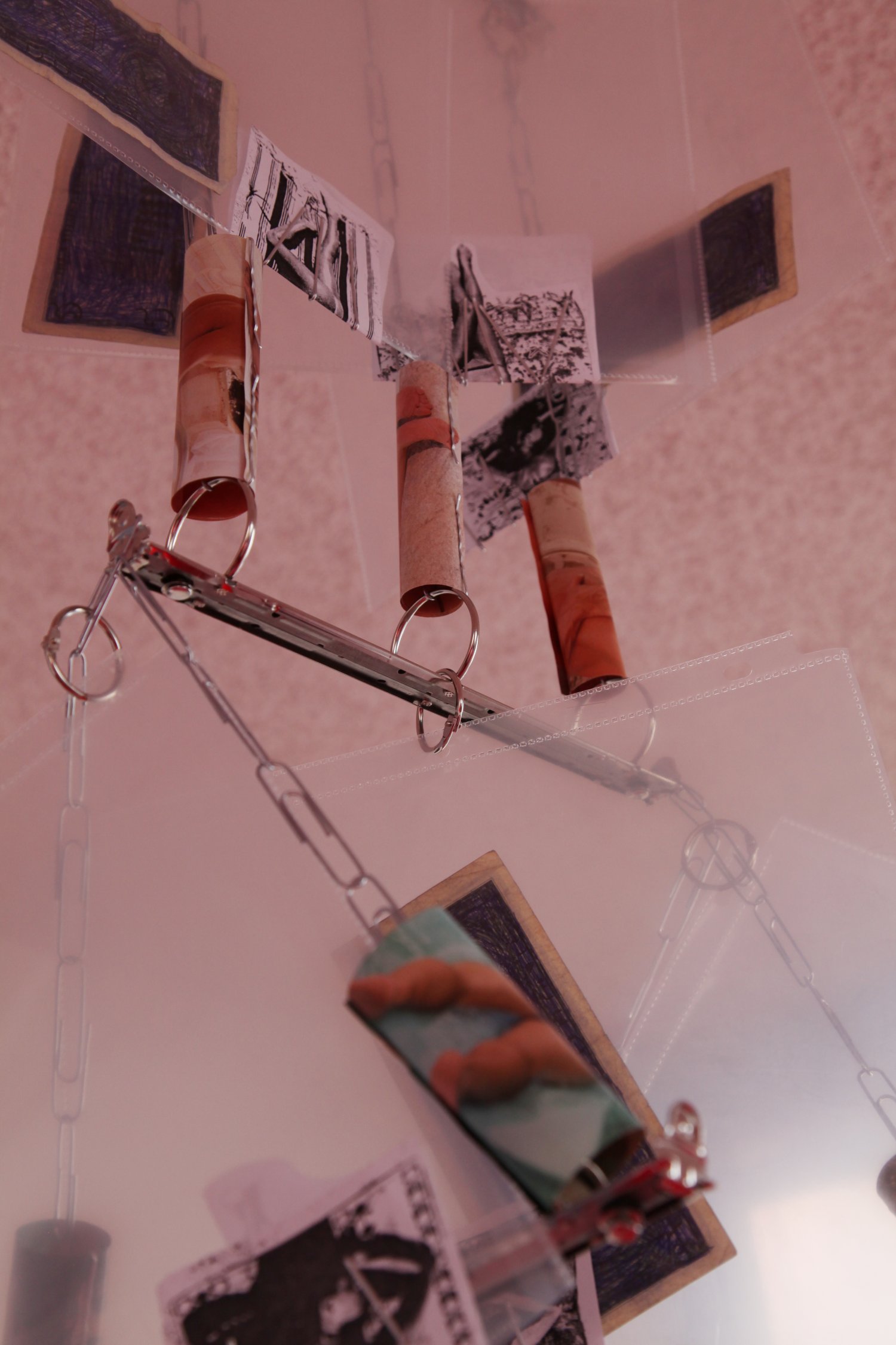 Signe Rose and Lilli Thiessen‘s pieces both hang from the ceiling and pertain to a tone of suspension and fetish. The former’s is a kind of hole-y leather lampshade with black exterior and gold interior, and more empty space than physical connections. The latter’s is another wind chime of sorts but this time laced with hooks and loops and plastic sealed see-through bags holding images.