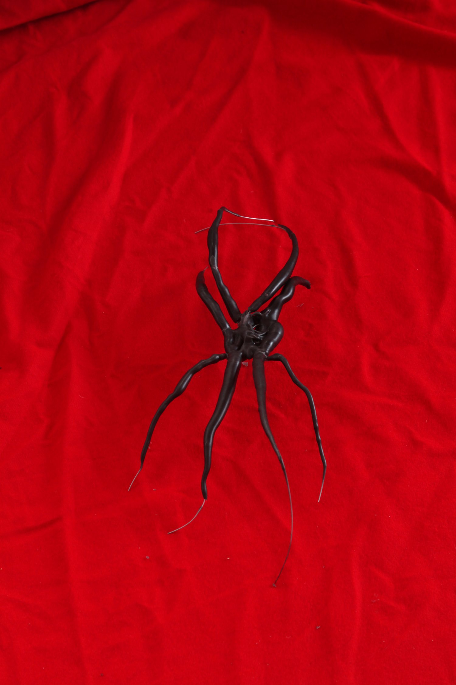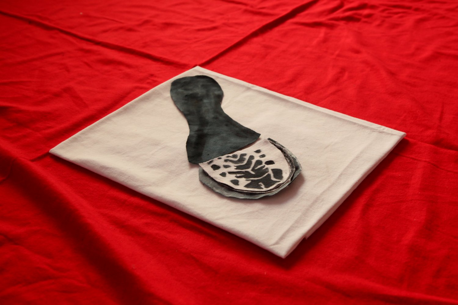 Other objects by Elisabeth Greinecker and Anna Holtz, and Berlin-based Lars TCF Holdhus and Martin Kohout (both pairs collaborating) also influence the room. Greinecker and Holtz have made a series of sculptures out of components: wax, wire and wicks, occasionally nail polish and dust. The taper is lit and the wax melts away from the wire, leaving just the bare wire component on show and it feels like the beginning or end of a tiny concert, or like an acoustic song with all layers stripped back and some kind of other atmosphere exposed and fetishised somehow. Julian Tromp’s ‘The Strip’ is a soft and worn insert of a shoe. The front half of the insole has a painting in laid over the top of it of the imagined inside of a foot, bones and toes. This art object doesn’t feel like a print imprinted and caused by a physical foot and left redundant, but something that hovers, imagined and proposed.