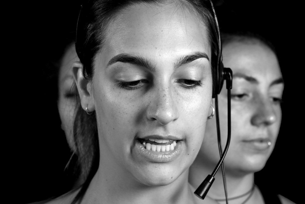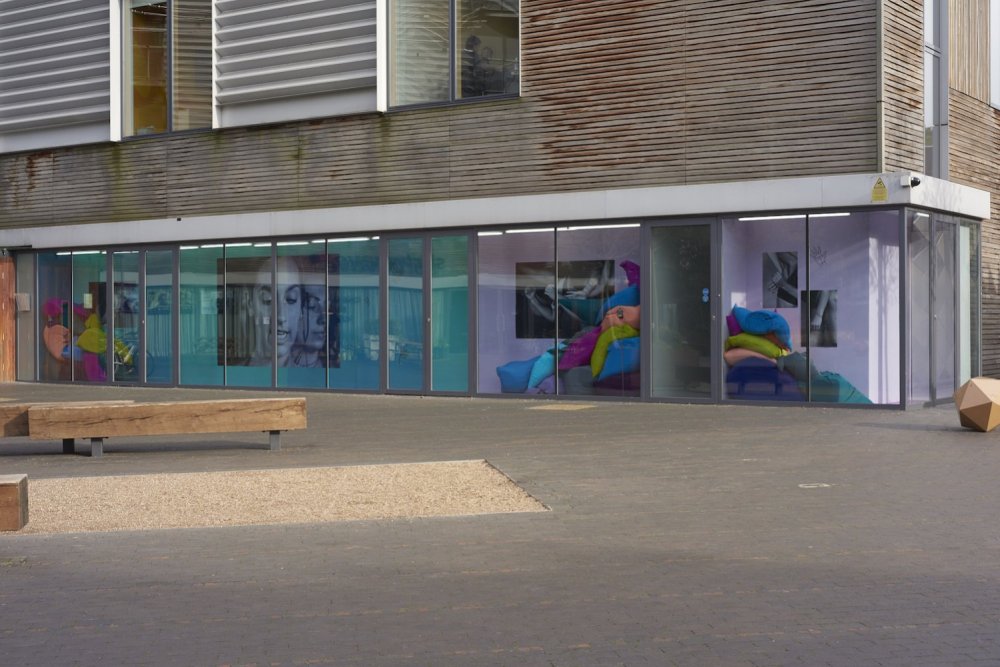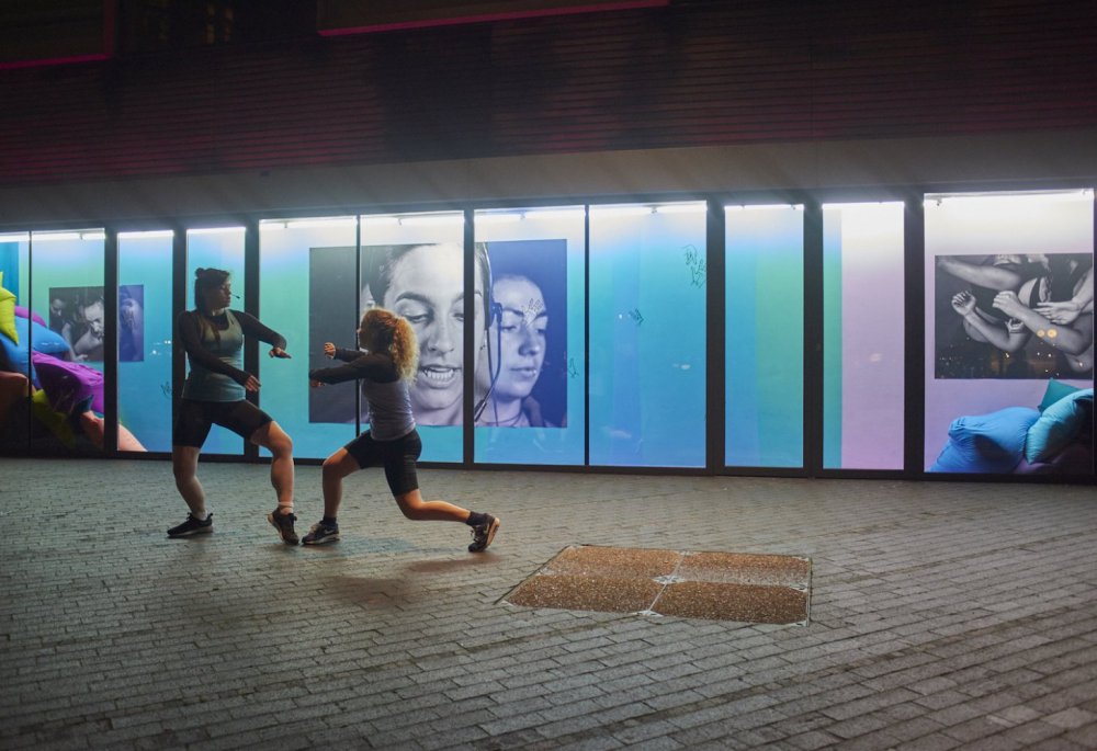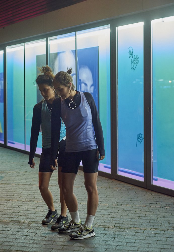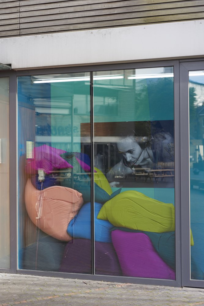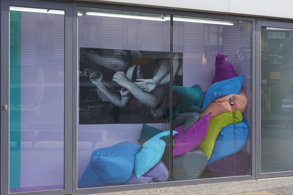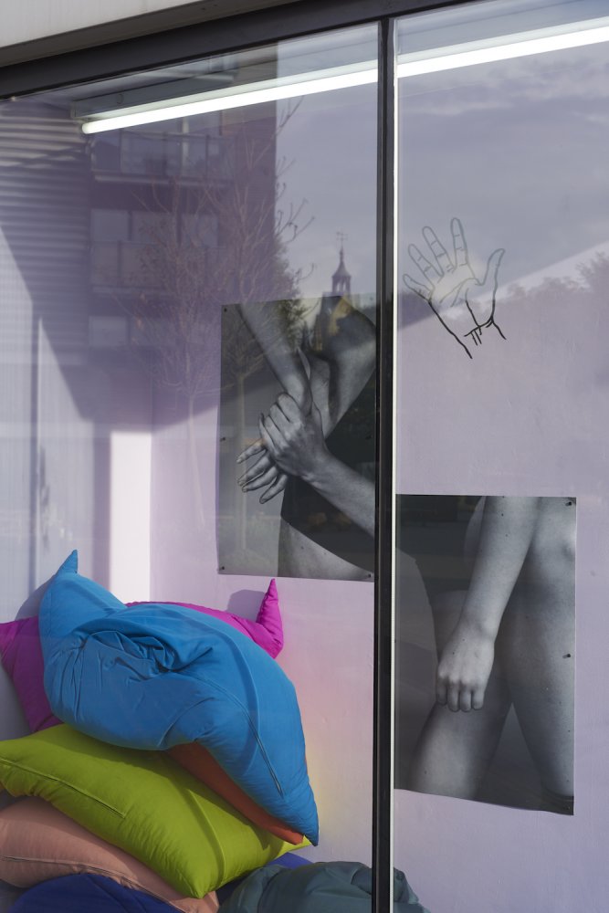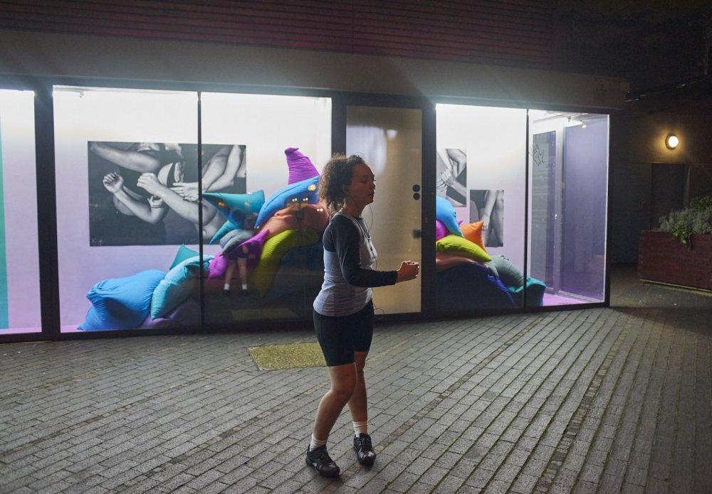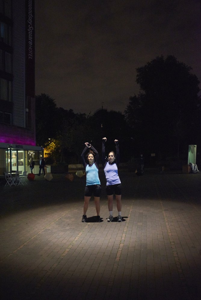 Extending out into a public square, Mute Rehearsal uses the mouth as the site of misunderstanding in exchange and dialogue; the transparent collision between internal and external layering of bodies creates a messy and visceral depiction of speech. Notably, the subjects of the photographs and the live performance are women. The gendering of the exhibition reflects Sagar’s ongoing interest in the relationship between narrative, surface and the female body. For this one in particular, the works reference fitness blogging and other online communities focused on identity creation. The flesh of the body becomes a malleable tool to stretch between the complexities of self confidence and disempowerment.**