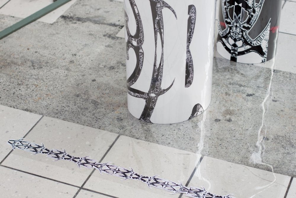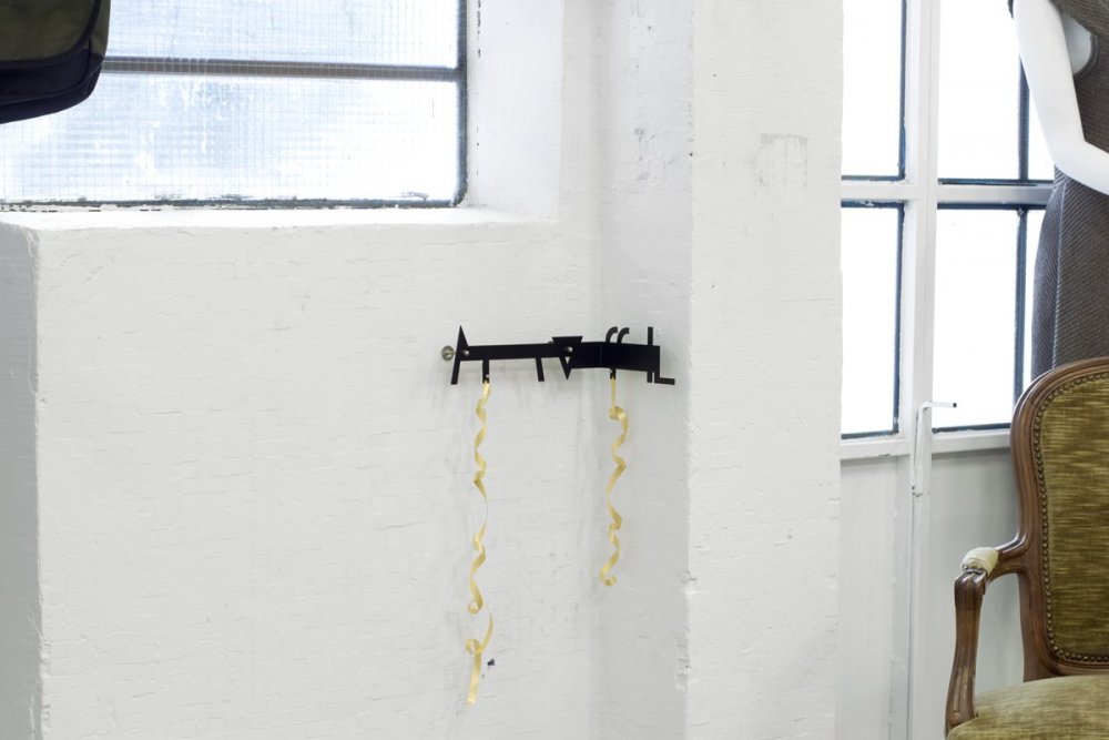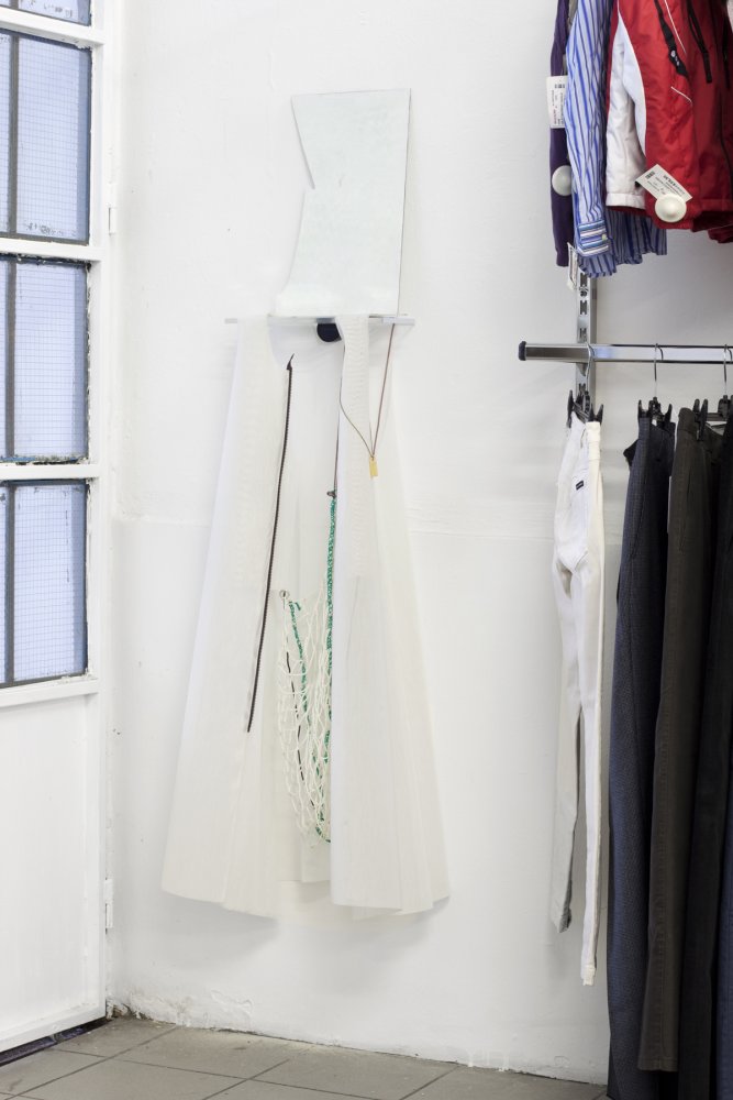 In contrast, some of the works camouflage into the aesthetic of the commercial space like Diego Gualandris‘ oil on canvas painting ‘UAM’ (2015) or Lorenza Longhi‘s assortment of fabric, curtain, a necklace, zips and a USB hung on metal rings amongst other clothing titled ‘Empathy is performing (Orchids on the desk)’ (2015). The pile-up of varied practices —which also includes work by Alessandro Agudio, Benni Bosetto, Barbara and Ale, Costanza Candeloro, Giovanni Delvecchio, Matteo Nasini, Margherita Raso and Riccardo Sala —create an object-oriented dynamic between the canonical and maverick, the function of capitalist and/or art object, as well as the possibility for transformation and risk.**