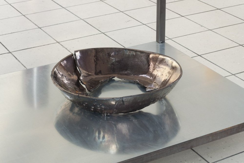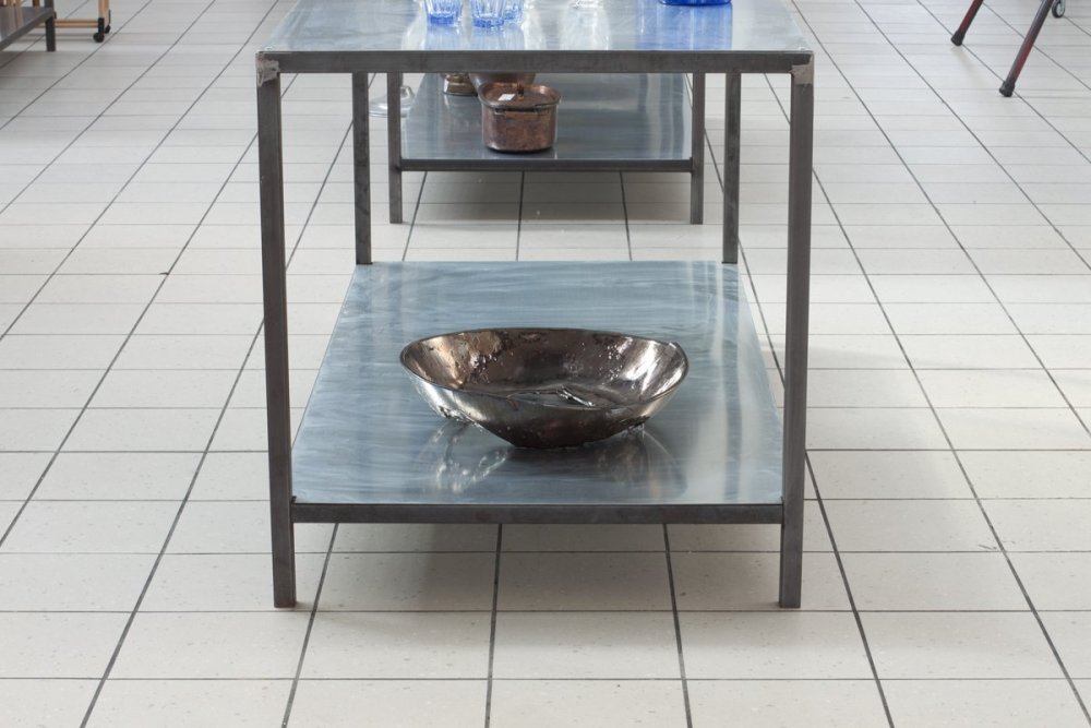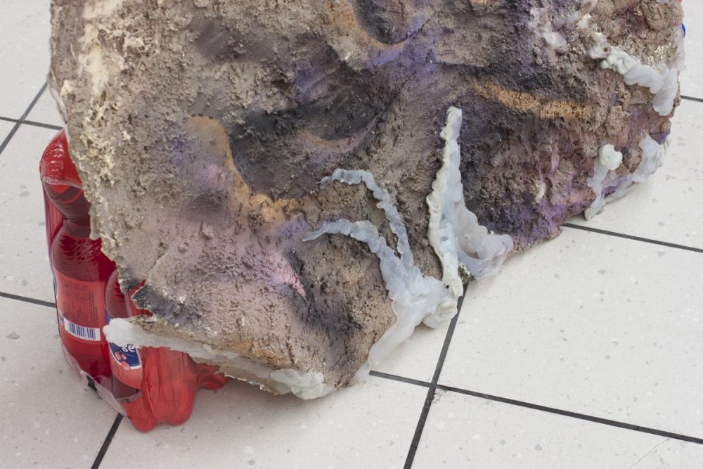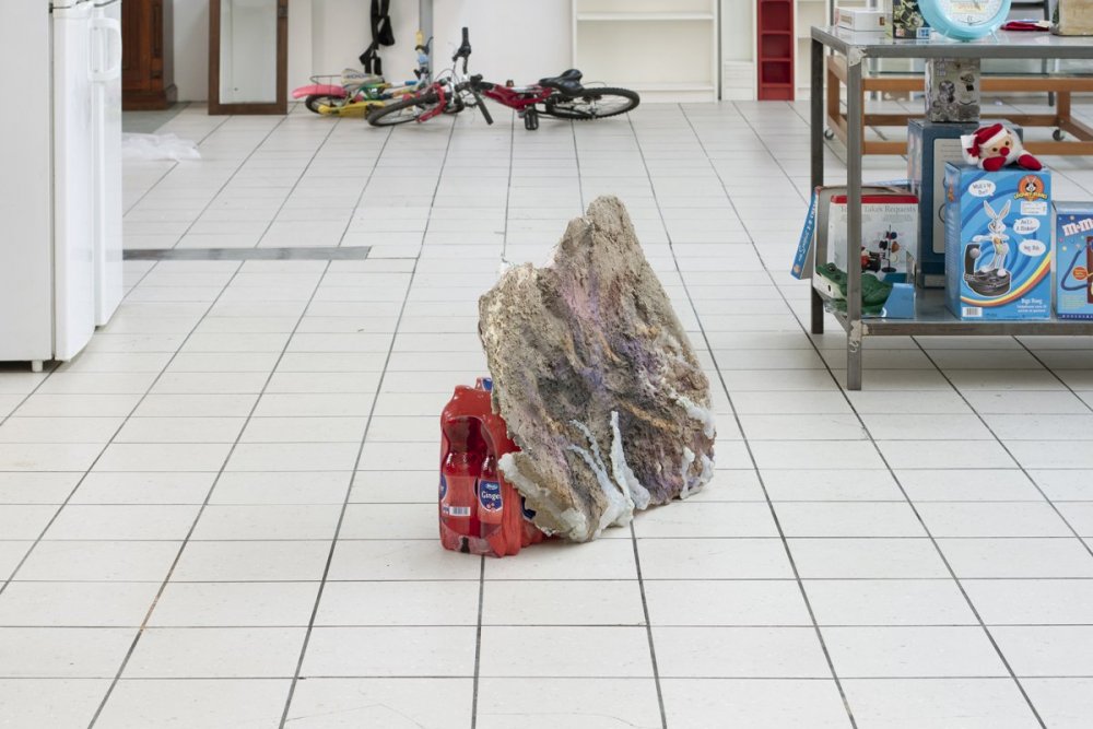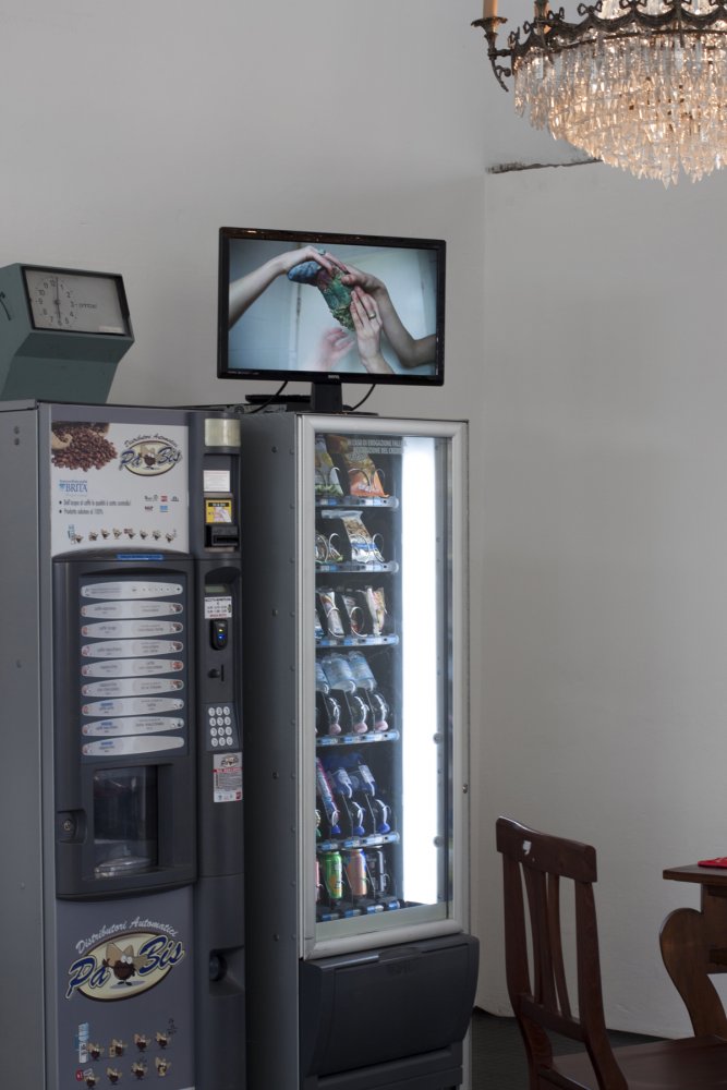 Vorrei non vederti oggi… is diverse and multi-directional, spanning sculpture, object assemblage and video. Some works are deliberately clunky and out of place, such as Derek Di Fabio‘s 59’ looped video archive titled ‘Shawl (Scialle – edition 2015)’ (2008-15) that places a TV monitor on top of a vending machine, or Michele Gabriele‘s ‘Holdy’ (2015), a sand and silicone rock sculpture leaning on a crate of bottles in the middle of the room.