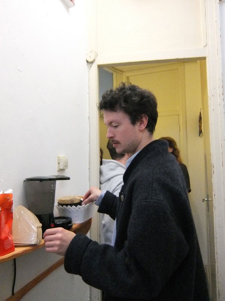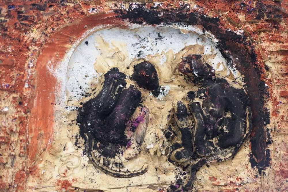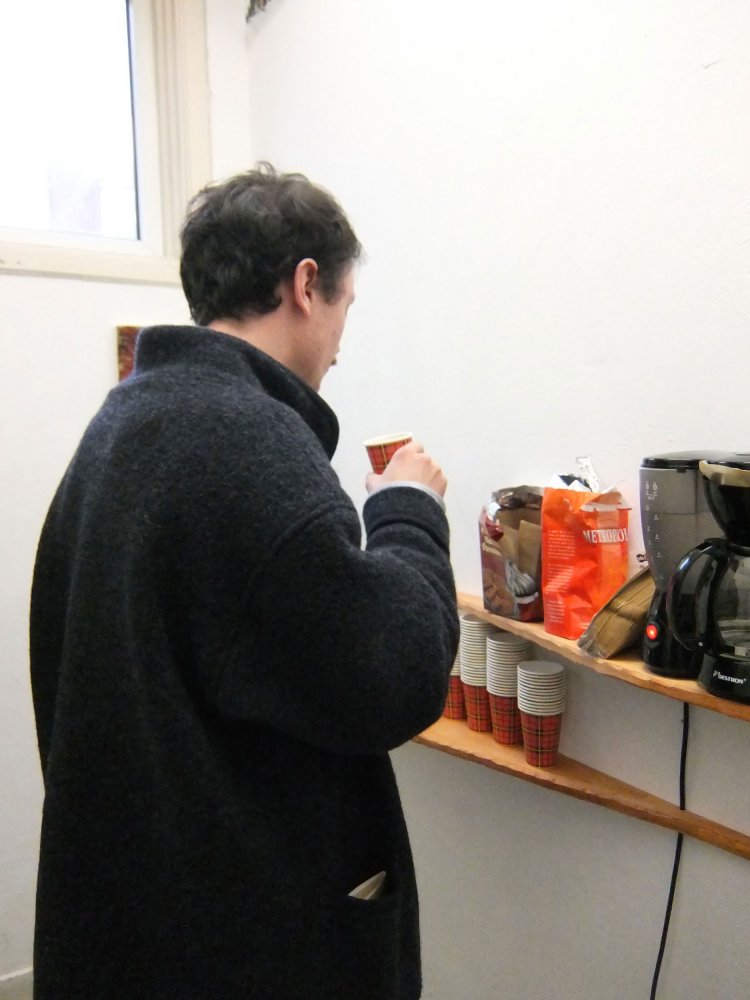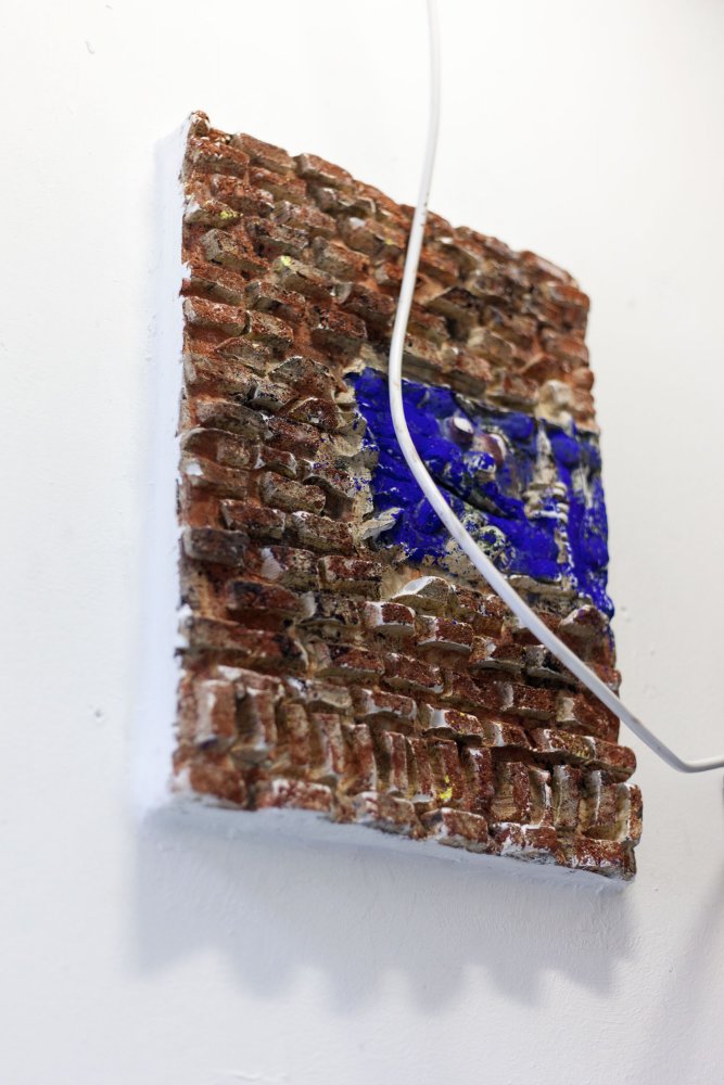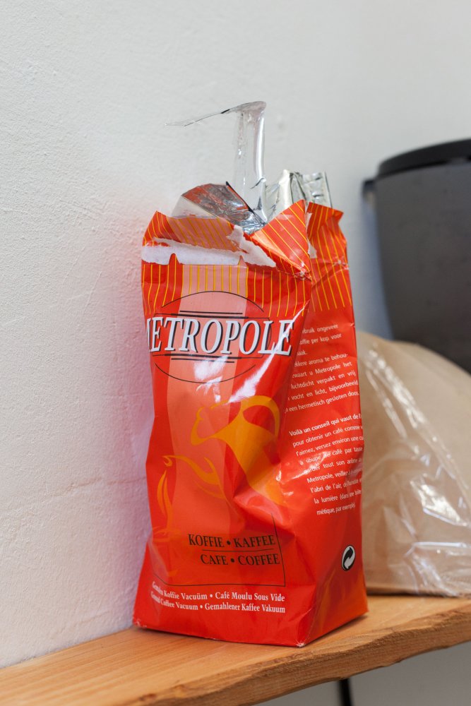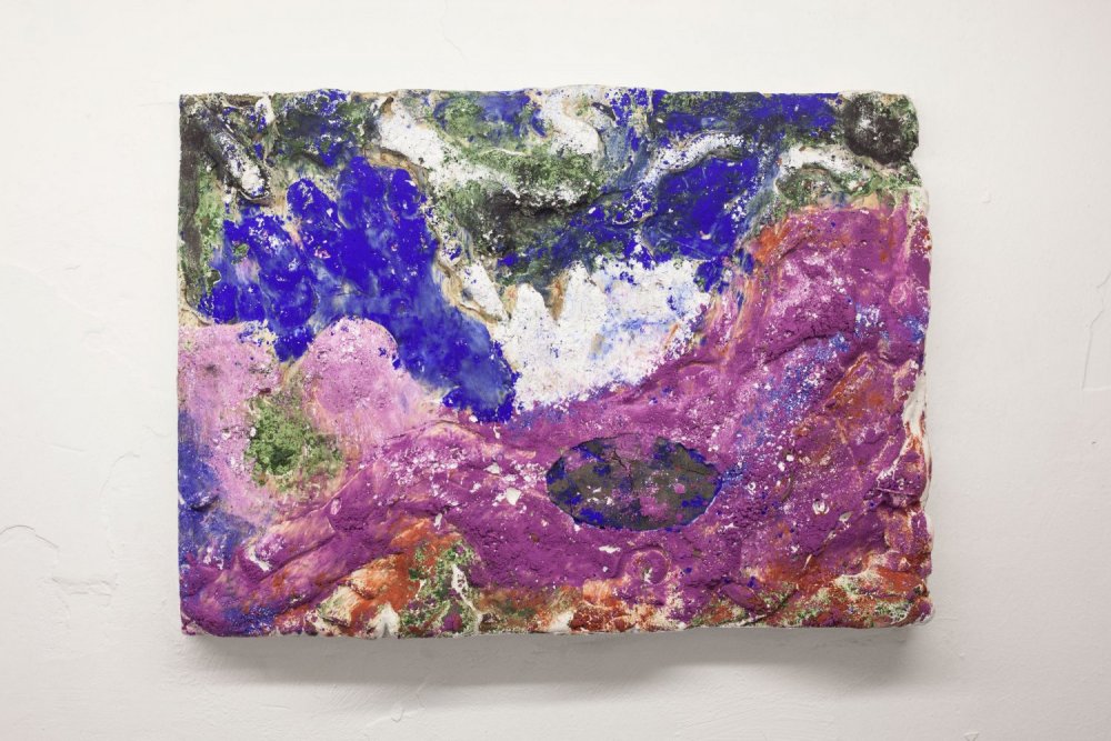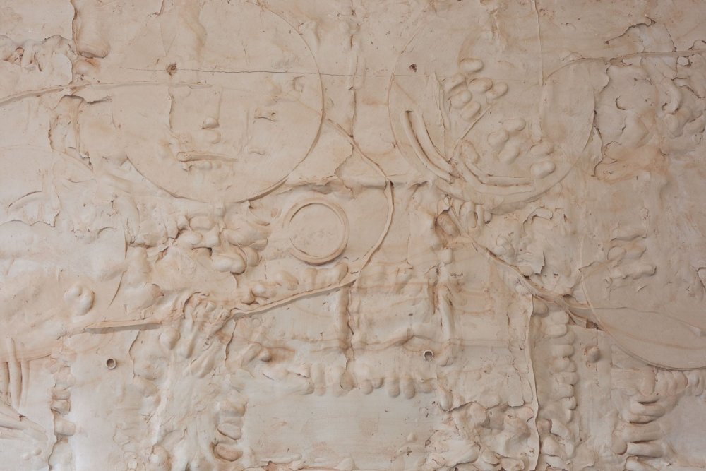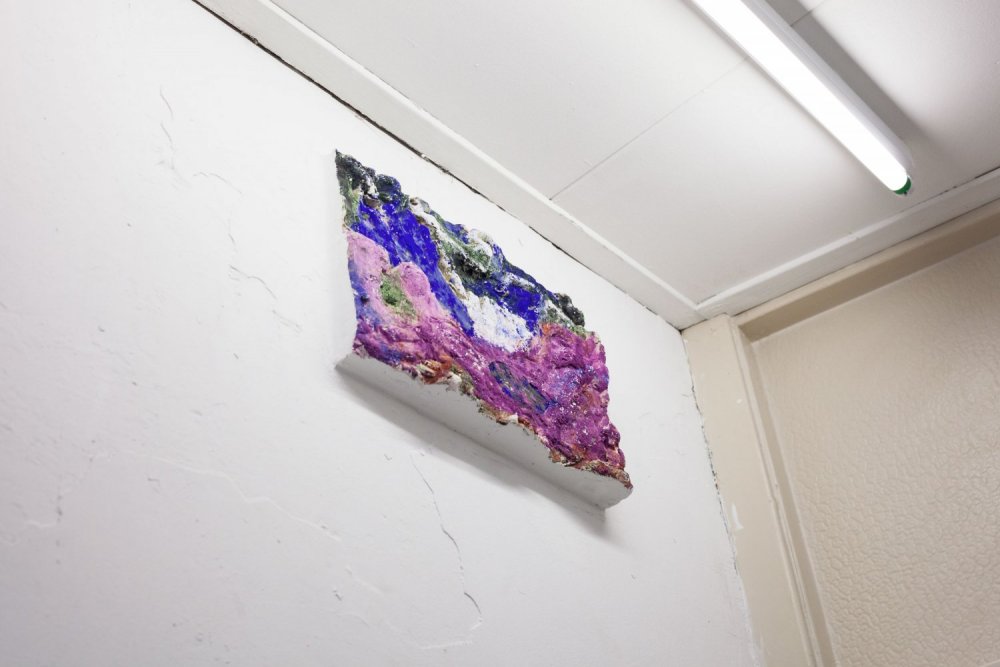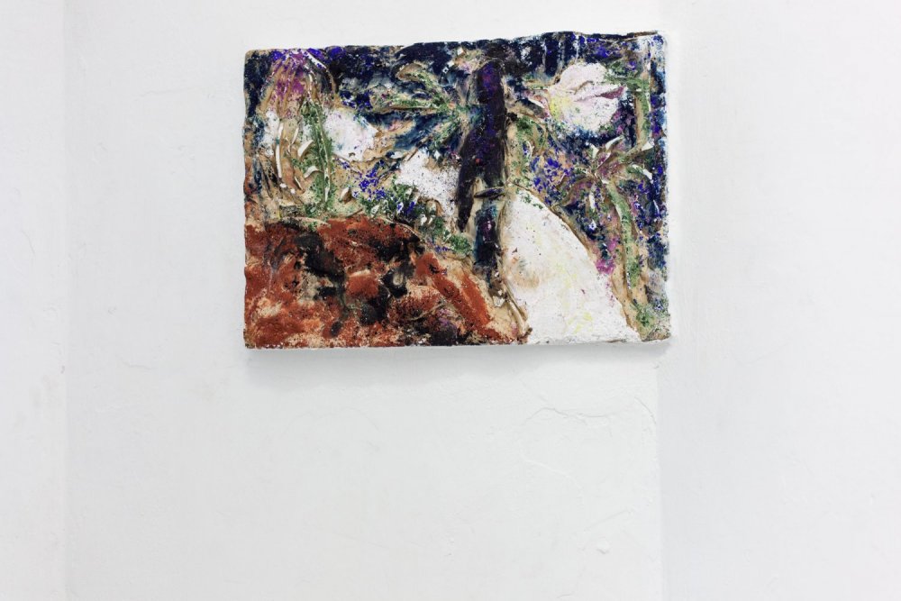 The majority of the works are made from plaster, hardening a handmade process into a fragile but permanent fixture. A candle is held by a realistic rendition of hands in ‘untitled (hot coffee)’ (2015) which are attached to an anthropomorphised facial shape with a cartoon smile. Three 40x30cm plaster and pigment paintings are hung around the room, resembling an abstract memory of a landscape. Among the tactile works are also assembled objects that could easily have already been a part of the space. ‘Metropole Metropole’ (2015) is a wooden shelf holding a functional coffee set for whomever may be passing by and viewing the work.